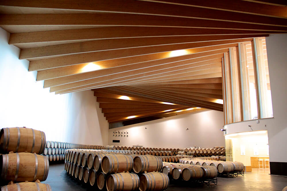 The roof is composed as a series of laminated wooden beams and supported on the staggered sinusoidal cornice of the lateral walls. It is treated as a continuation of the facades. That gives the result of a ruled surface wave that combines concave and convex surfaces as it evolves along the longitudinal axis. In the center of the building the roof protrudes in a continuous volume over the Visitors Center that is conceived as a balcony overlooking the winery and the vineyards. The vineyards can be accessed by granite bridge across the pools.