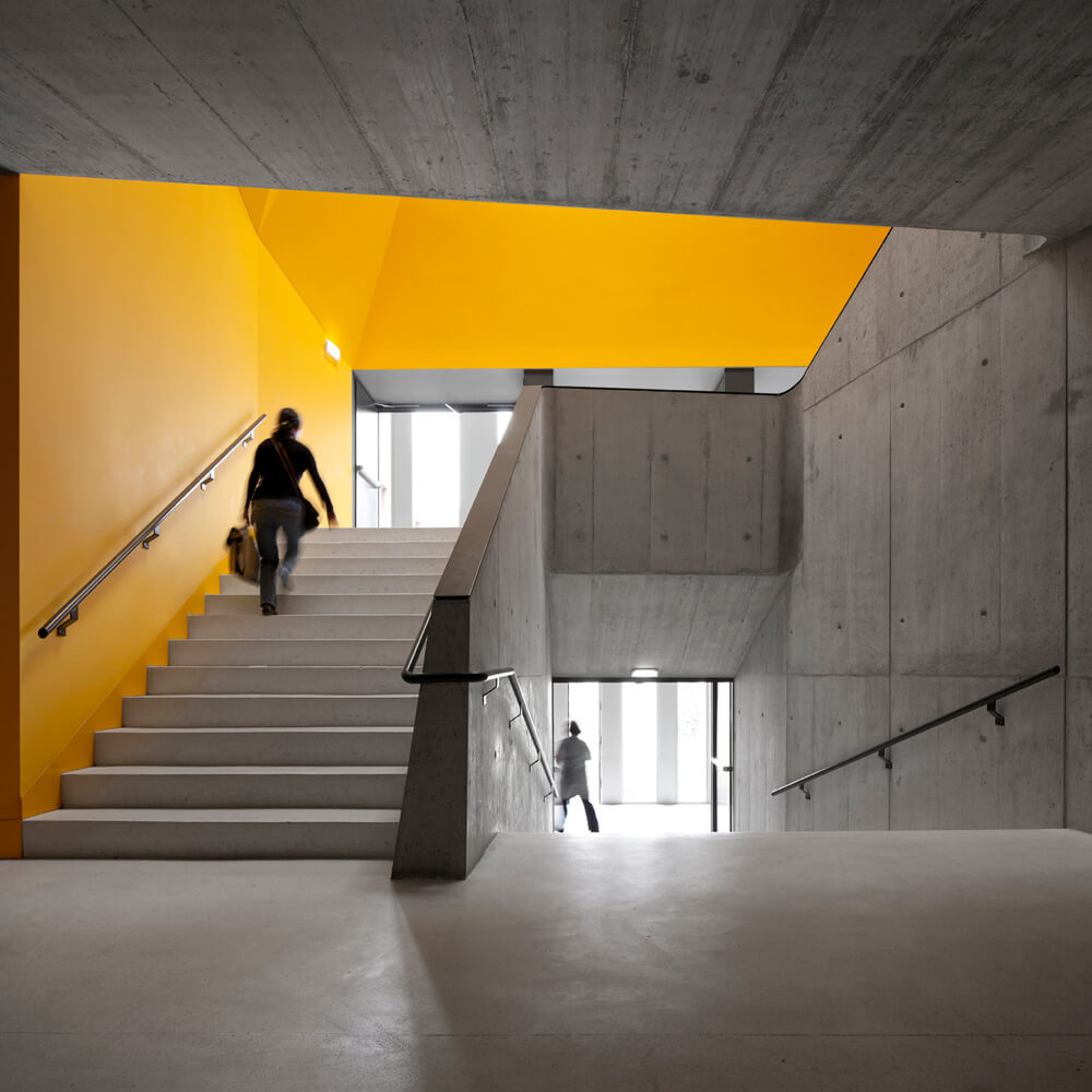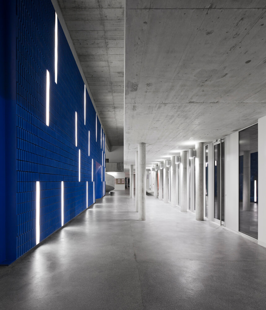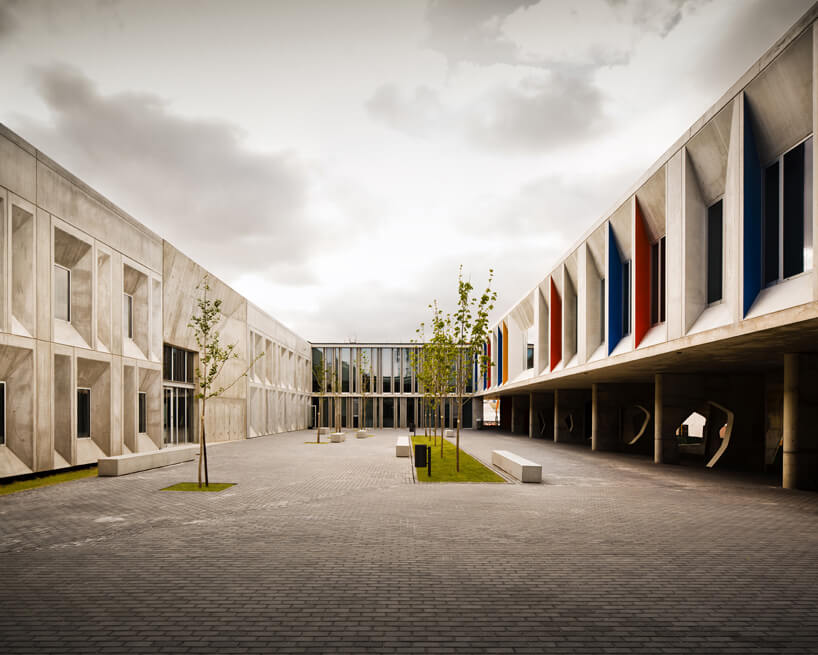 The facades of the school are essentially constituted in exposed in situ concrete and prefabricated concrete elements, to minimize maintenance costs. The concrete panels were carefully designed to respond adequately to each façade’s solar orientation.