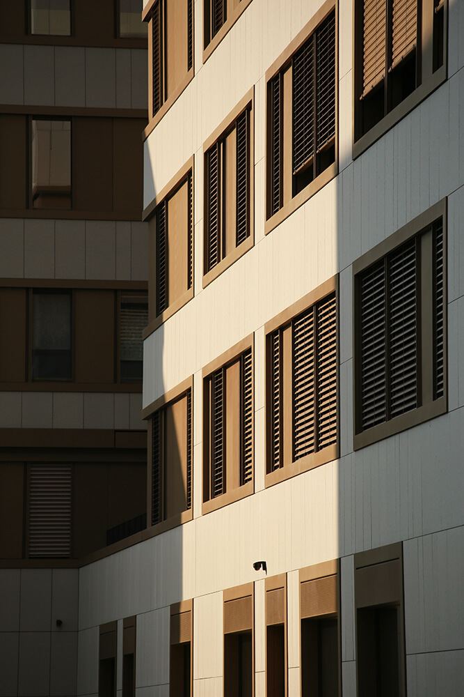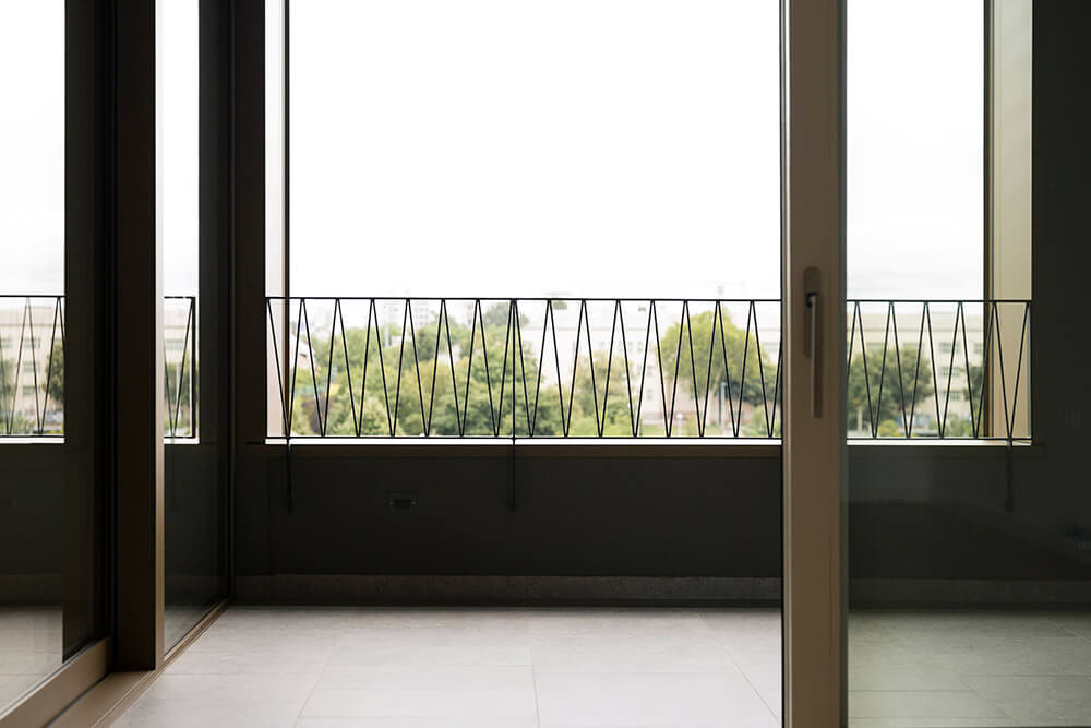 Large window openings positioned within emphasized frames are the key feature of the facade design. The idea behind these large openings that combine windows, balconies and loggias was to create interiors flooded with natural light that provide beautiful views. Only two materials, aluminium window frames and ceramic tiles are featured in the facade, reinforcing the purity of the structure’s form.