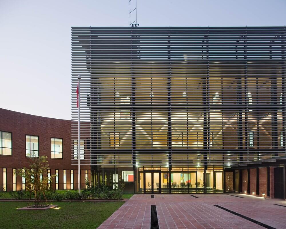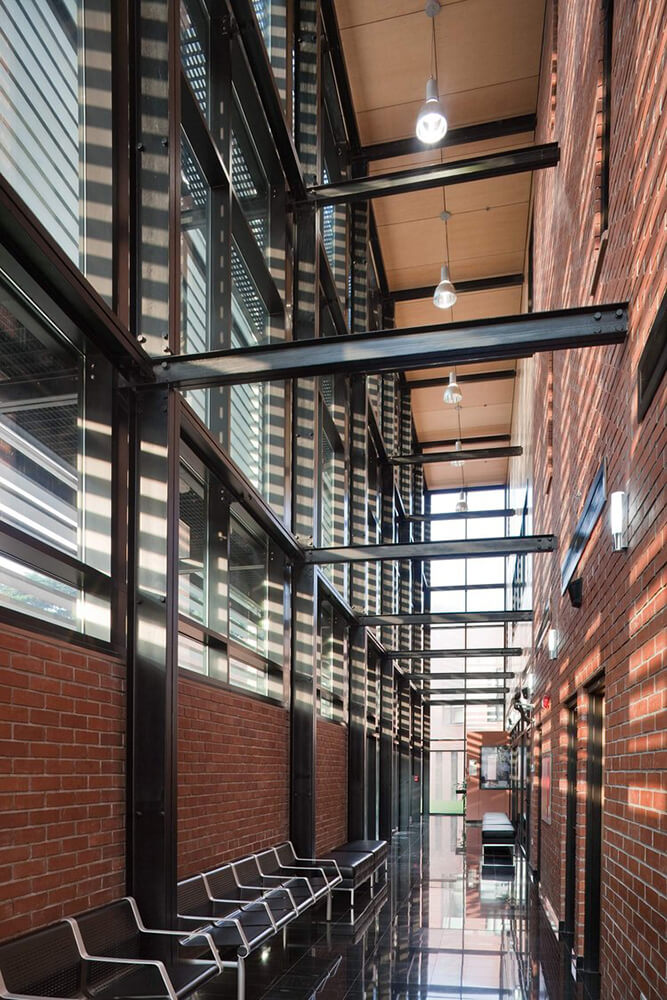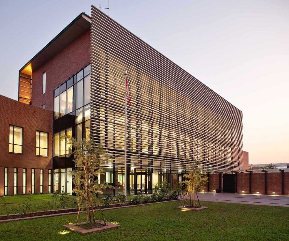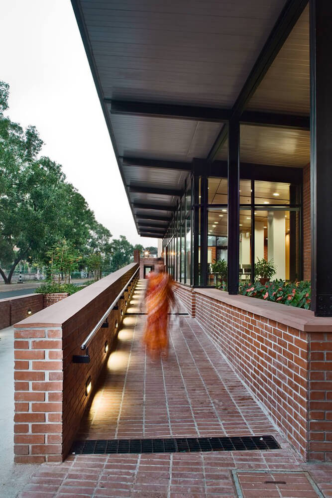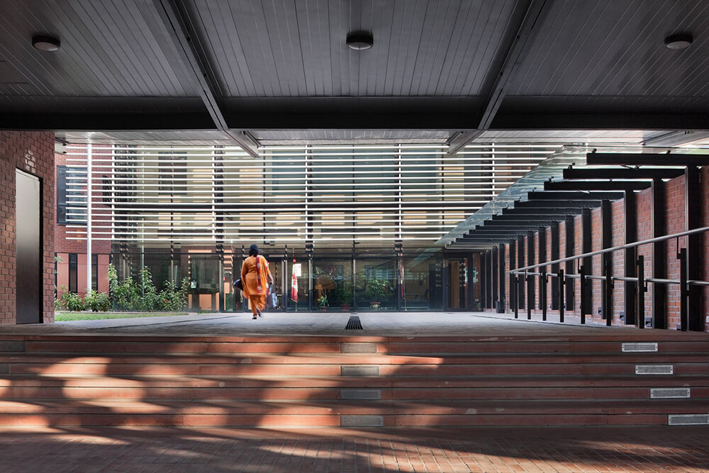 The Ganges Delta has two principle resources: alluvial silt and people (bricks and bricklayers). The building’s material palette therefore consists of an elongated brick wall, which wraps the courtyard that is punctuated by a series of folded metal elements. The perimeter brick wall reflects the requirement for security. Three representational ‘public’ rooms are finished in Canadian maple. Four metal canopies signify entry; welcoming visitors and protecting them from torrential rains.