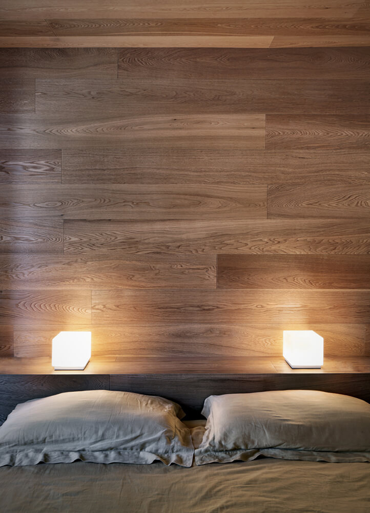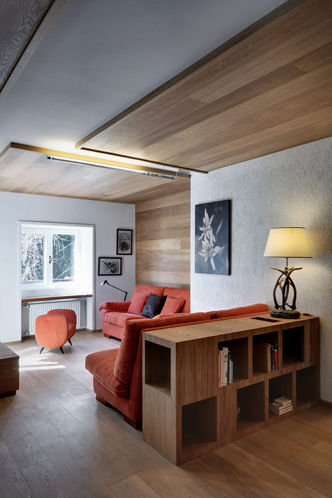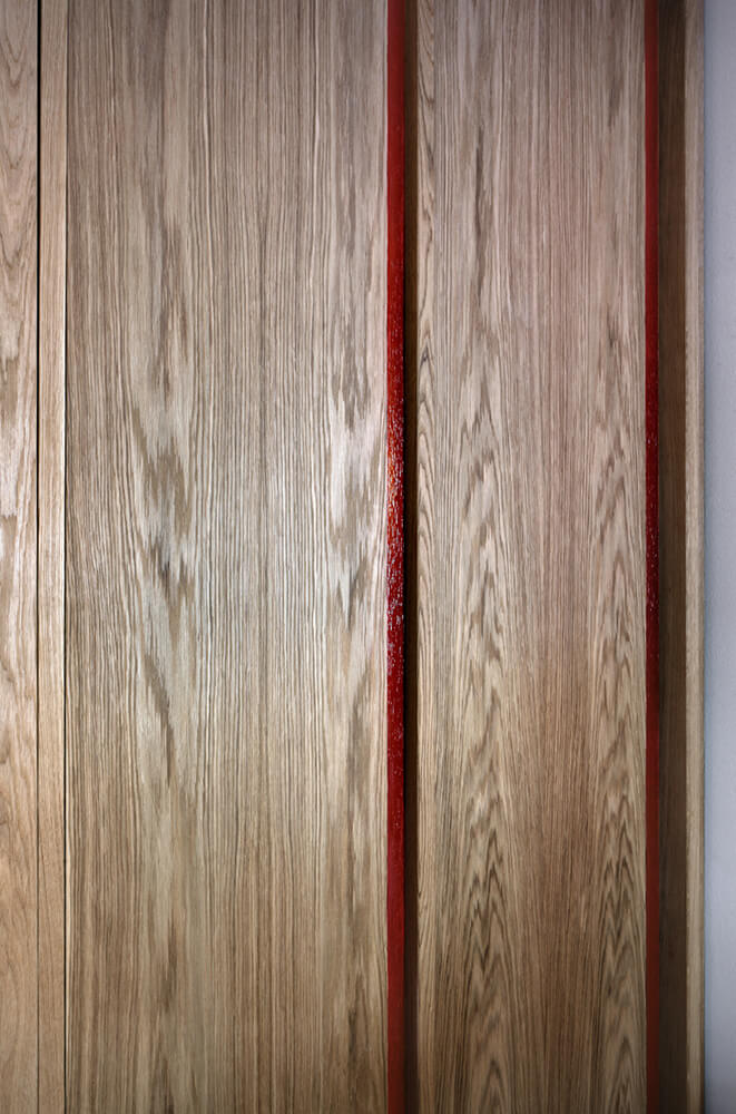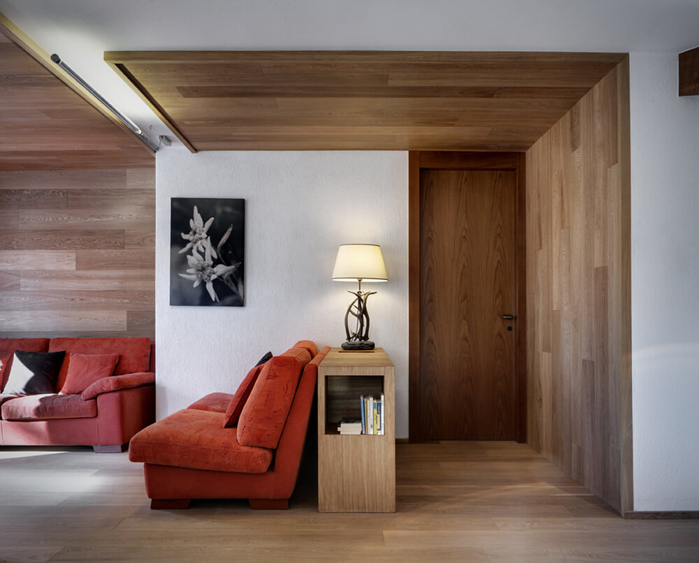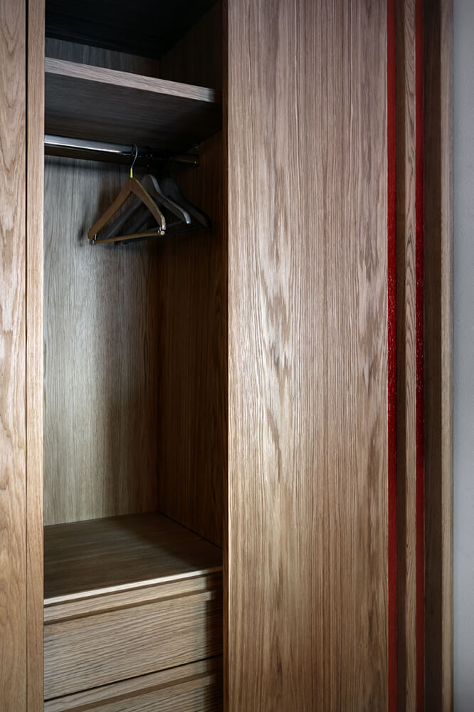 The new floor, made with oak boards, becomes the form generative element. It goes up on walls, folds itself and fills some parts of ceiling. New geometries, in an almost independent form, redefine the perception of interior spaces. A new element, the red color, is introduced as a clue, as a bond. Hollow parts of furniture or colored bands in movement on the wardrobe door, become direct connection element with exterior.