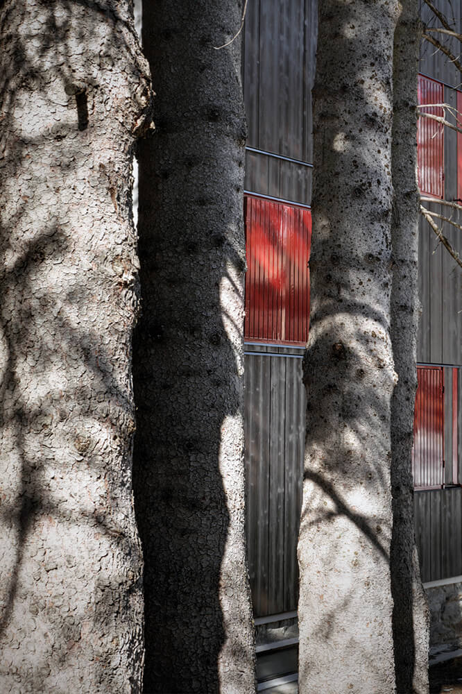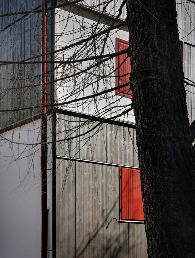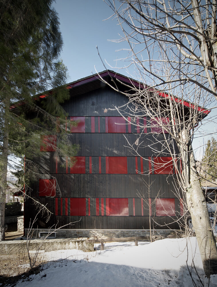 The east façade, all wooden, with a regular scansion of windows, is resolved enlarging, over the usual measure, the red color.