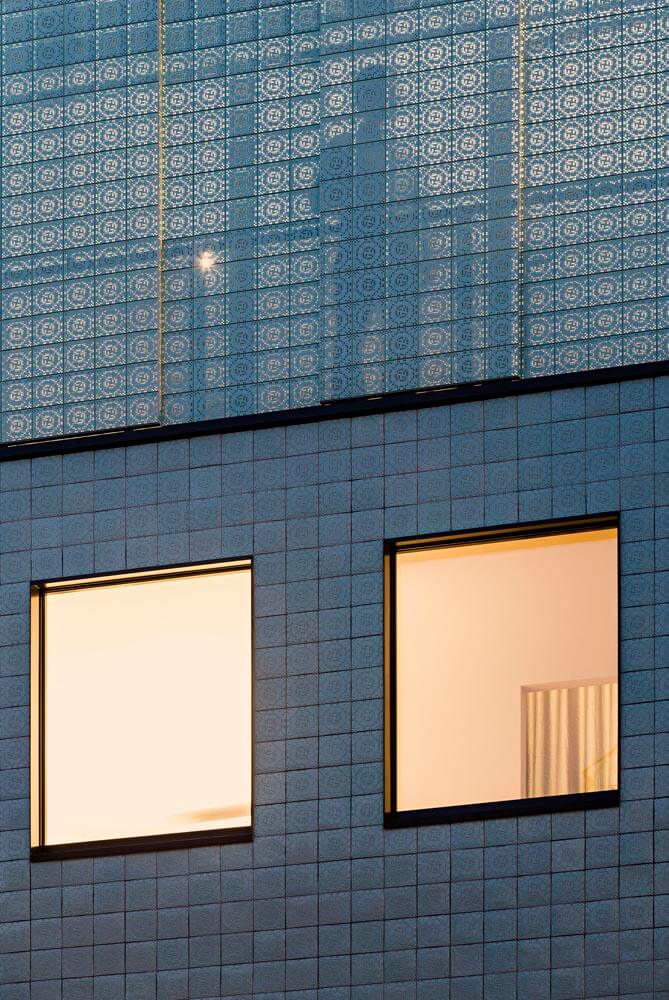 The building’s skin is a contemporary approach to the tiles covering the former building, which was in advanced state of decay. We defined a set of abstract rules to transform the original tile’s motif in an abstract pattern, embodied in 3 distinct media: a flat-tile base, a bas-relief-tile body and a perforated-steel, light-permeable, entablature.