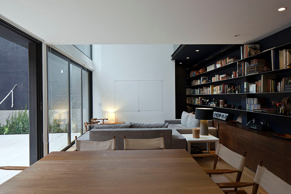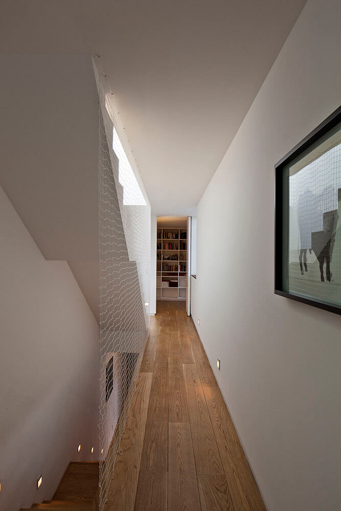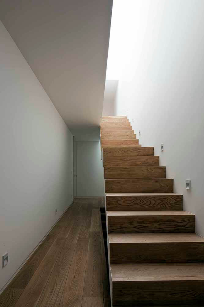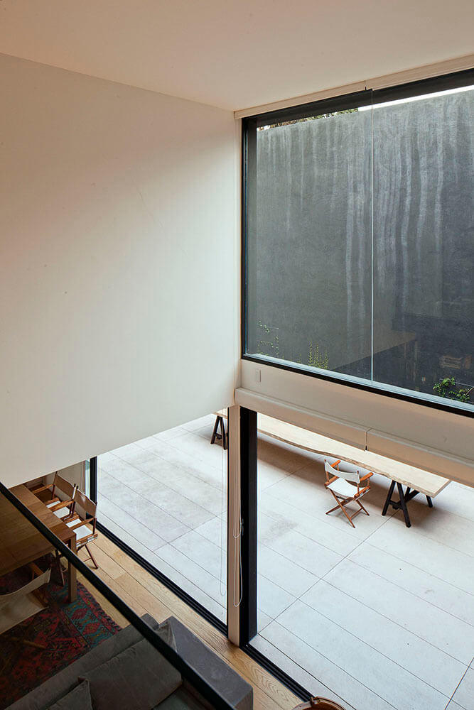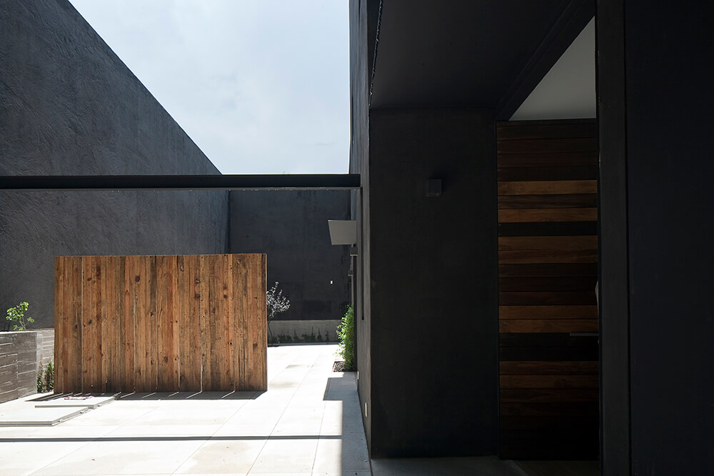 The counterpart of the transparent façade is a solid wall with the same height that contains the open space. This helps close the visibility towards the neighbors, giving privacy to the house.