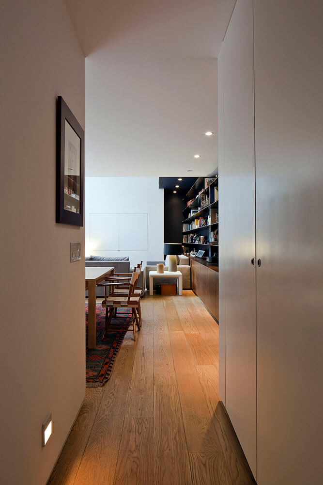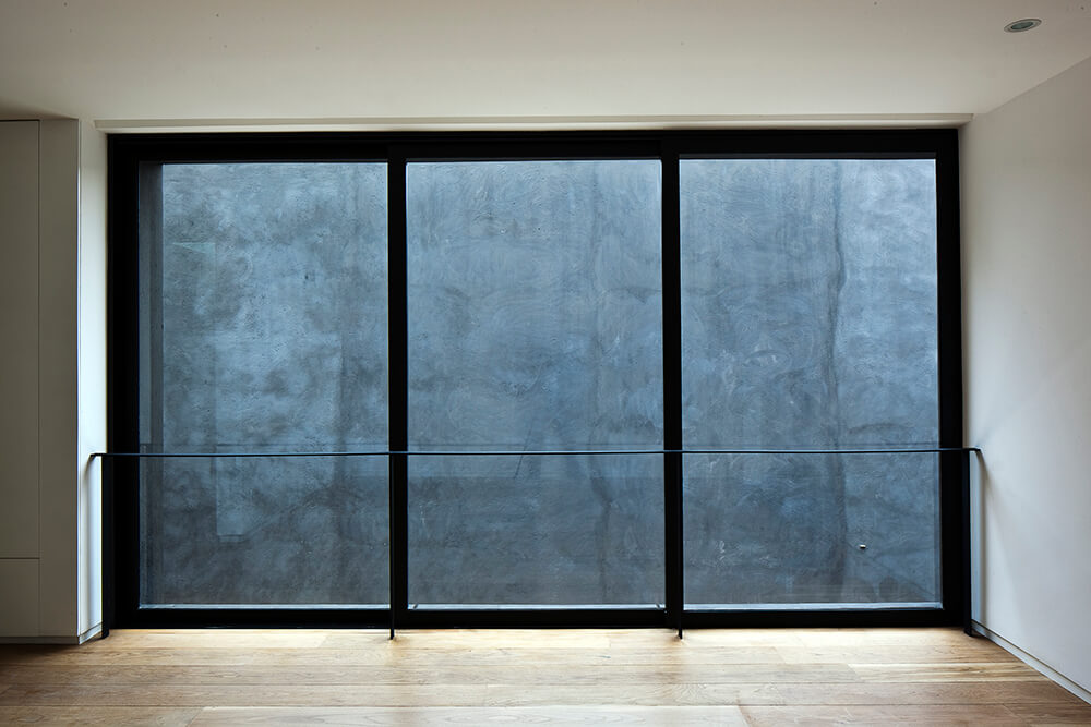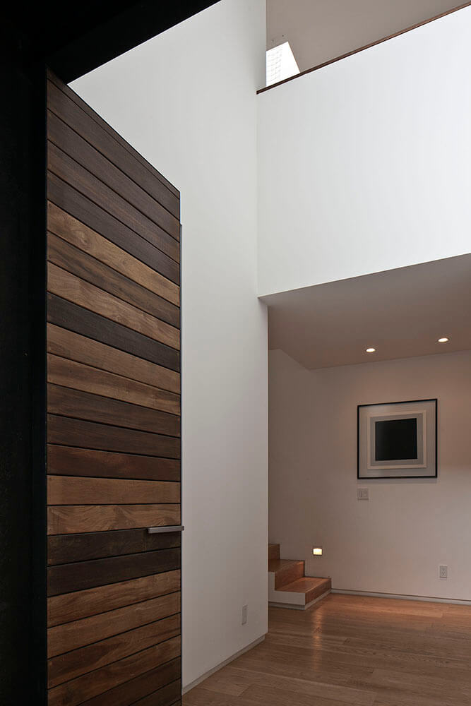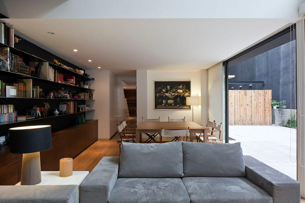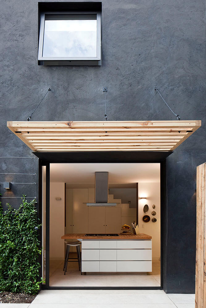The counterpart of the transparent façade is a solid wall with the same height that contains the open space. This helps close the visibility towards the neighbors, giving privacy to the house.