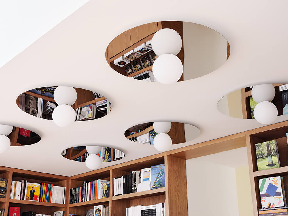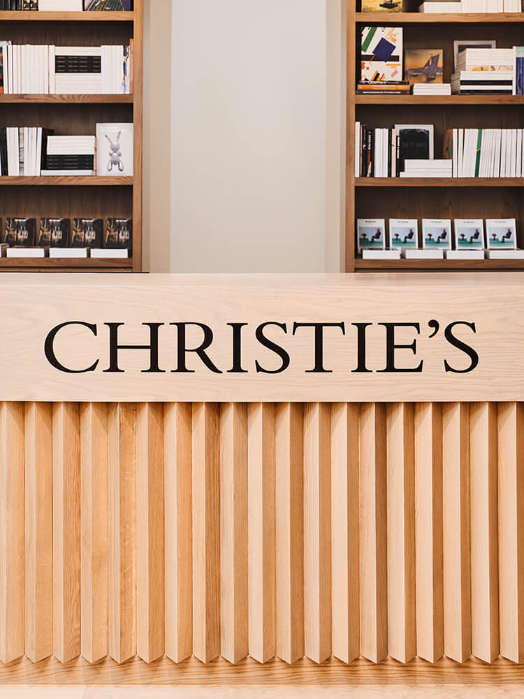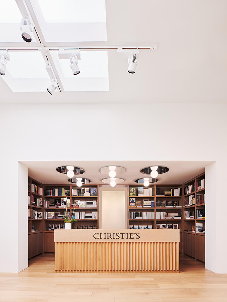 Upon entering the fifth floor/penthouse space, visitors are greeted by a library and reception area constructed from natural white oak with full-height bookshelves displaying Christie’s catalogues alongside monographs of artists and collections. The crenellated triangular woodwork on the front of the reception desk is inspired by the Art Deco towers of the Golden Gate Bridge, while the grouping of round mirrored lights above is an homage to Marcel Breuer’s Whitney Museum in New York.