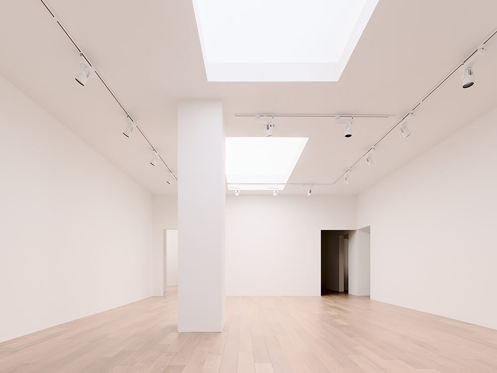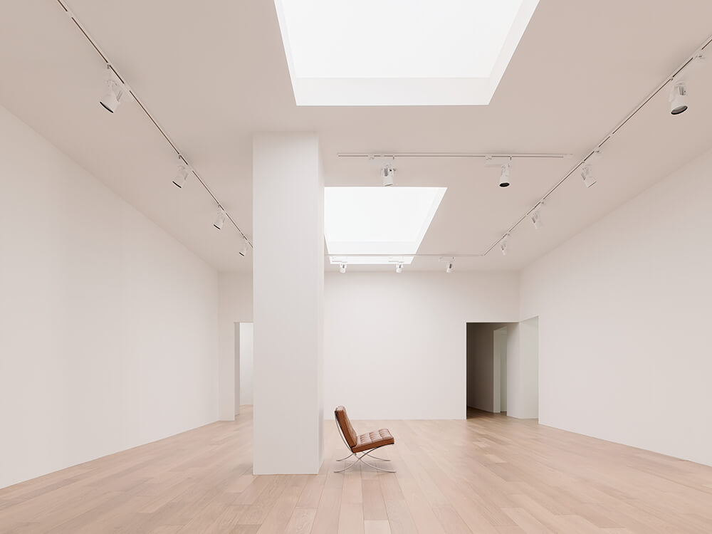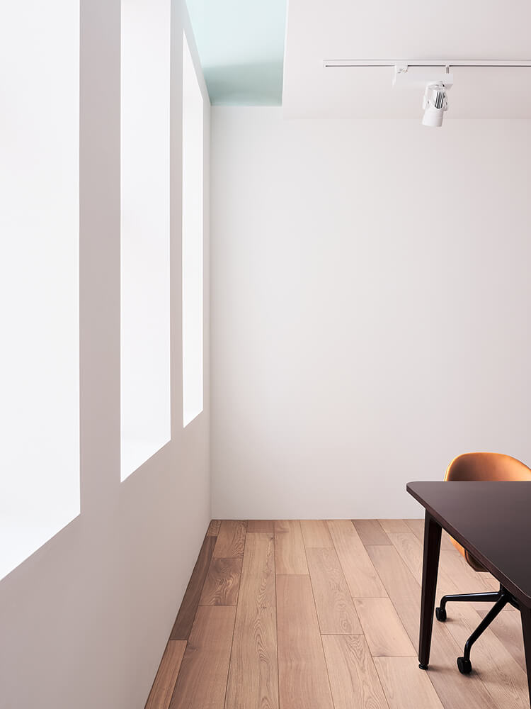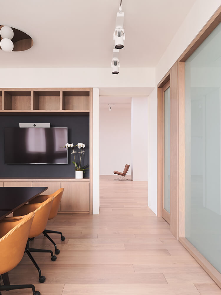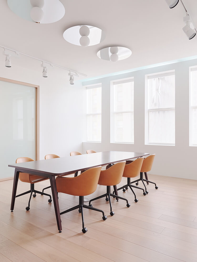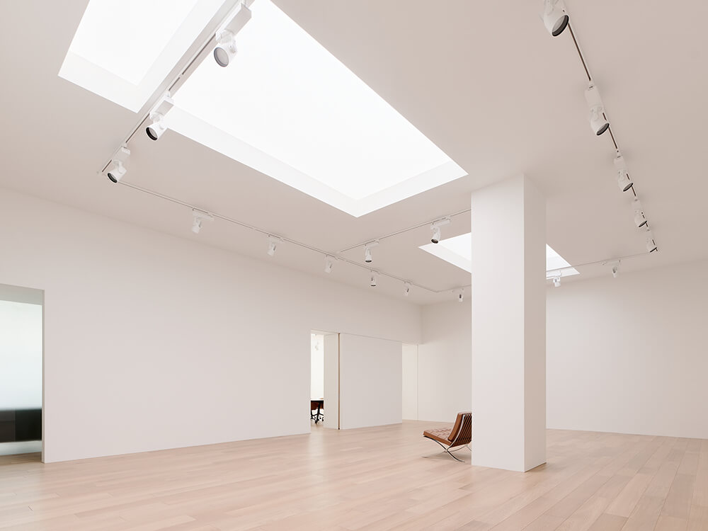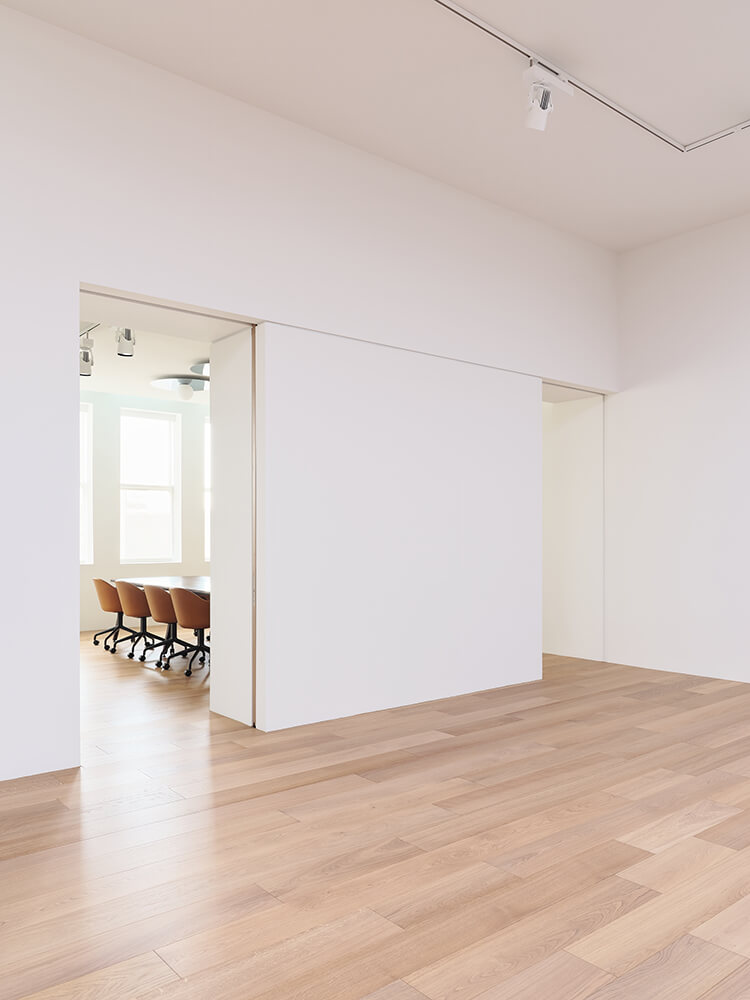 In the main gallery, two large skylights covered in a protective scrim flood the space with natural light, which draws visitors into the space. Anchored by an oversized central column, the space is flexible for various formats of work shown by Christie’s. Located just off of the main gallery, the south-facing boardroom overlooks bustling Market Street five stories below. A white oak cabinet with acoustic fabric backing allows Christie’s team to conduct state-of-the-art video conferences with clients and colleagues across the globe.