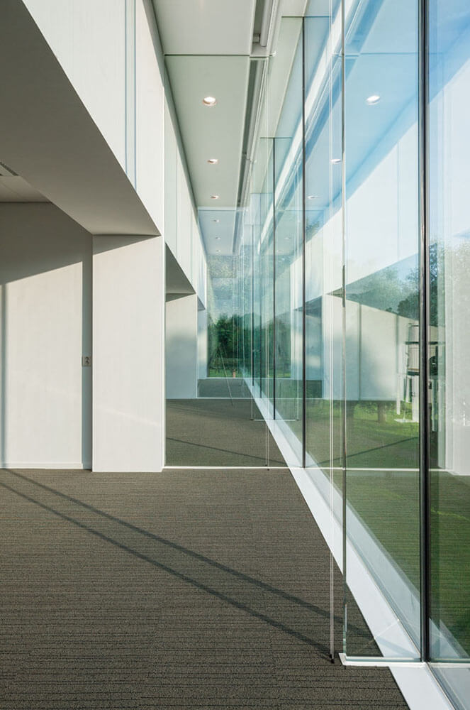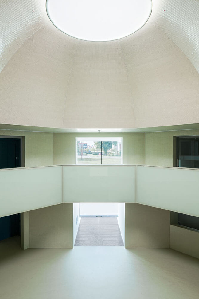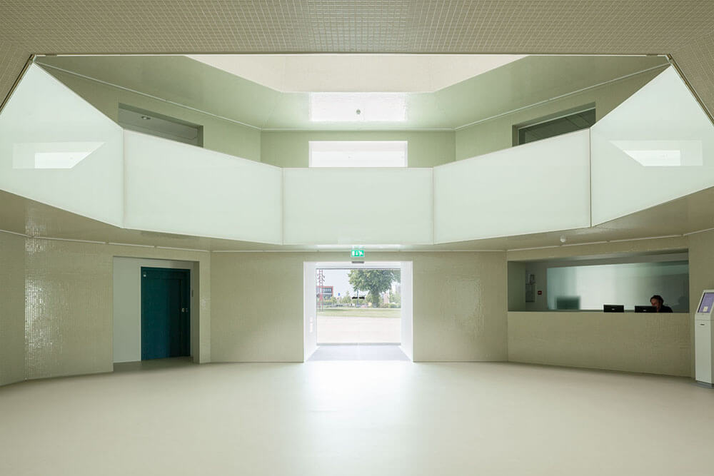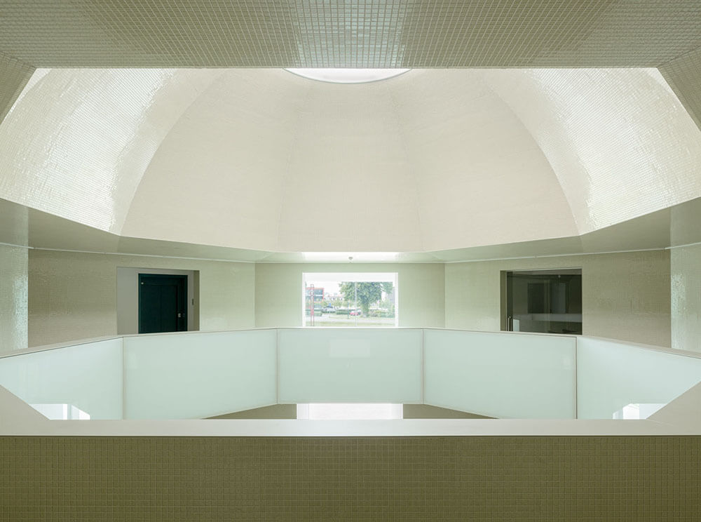 Regarding the interior, several steps were taken to improve the atmosphere and working conditions of the town hall. In particular, the two- floor high entrance hall turned out to be challenging. Since the existing geometry was unclear and the client wanted a more modern appearance, the architects decided to fundamentally reorganize the hall. The entrance hall was strategically downsized and organized in an octagonal shape, which was the result of the existing octagon-shape floor opening in the first floor. Within this new structure, it was also possible to create new meeting rooms and a separable reception area around the hall. The new ceiling was developed as a dome, again as a result of the existing octagon. In order to create a fluent experience between interior and exterior, the entrance hall was as well materialized from glass mosaic tiles, this time in a light – reflecting mint-green colour. The hall is illuminated by a circular skylight. The glass balustrades on the first floor are luminaires, which additionally spread light throughout the hall. Generous office landscapes were situated at the three heads of the building. Here, the fully glazed façades offer a panoramic view towards the green surrounding and the landscape of Zeeland.