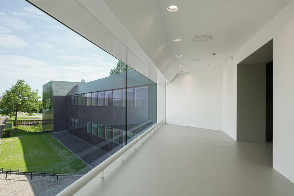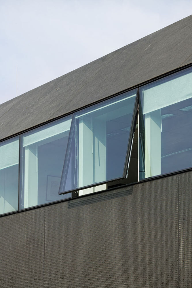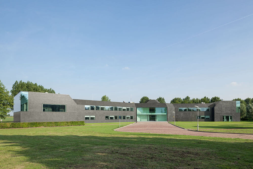 In a second step, the fragmented building shape was tamed and visually integrated by consequently wrapping the façade as well as the roof with one façade material. The new façade consists of glass mosaic tiles, which are glued on mounting plates and placed in front of a new insulation layer on the existing brick walls. The tiles were custom-made in China. Through the process of enameling rich light reflections are created. The black and green colour visually binds the building together and ads to the impression of compactness. At the same time, the colour refers to the tarred barns, which are typical in the Zeeland surrounding.