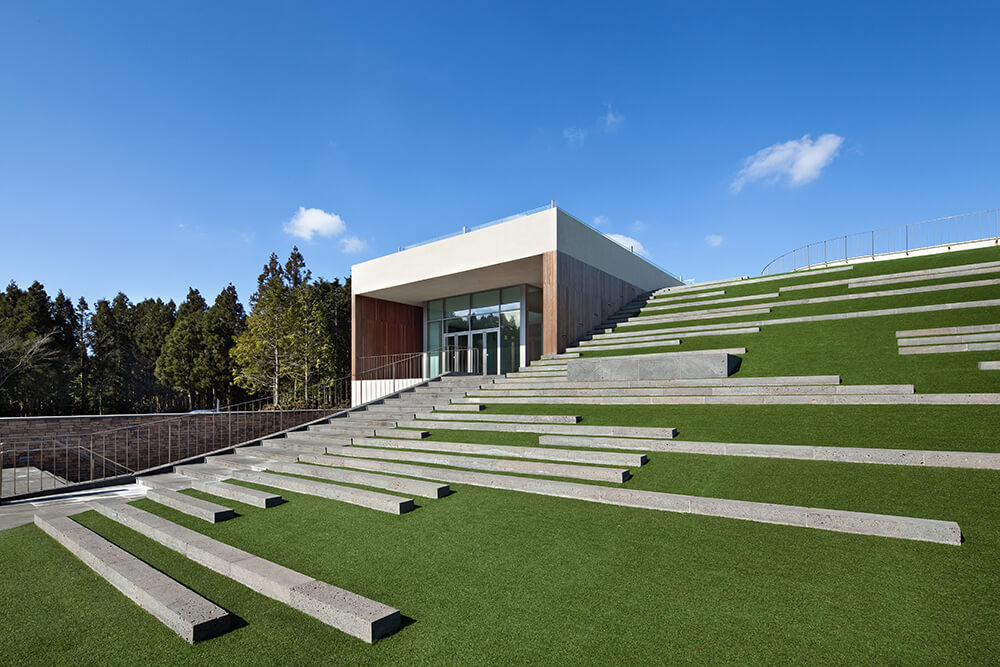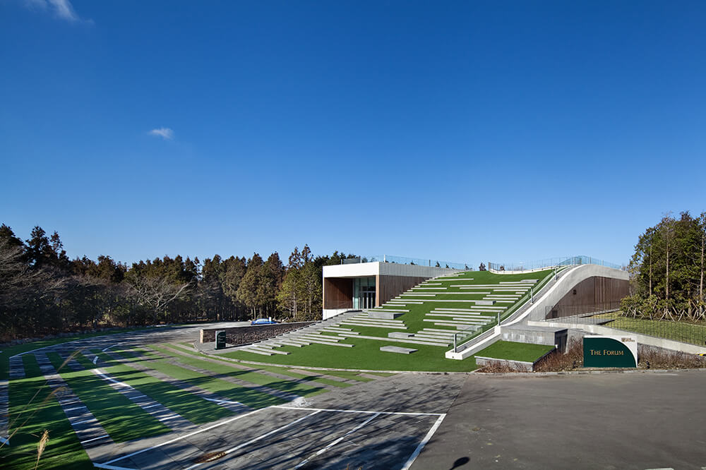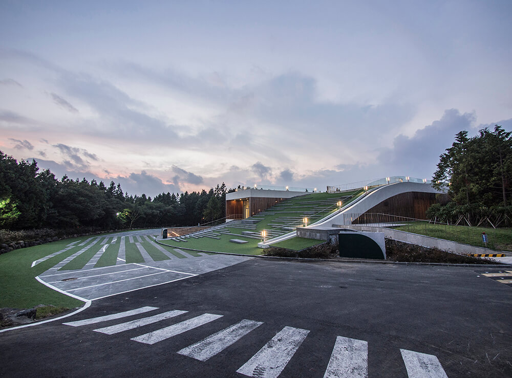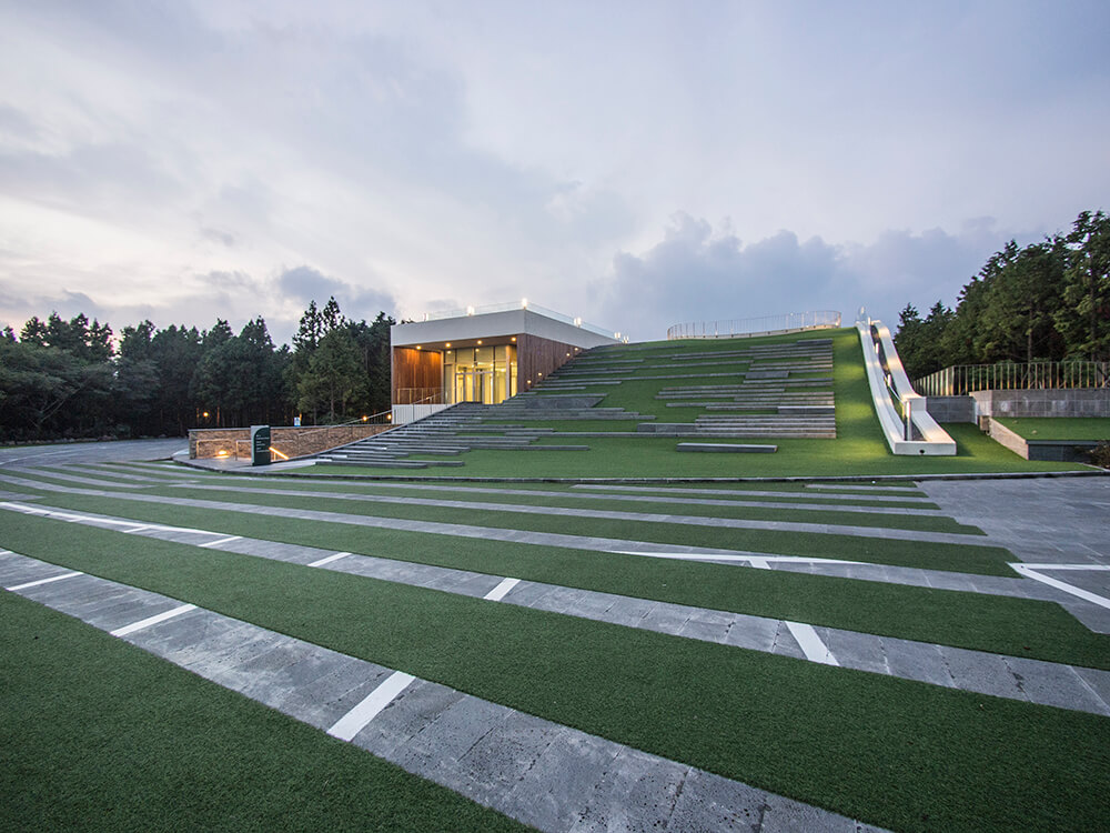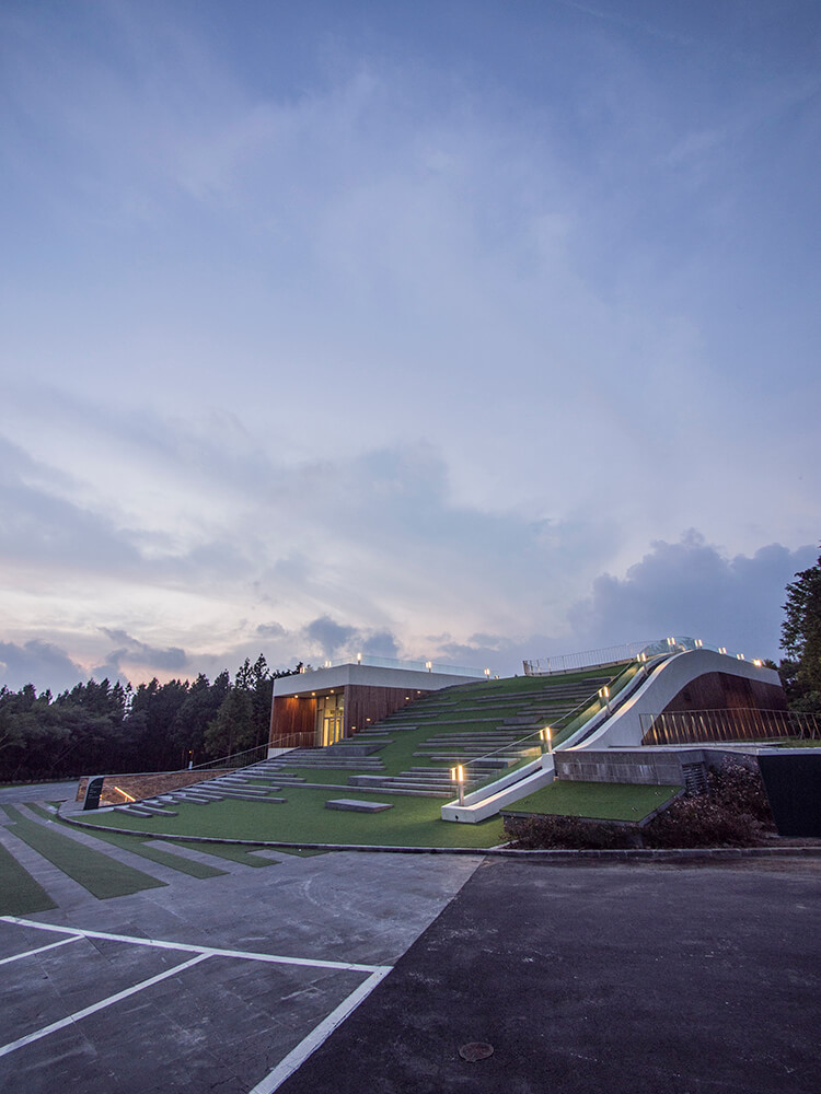 The underground spaces consist of meeting rooms and a multipurpose hall, which can be used as a sports facility to accommodate tennis and basketball matches. The sloping roof garden is accessible from the ground, merging seamlessly with the parking to enable one to walk directly on top of it. The shape of the structure also functions as an amphitheater, as more than 300 people can sit on the integrated stone chairs and grass surface for outdoor performances.