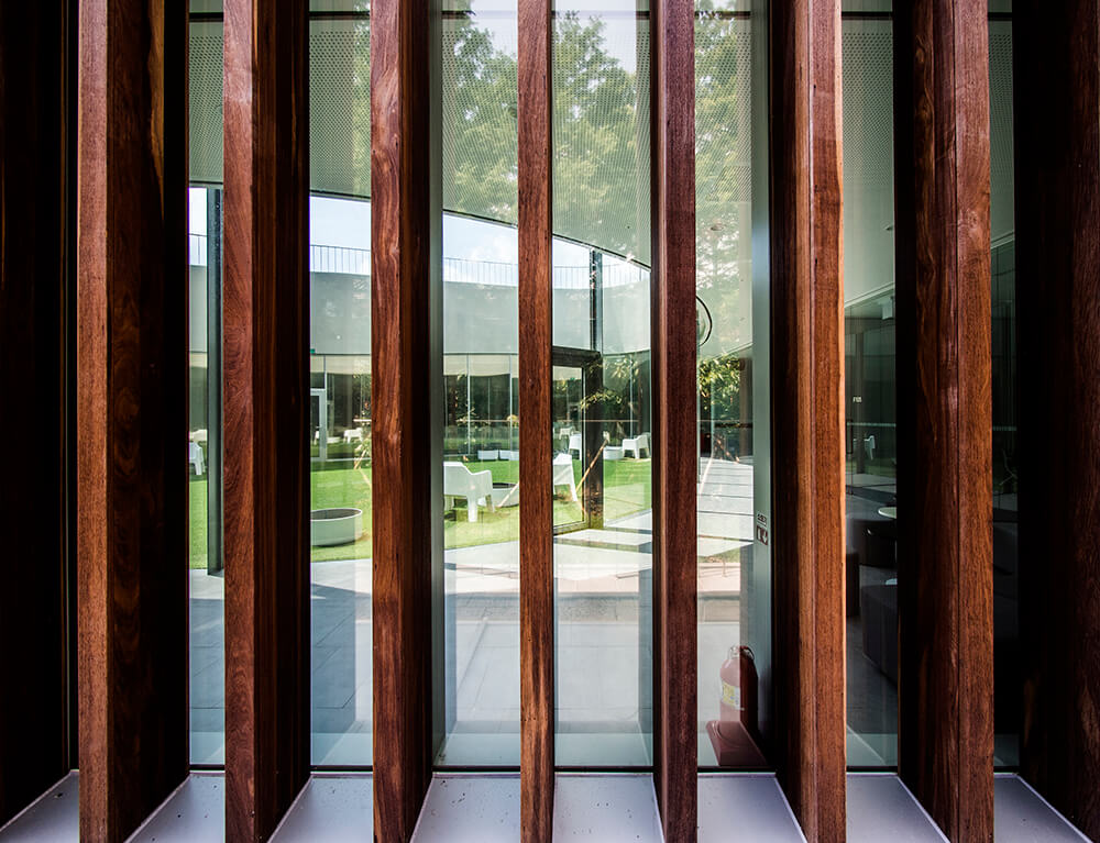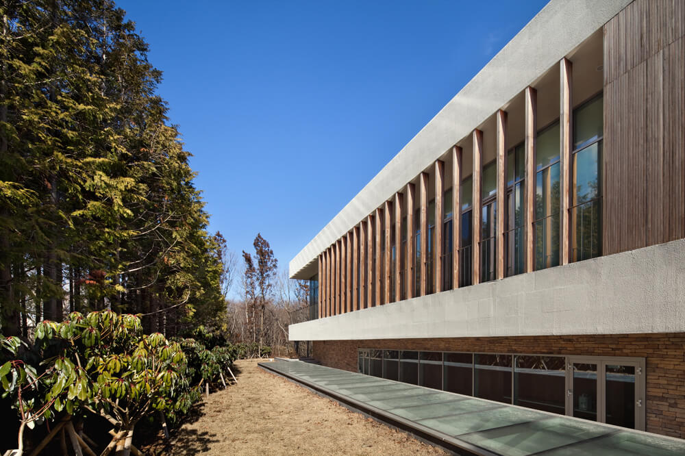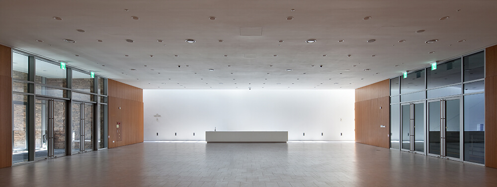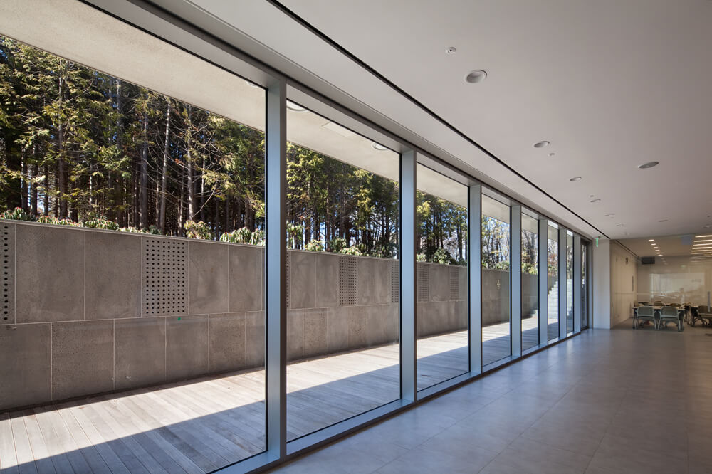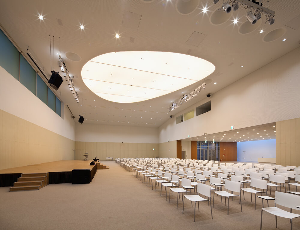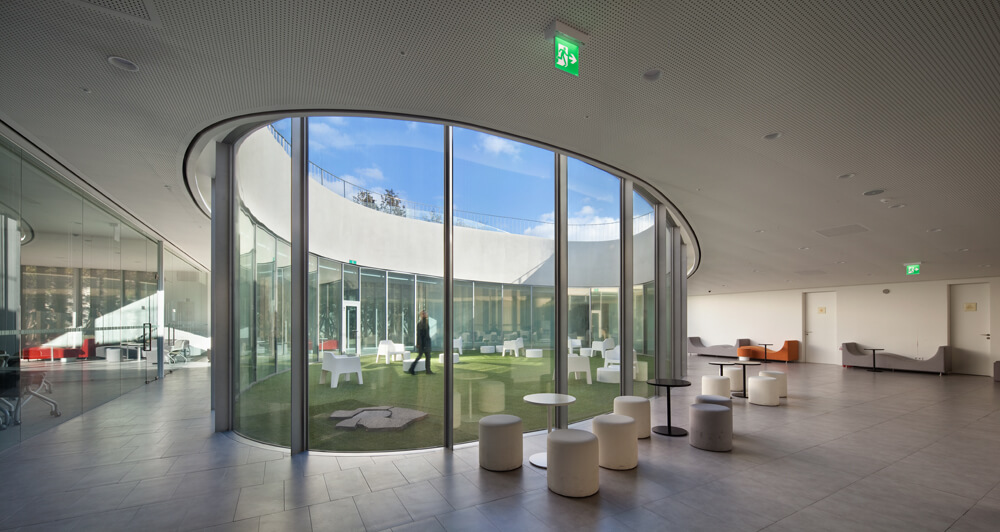 The underground spaces consist of meeting rooms and a multipurpose hall, which can be used as a sports facility to accommodate tennis and basketball matches. The sloping roof garden is accessible from the ground, merging seamlessly with the parking to enable one to walk directly on top of it. The shape of the structure also functions as an amphitheater, as more than 300 people can sit on the integrated stone chairs and grass surface for outdoor performances.