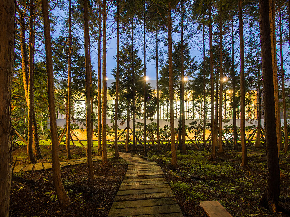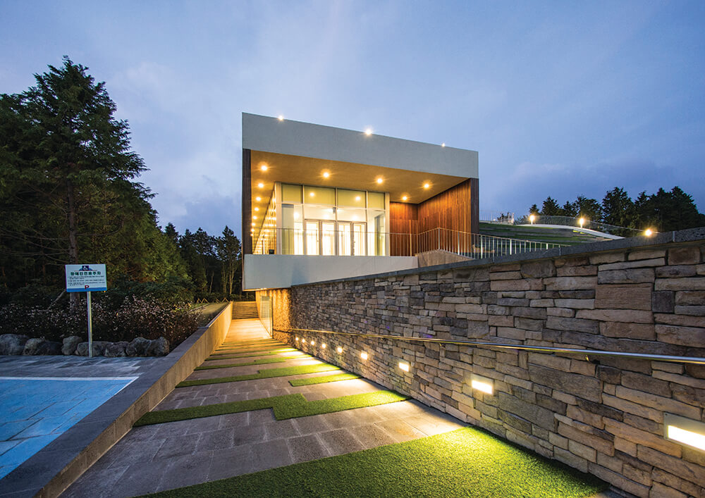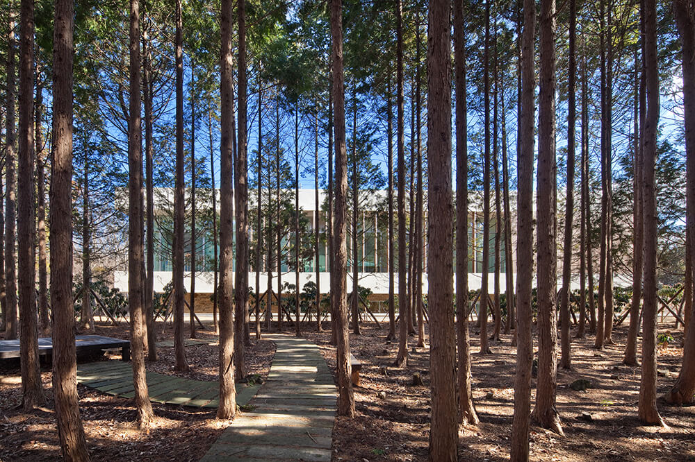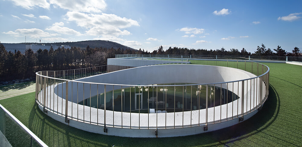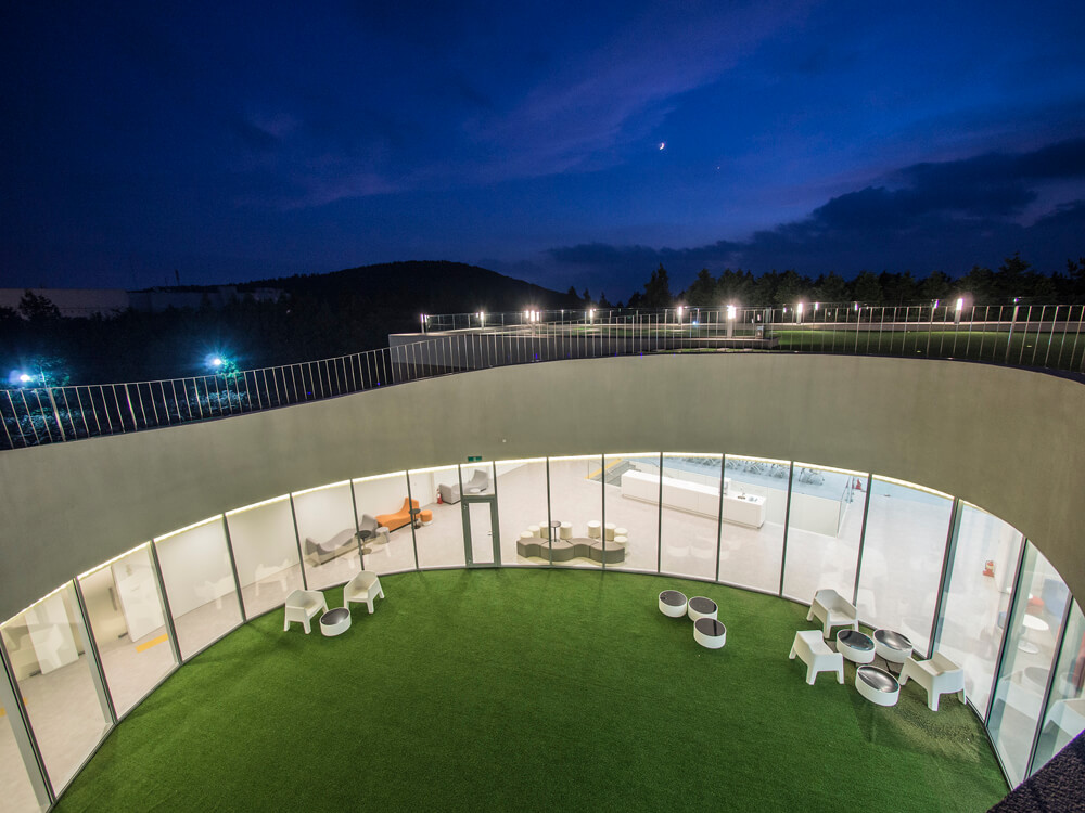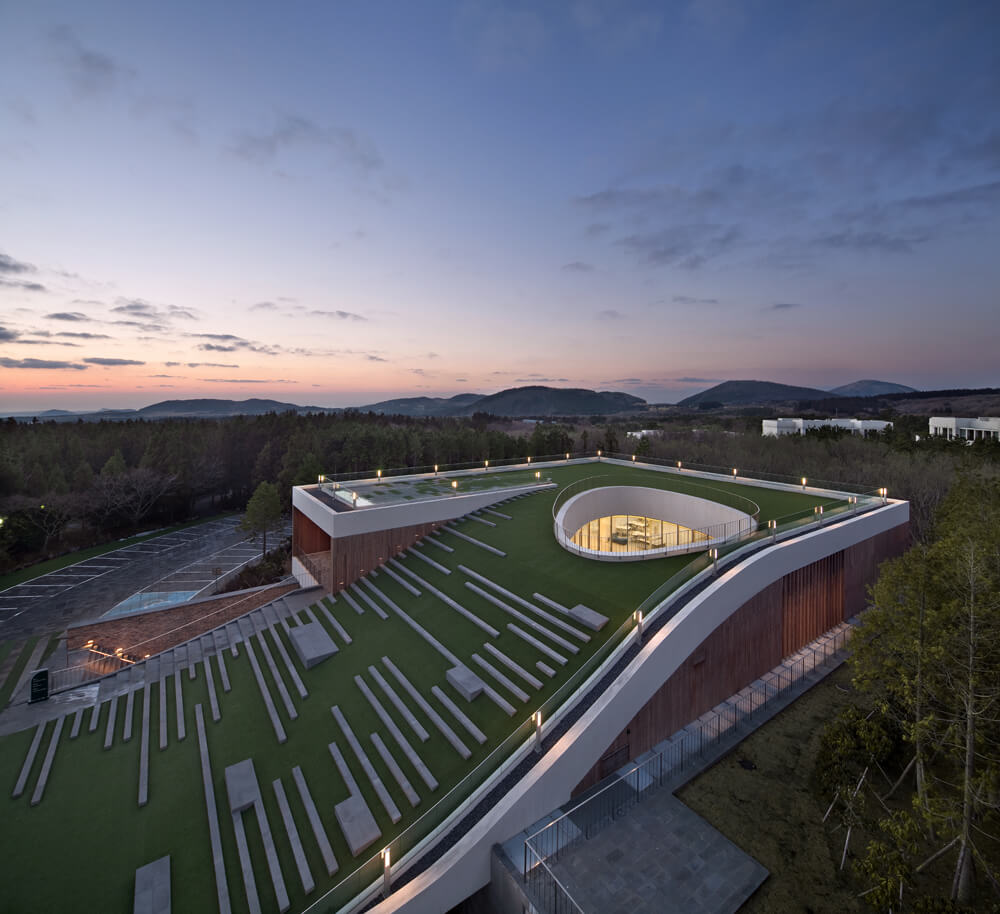 South Korean studio D·LIM architects has completed a multipurpose facility for CJ, one of the country largest companies. Located at the center’s golf club on Jeju island, the subterranean project avoids disrupting views of the surrounding forest and natural landscape. More than half of the volume is dug beneath the ground level, with a large hole subtracted from the roof to filter light through to the spaces below. The circular void is in the shape of the CJ’s official logo, which represents notions of joy – the meeting rooms and workspaces are positioned around this core element to absorb natural daylight and uplifting energy from the sky above.