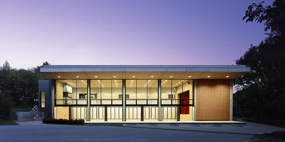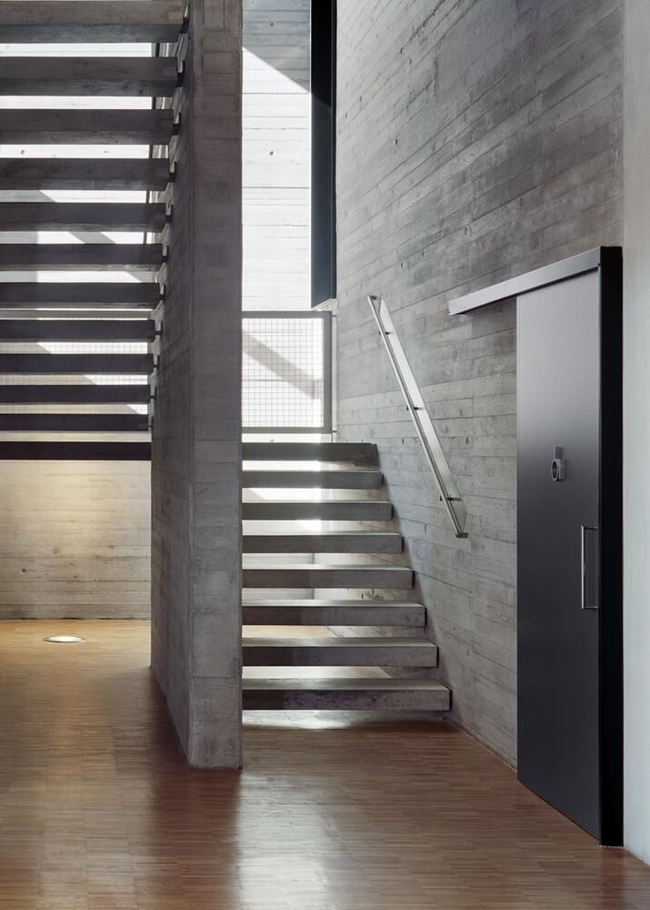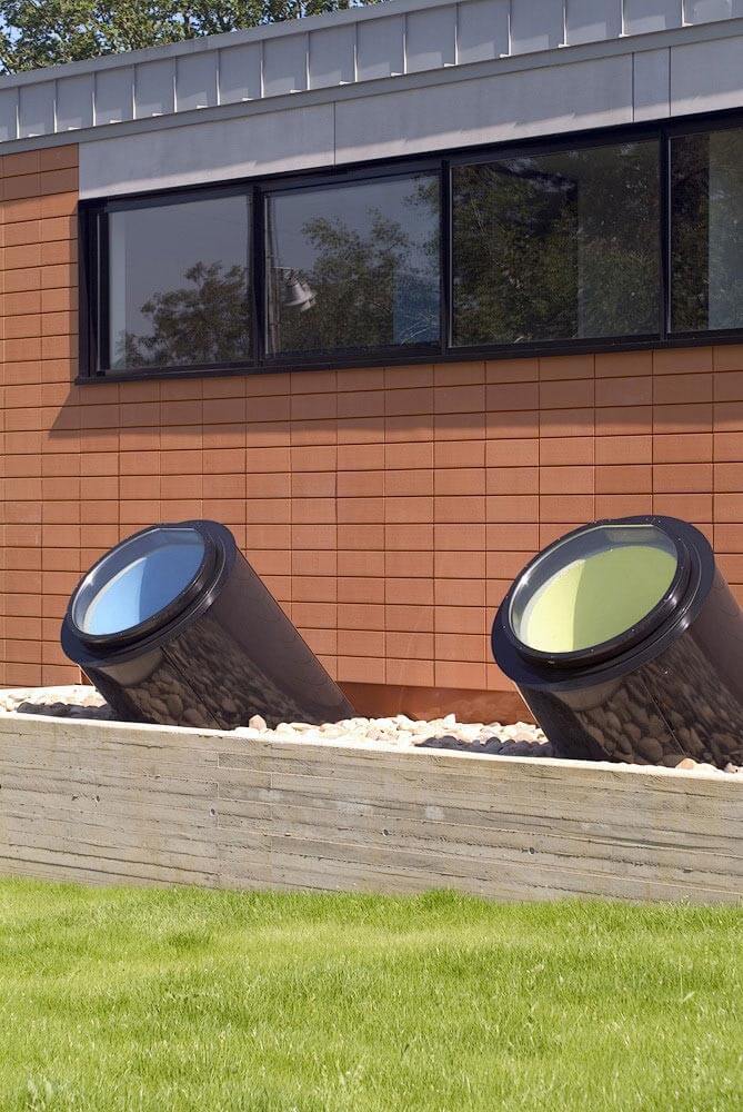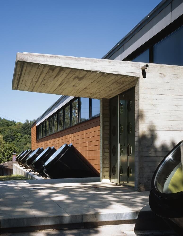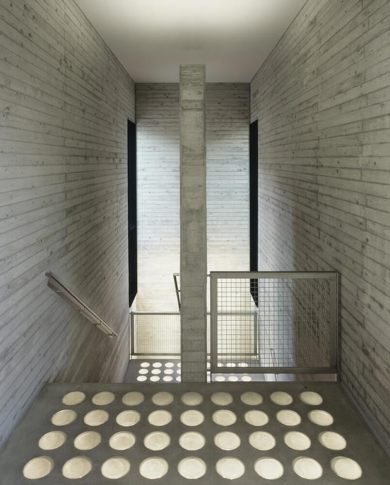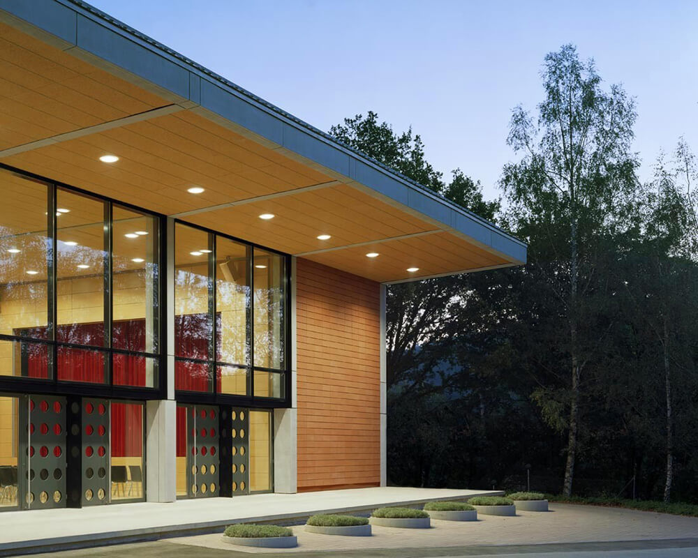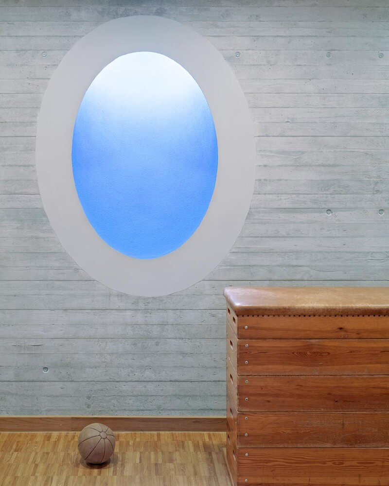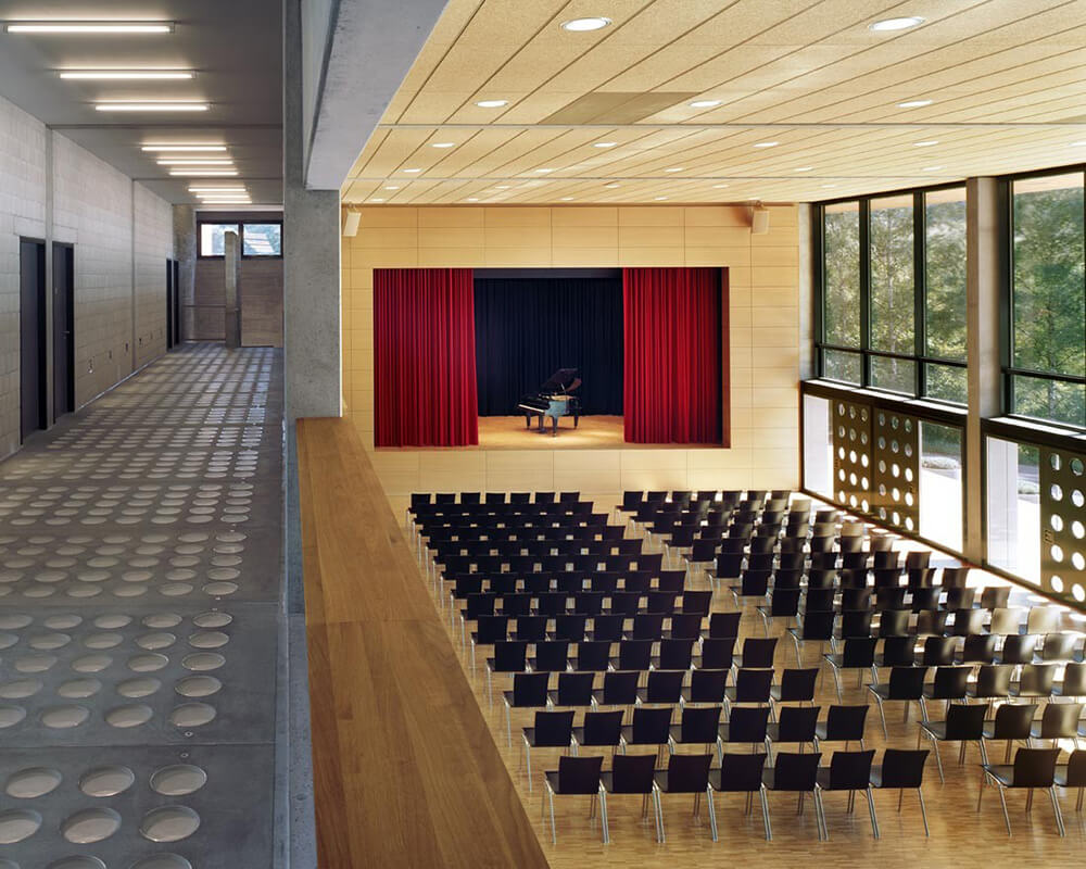 This community centre was built in order to house cultural events in a town with active club membership. The hall can also host sporting events and seasonal festivals. A composite use required flexibility, durability, and safety. Seating 500, the project houses a youth club, offices for local officials, and the town doctor. The space is generated by the sectional resolution of the entrance at street level and the main hall that is four meters below. A broad corridor provides access to public facilities, and provides an overview of activities taking place in the hall. Stairs terminate both ends of this tribune, connecting the upper and lower levels. Beneath the entrance block, one can find food service, storage, green rooms and mechanical areas. These rooms must receive daylight and fresh air by code. Concrete sewer culverts mounted at 45 degrees to the foundation walls fulfill environmental requirements and lend a dramatic character to the streetscape. These light cannons are lit for events, signaling activities to the community.