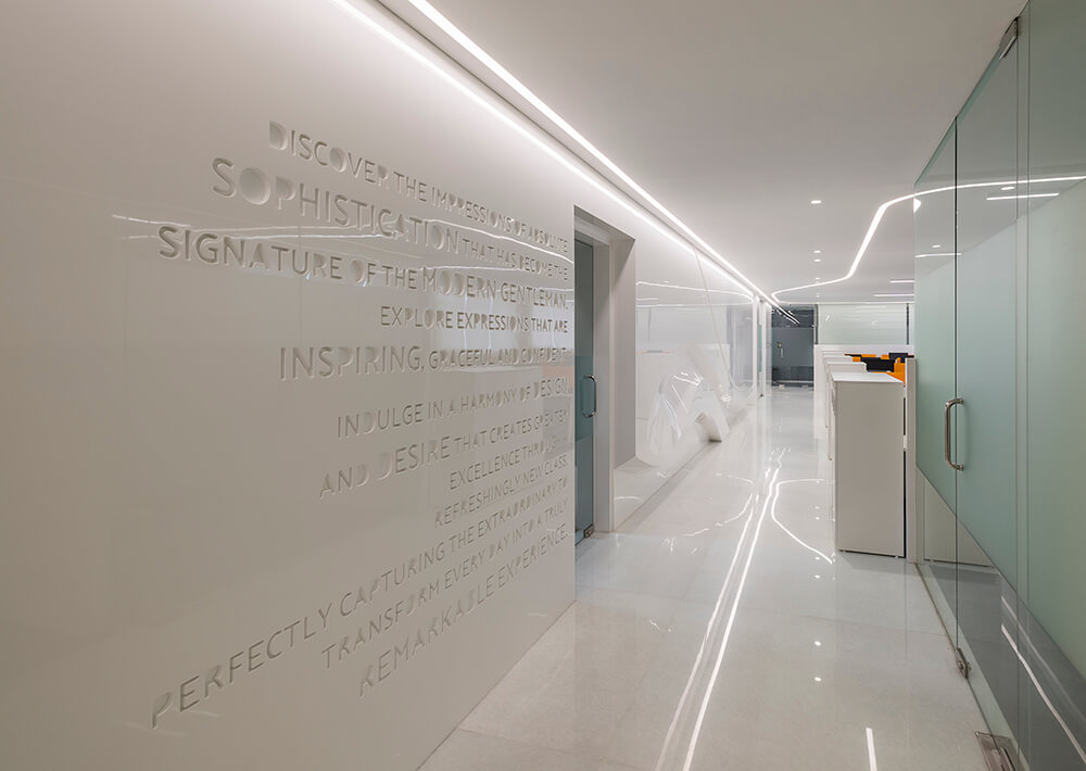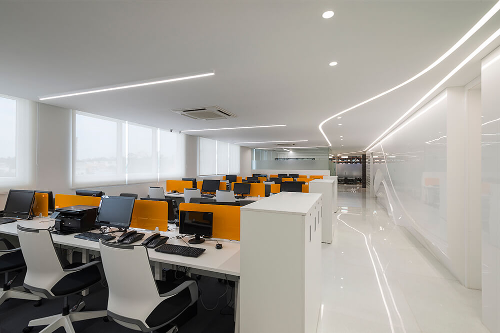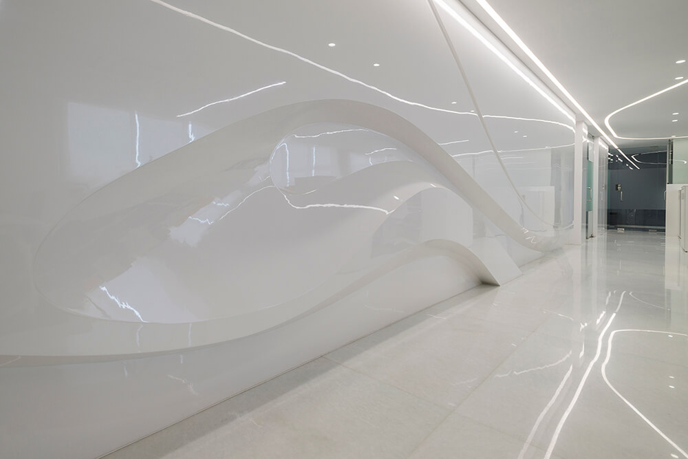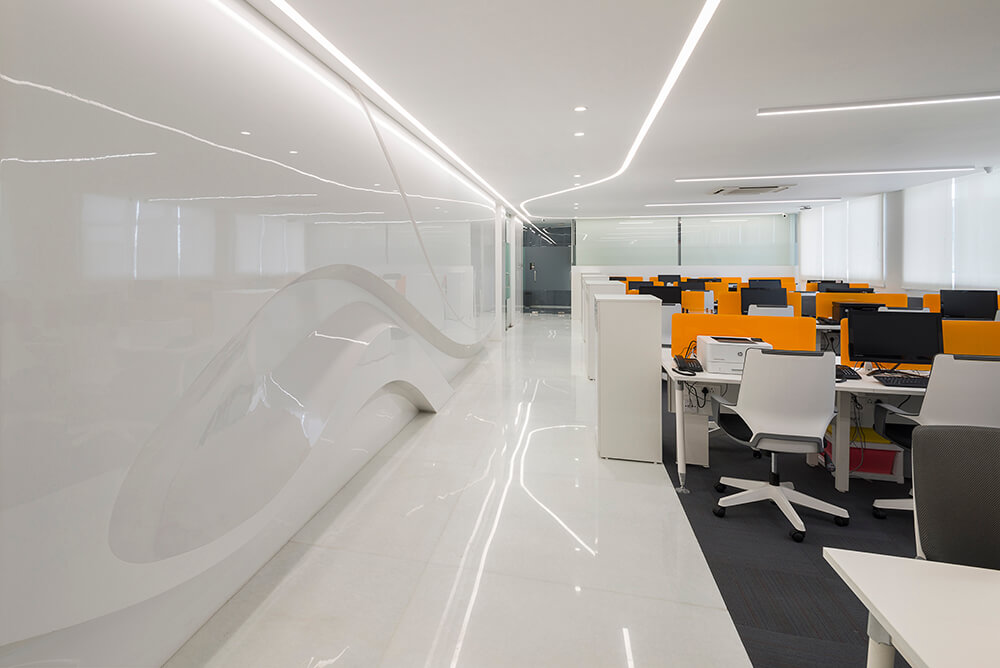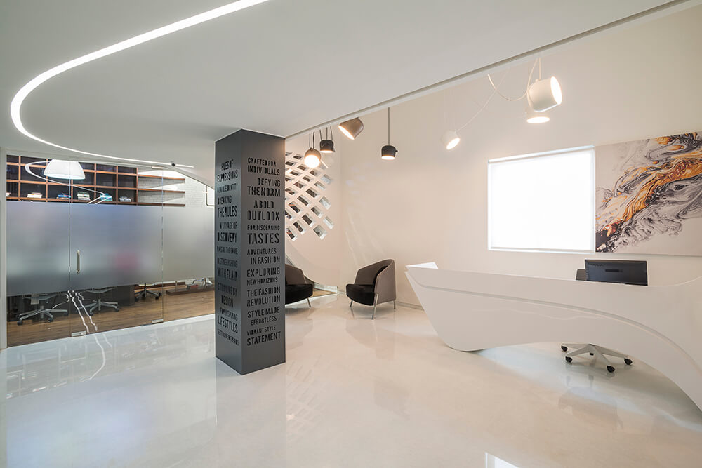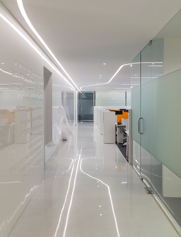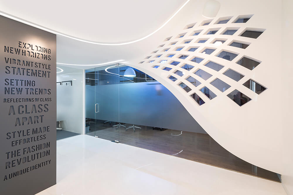 Unlike most contemporary projects that use neoteric techniques, this commercial workplace uses generic materials like concrete brick and glass, effectively used to create complex fluidic forms on the exterior and interior. Drawing from the qualities of the exterior, the interiors aim to accentuate the fluidity of the space by mapping the surfaces in the ceiling and the walls. Malleable materials such as concrete and glass are used in the exterior while flexible ply and solid surfaces are used to create fluidity in the interiors. Flexible plywood is used for most of the surfaces in the interiors, adding lightness and an ephemeral finish. All surfaces are finished in a reflective high gloss paint, accentuating the fluidity which is further augmented by means of a seamless reflective skin using polished white Italian marble. Similar strategies are employed in detailing of the false ceiling and the lighting that goes into it. Sinuous lines of fluidity articulate the ceiling to go with the overall scheme of the interiors. Subsequently, the interiors and the exteriors form one cohesive whole.