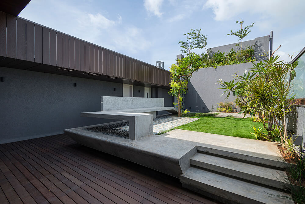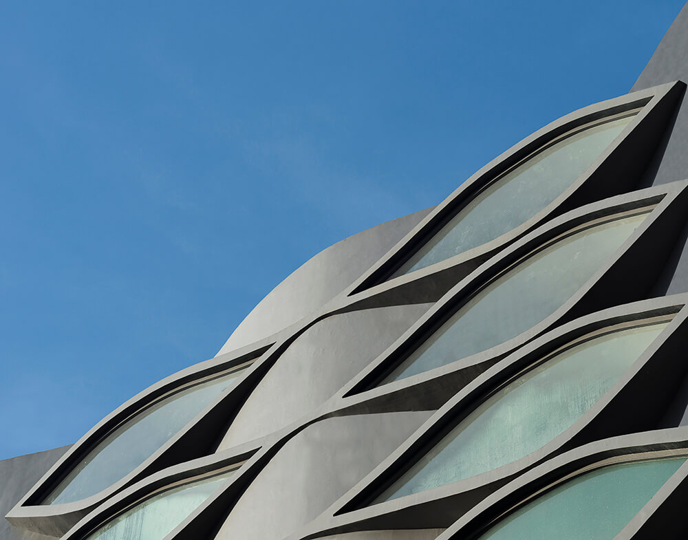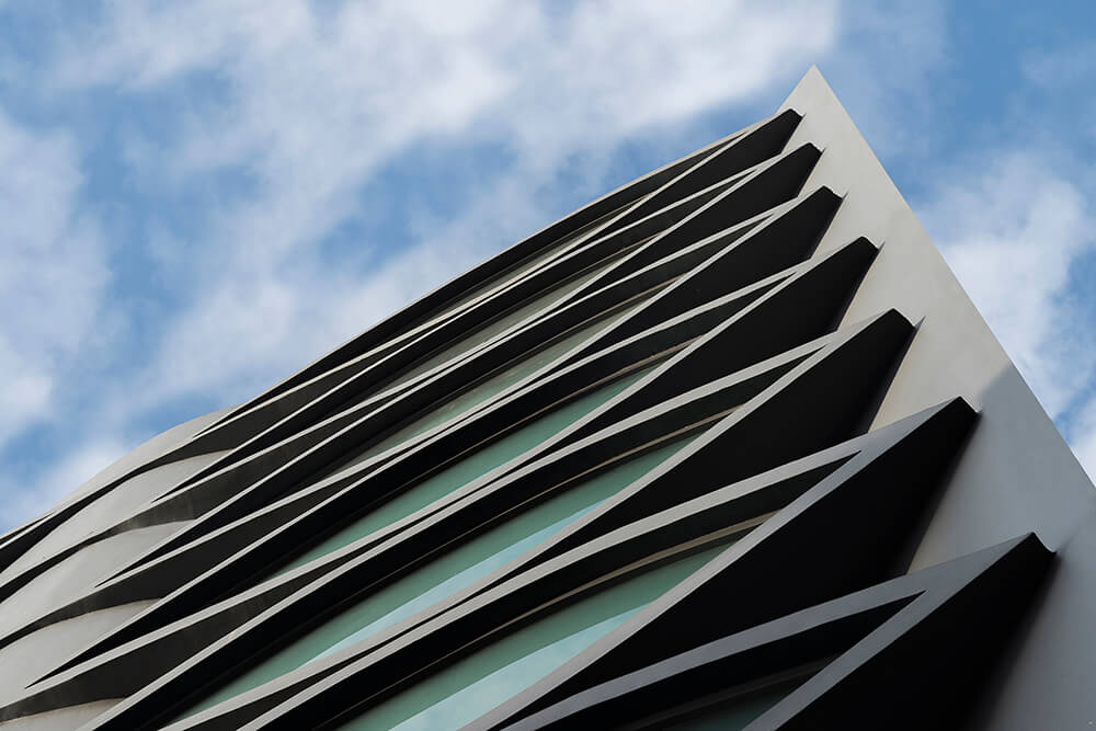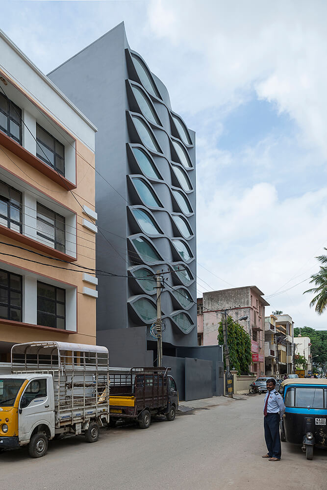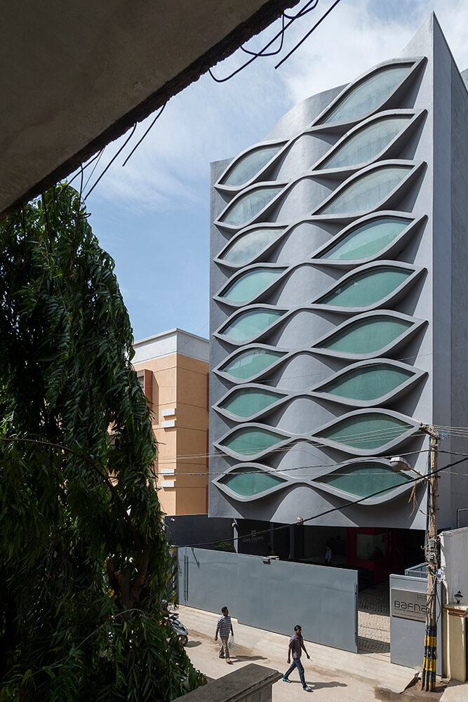 The effect of fluidity is achieved by articulating windows in a sculptural manner on the building facade. Litany of a sinuous pattern to morph the number of floors is abetted to distort the visual perception from the exterior. Reinterpreting the traditional concept of chajjas or overhang over the windows, recessed glass on a patterned facade is wrought to cut out the harsh glare of the sun. Hence, the atypical facade not only endows the built volume with a strong visual identity, but also functions as a modern-day shading device.