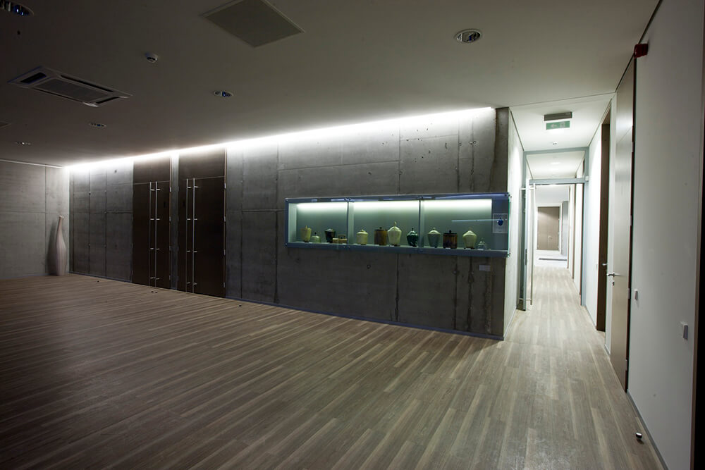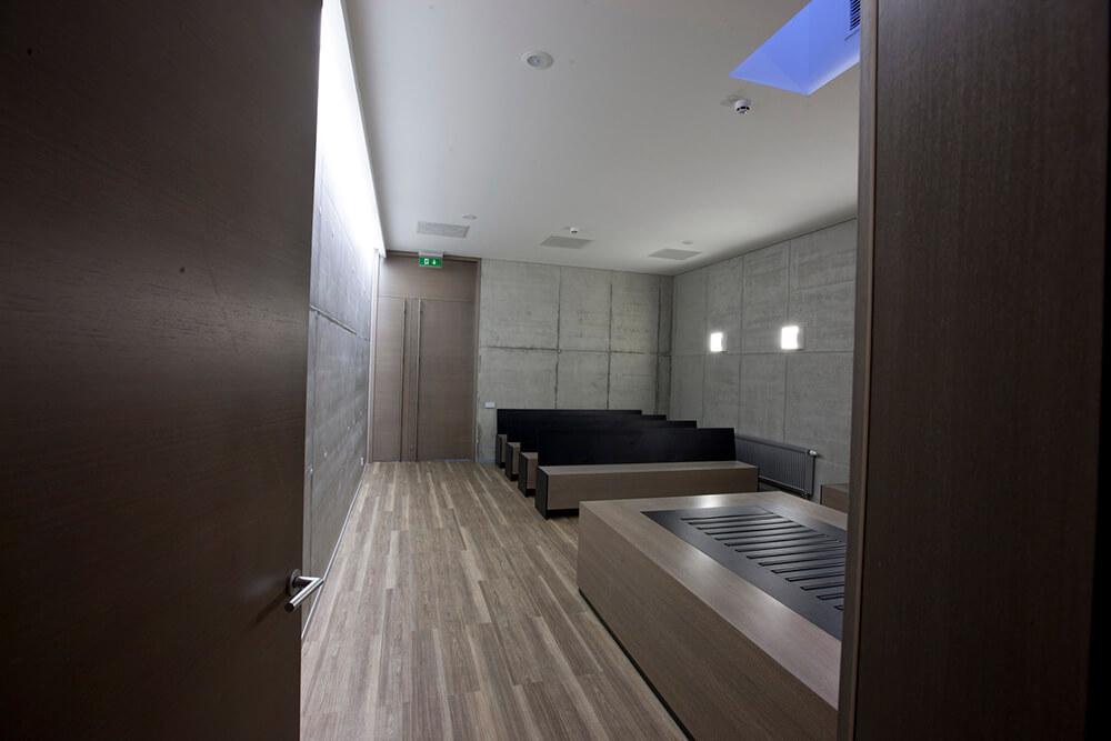 Crematorium interior scenario: courtyard- lobby with resting area- two final disposition halls- cremation hall, cremation equipment room with chimney. The interior is created with four surfaces: concrete, wood veneer, glass with aluminum and white plaster. The ascetic inside allows families to concentrate on a solemnly sad hour with no interference of a colors and details. Every man and his face become very important part of the interior.
