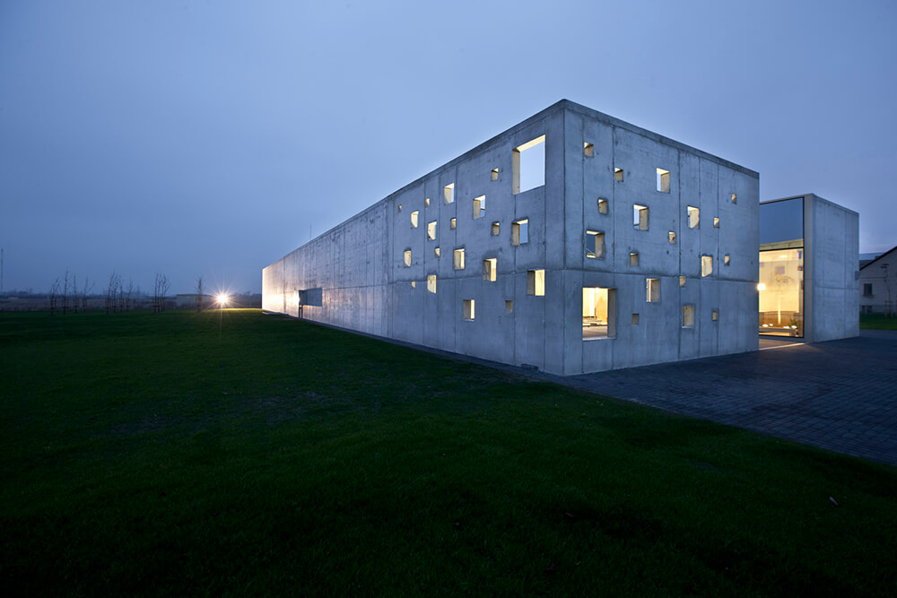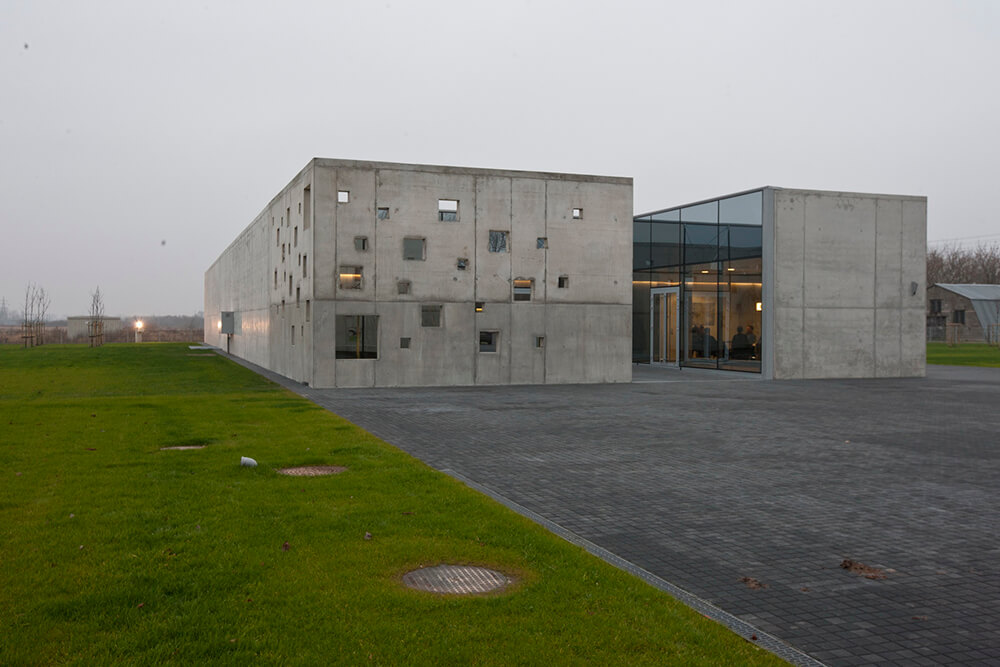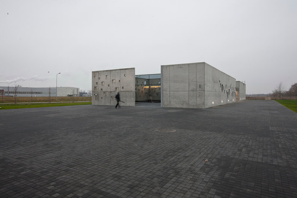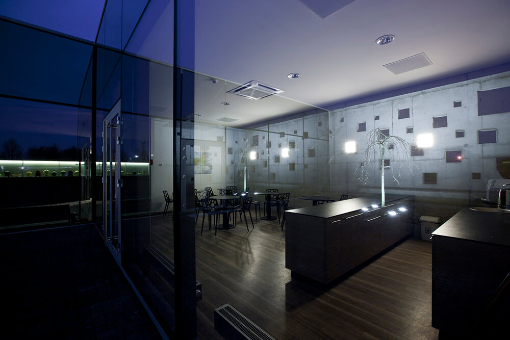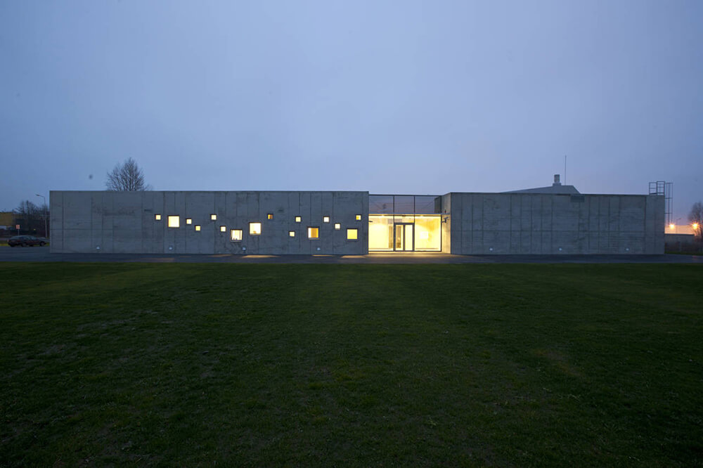 Unaesthetical industrial environment provoked to create minimalistic and even ascetic scenario. It is one storey concrete building which external and internal quality and unity was created with concrete surfaces. In order to distance itself from the industrial environment the building was designed closed like a human introvert. Even the chimney, which cause bad feelings, is hidden in the volume of building. The main goal of the script- to create the inner Japanese style courtyard with a growing pendulum elm before the main entrance. Yard creates an intimate space, the accumulation zone before entering the building. Being inside the yard visually expands the space. It creates like an emotional filter to reduce human’s experience of stress.