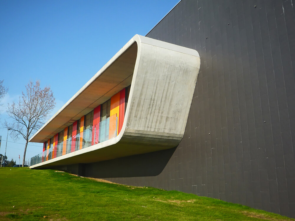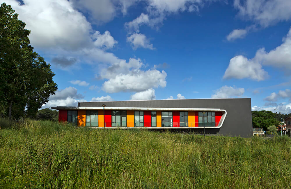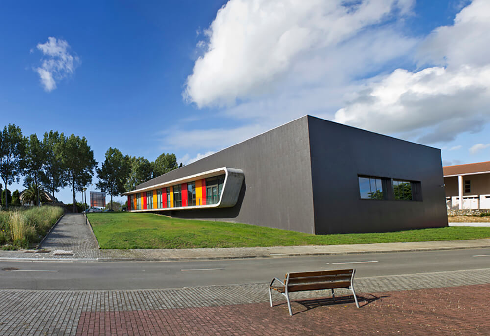 The Municipal School of Dance in Oleiros is a freestanding building with a ground floor and a simple volumetric shape, in accordance with a clear programme of requirements. Two different volumes hold the different uses of the building and separate the main operation areas. In plan view, it is a compact building in the plot optimising surfaces and access.