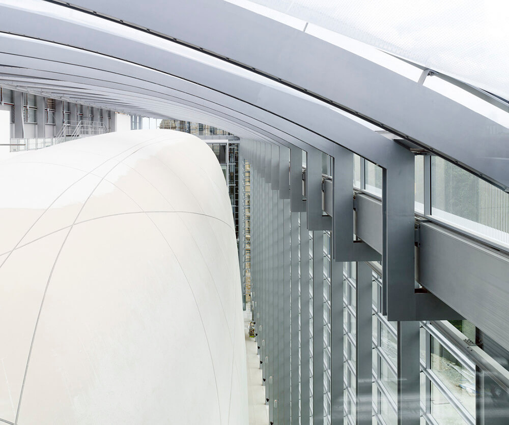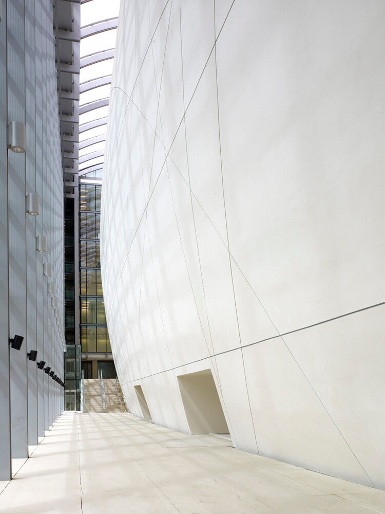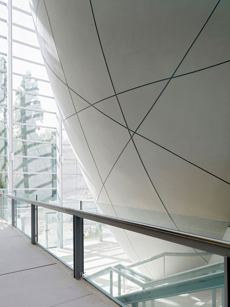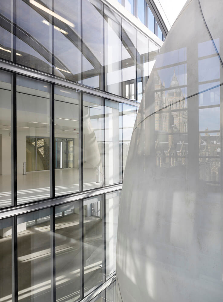The centerpiece is made to appear like a large silk cocoon, and forms the inner protective element that houses the museum’s unique collection of 17 million insects and 3 million plants. The shape and size give the visitor a tangible understanding of the volume of the collections contained within. The regulation of temperature and humidity reduce the risk of pest infestations ensuring that the collections will be protected and preserved for many years to come. The exposed thermal mass of the continuous sprayed reinforced concrete shell maintains a stable internal environment, and minimizes energy loading.