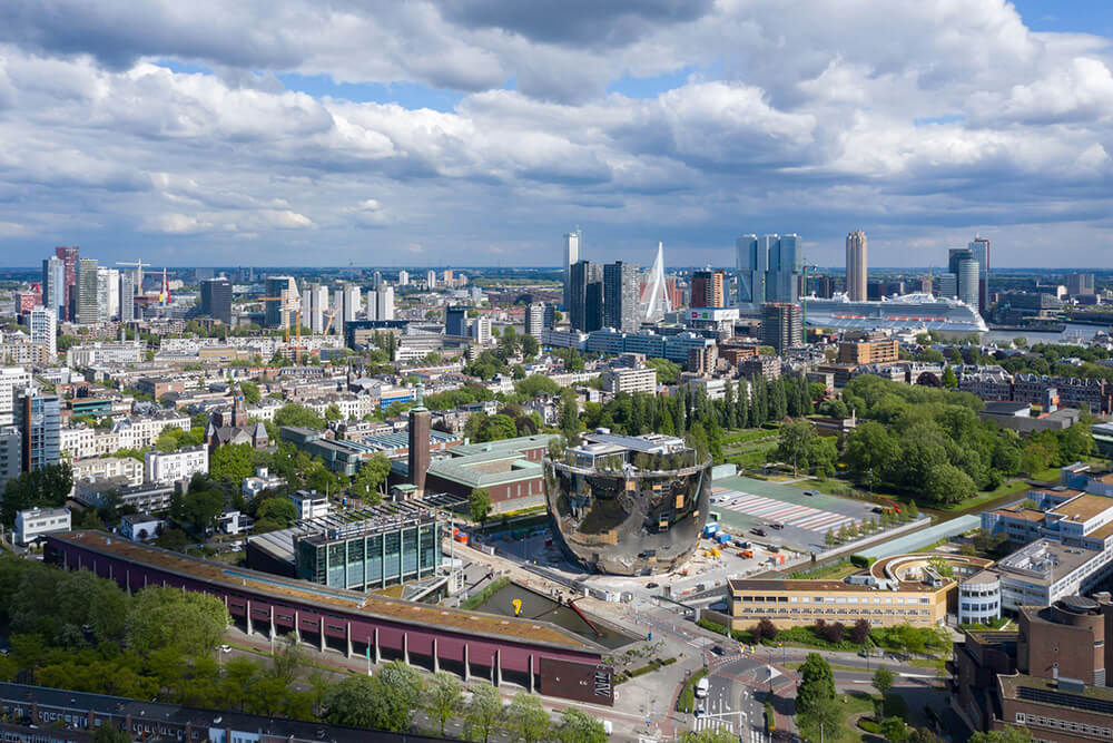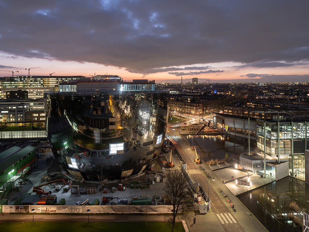An approximately 130-foot-high building ‘in the round’, the Depot’s bowl-like form has a relatively small footprint. This form ensures that at the ground level, existing views into and routes through the Museumpark remain unimpeded and reduces the impact on underground water buffers, while an expansive rooftop public space with a restaurant provides access to inspiring views of Rotterdam.