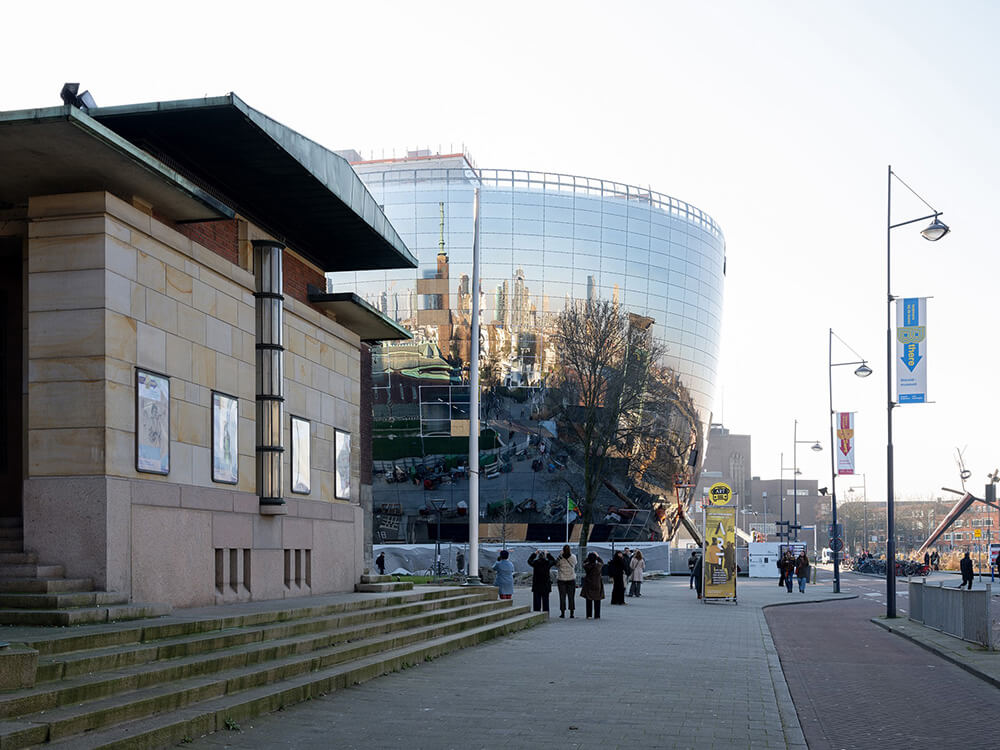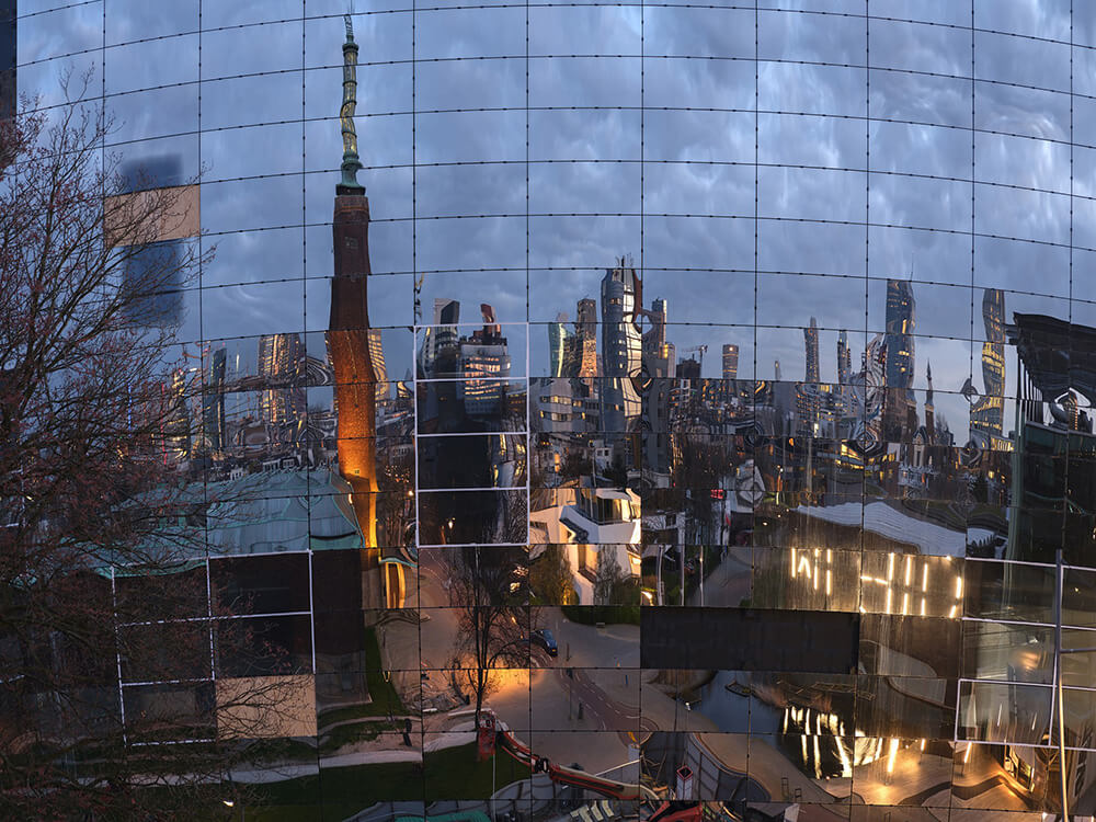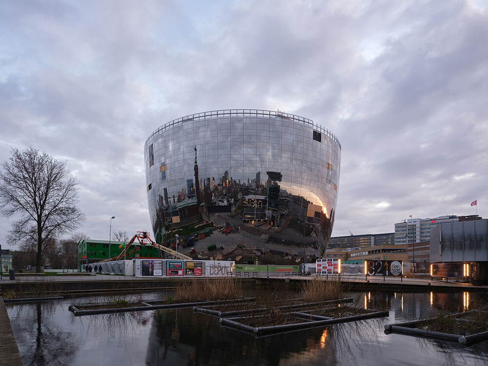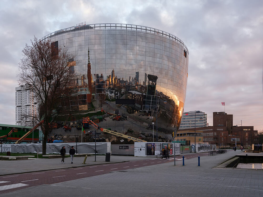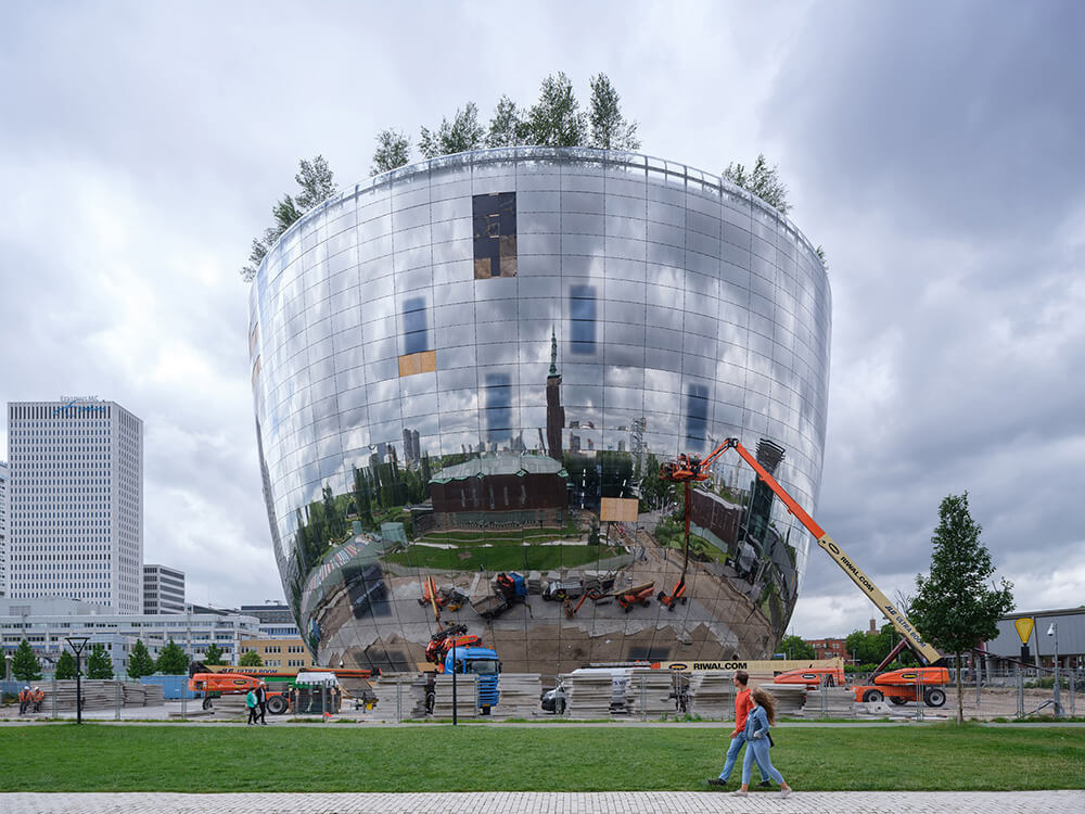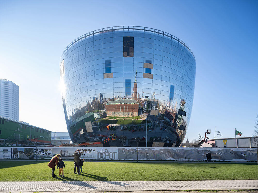 Comprising 71,138 square feet of glass subdivided into 1,664 mirrored panels, its reflective facade wears the trappings of whatever surrounds it: people passing by, Museumpark’s leafy grounds, the clouds, and Rotterdam’s dynamic city skyline. Thanks to this reflection, the building is already fully integrated into its surroundings, despite its not insignificant size of 161,458 square feet. It enlivens its surroundings while establishing strong relationships with the park and the neighboring buildings.