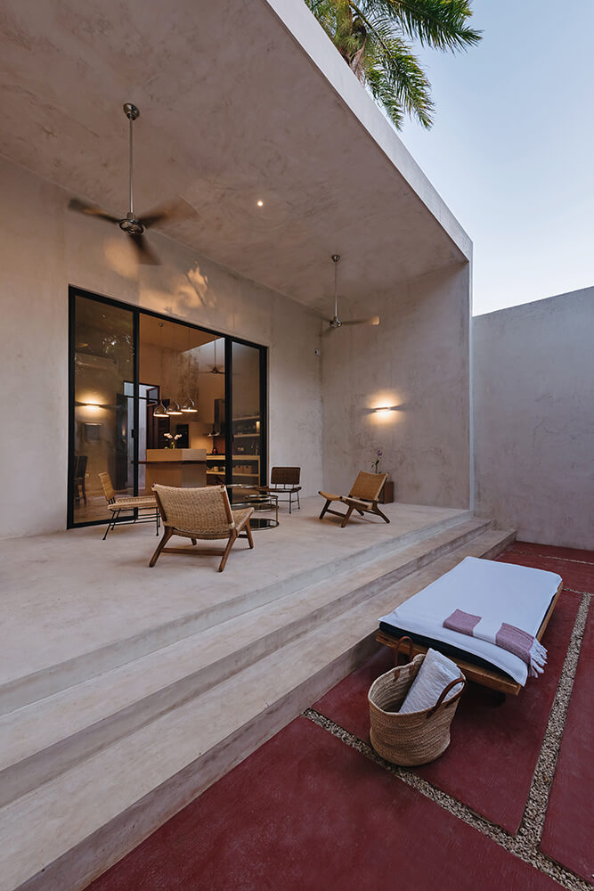 With the intention of relating the ordered spaces of the project like ailes, terraces, exterior gardens and interior patios were directly connected all the rooms of the household, permitting the spatial continuity within them and with the exterior thanks to the large windows and terraces. The volume integrity of white cement in combination with wood and red pigmented cement reach a contrast between the whole materiality, giving the house an open and comfortable character.