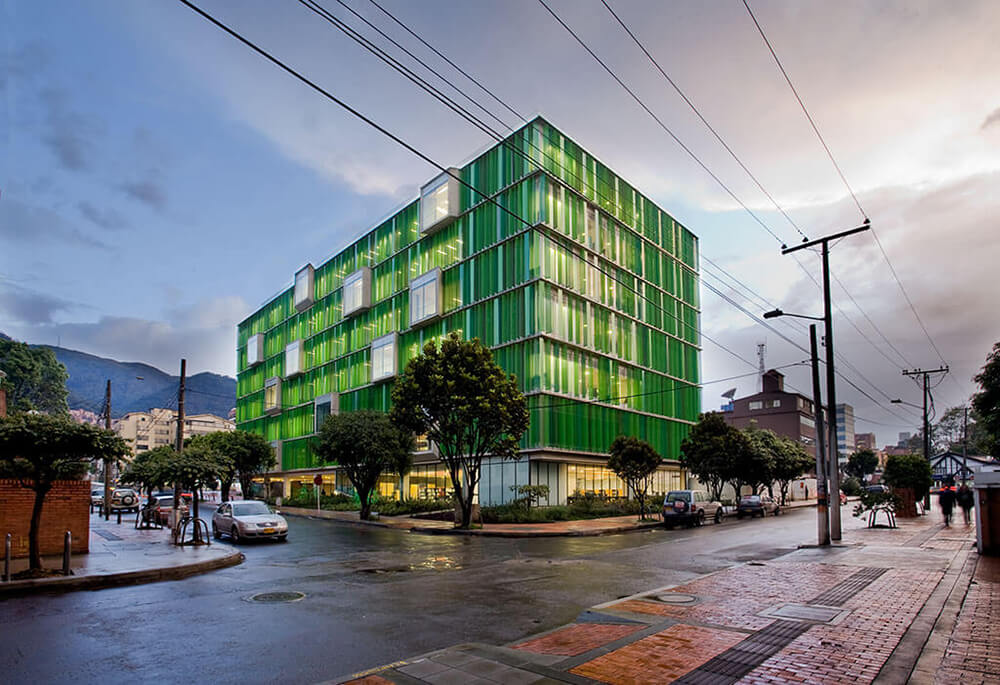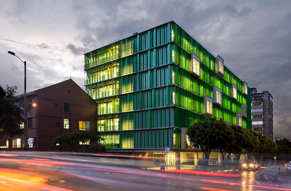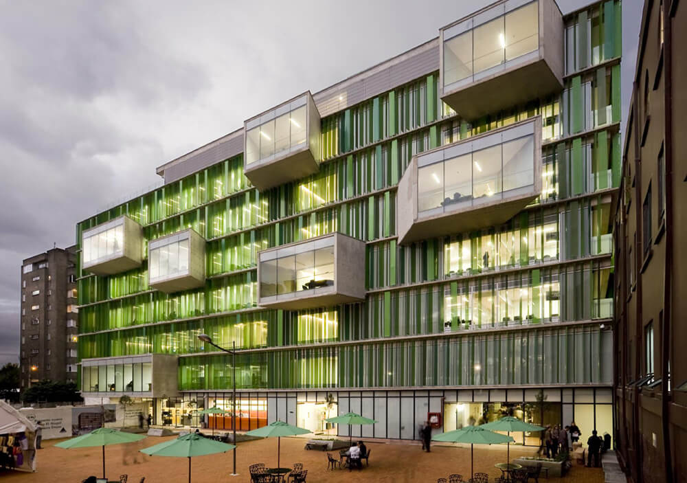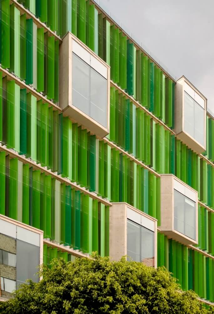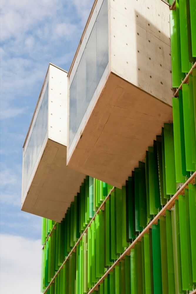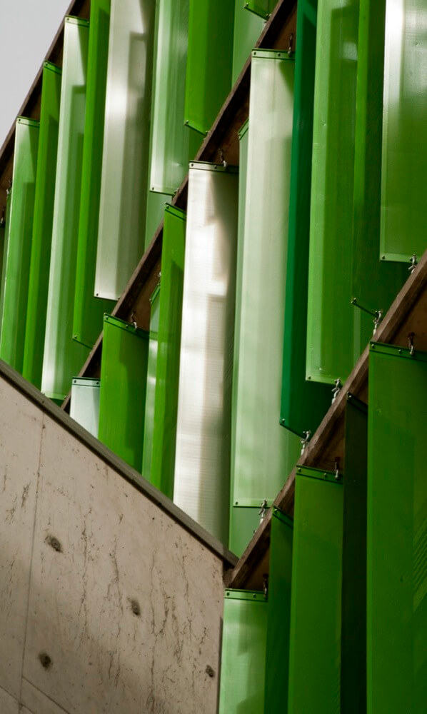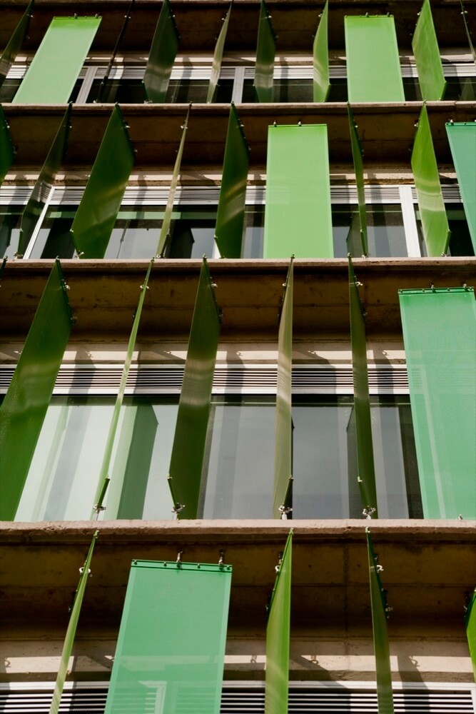 For the building skin, a micro-perforated element of green tones, was developed in group with the manufacturers, which acts as a filter cutter for the external light. These elements give a particular image to the building, and highlights the “random drawers”.