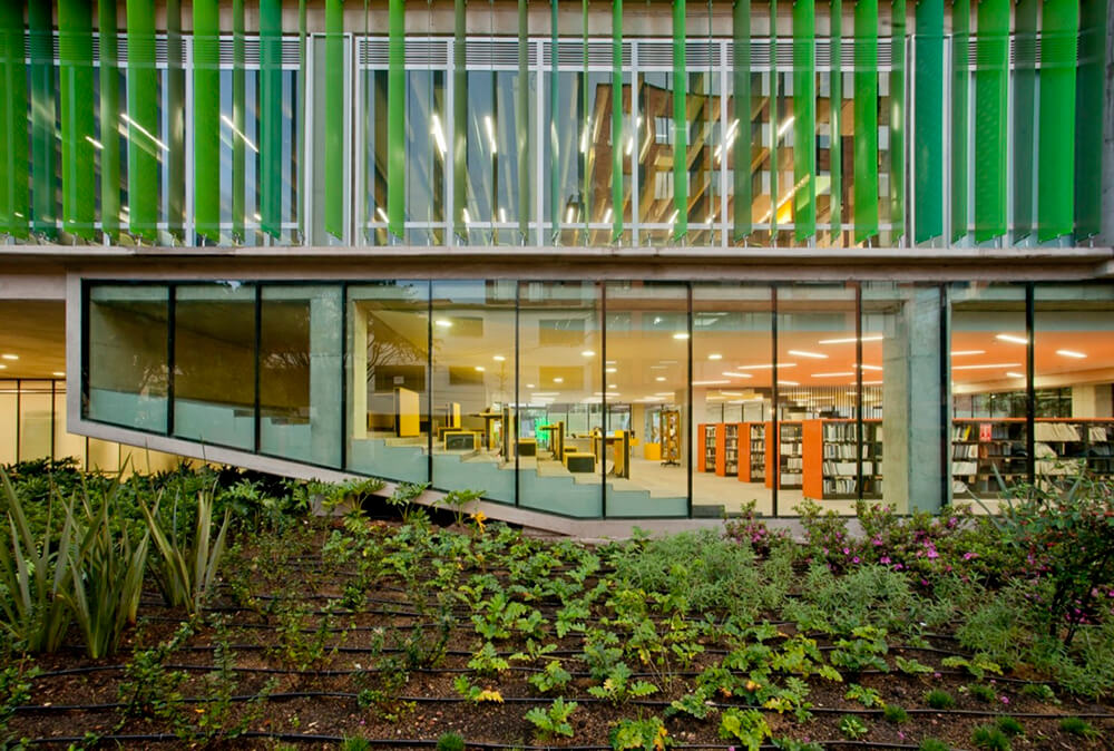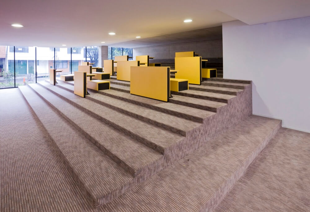 The classroom building corresponds to a prism of seven levels. On the first floor are the entrance areas and the central library, the classrooms are located on the upper floors, and on top, a deck for collective use.