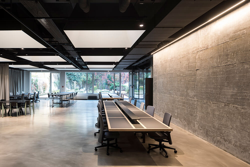 The large room can be structured with acoustically effective curtains via a rail system. In this way, one half of the room can be quickly transformed into a lecture room for 60 people or a round, intimate meeting room for a project team.