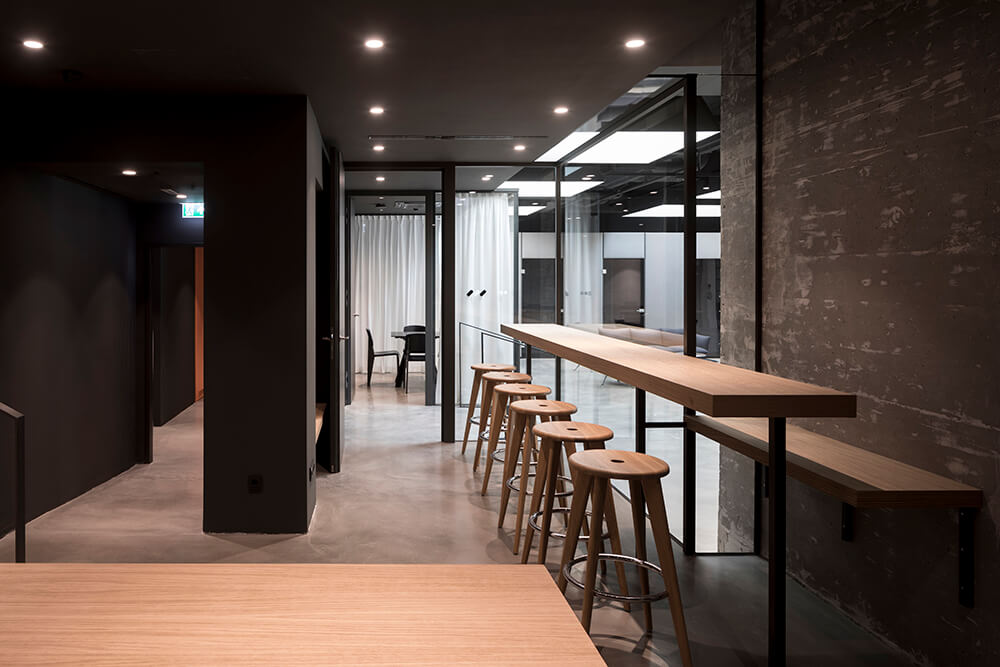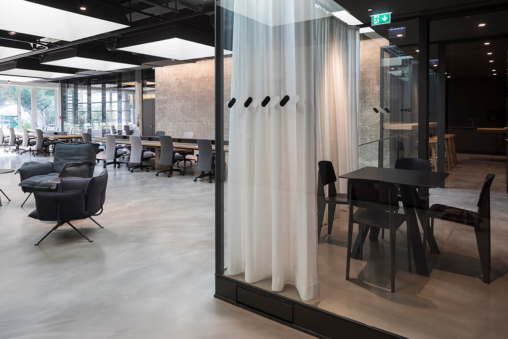The material concept is based on exposing the solid components, in order to emphasize the haptic and sensuous quality of the raw material. The exposed concrete is complemented by filled concrete floors, dark raw steel and oiled, matte black wooden surfaces. A soft contrast is created by the curtains, the textile wall tapestries and the covers of the softly upholstered chairs in various grey fabrics, traditionally used for men’s suits. The bright orange of the folding walls in the intermediate area gives this space a special energy and radiance, otherwise disrupted by the lack of daylight.