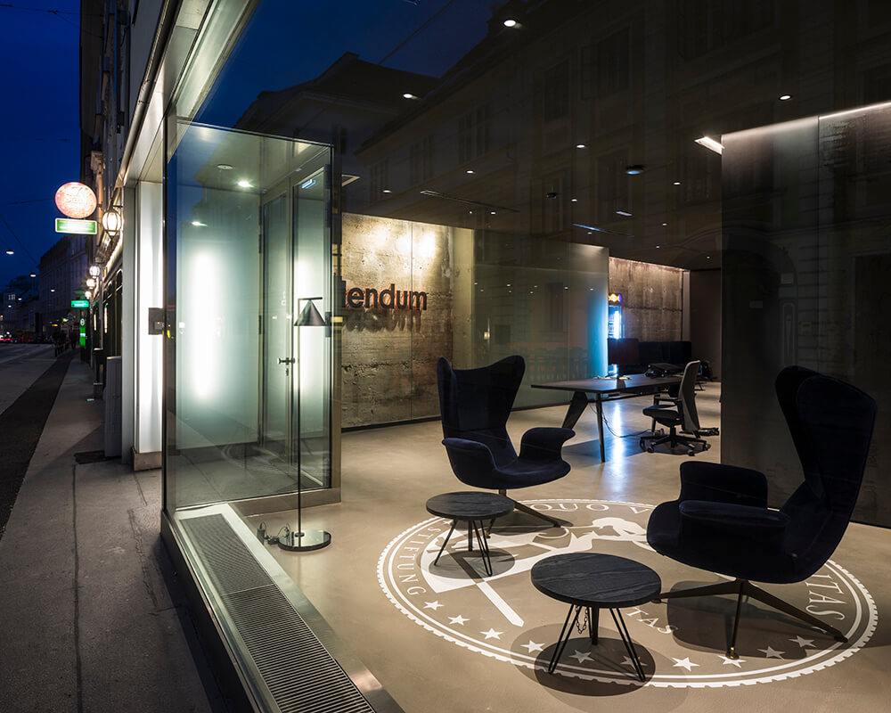 Addendum is an Austrian media project and research platform. Addendum’s editorial team has grown steadily, so an expansion of office space was necessary. Former premises of a Volksbank branch in Vienna were chosen as the new location. The concrete building from the late 70s is flanked on both sides by historic buildings. The ground floor occupies the plot to a depth of approximately 40 meters, behind which a picturesque garden opens up. Through the elongated space, the garden is visible from the street. By stringing together differentiated zones, it’s been possible to create a varied and spacious office landscape.