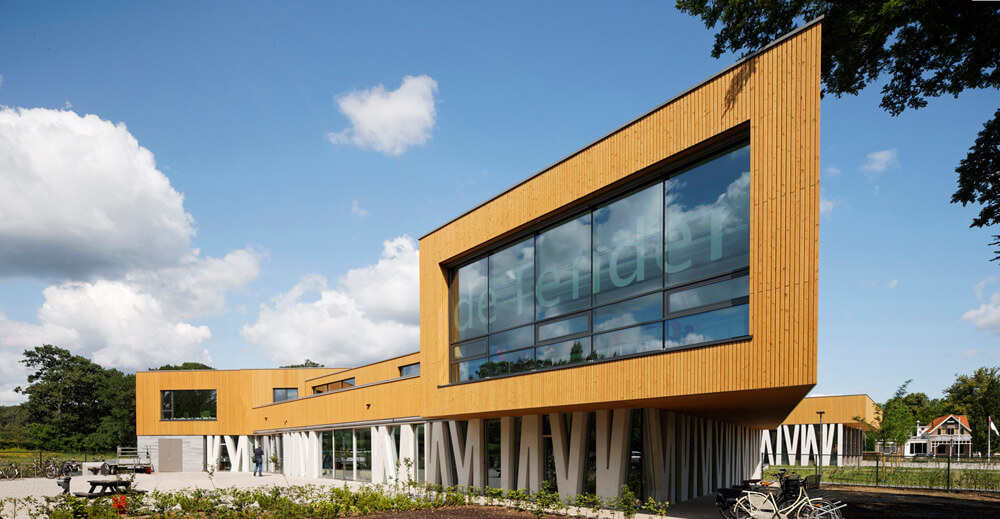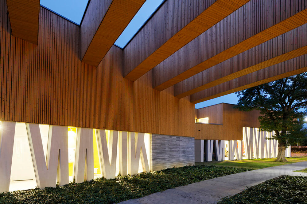 The ensemble is conceptually designed as a frozen forest, with an open and transparent ground floor with concrete columns as tree trunks, filled in with glass and natural stone accents, crowned with an upper elevation with slender wooden slats as a ‘leafy canopy’, hovering above the ground floor. The clear selection of materials provides a strong architectural identity.