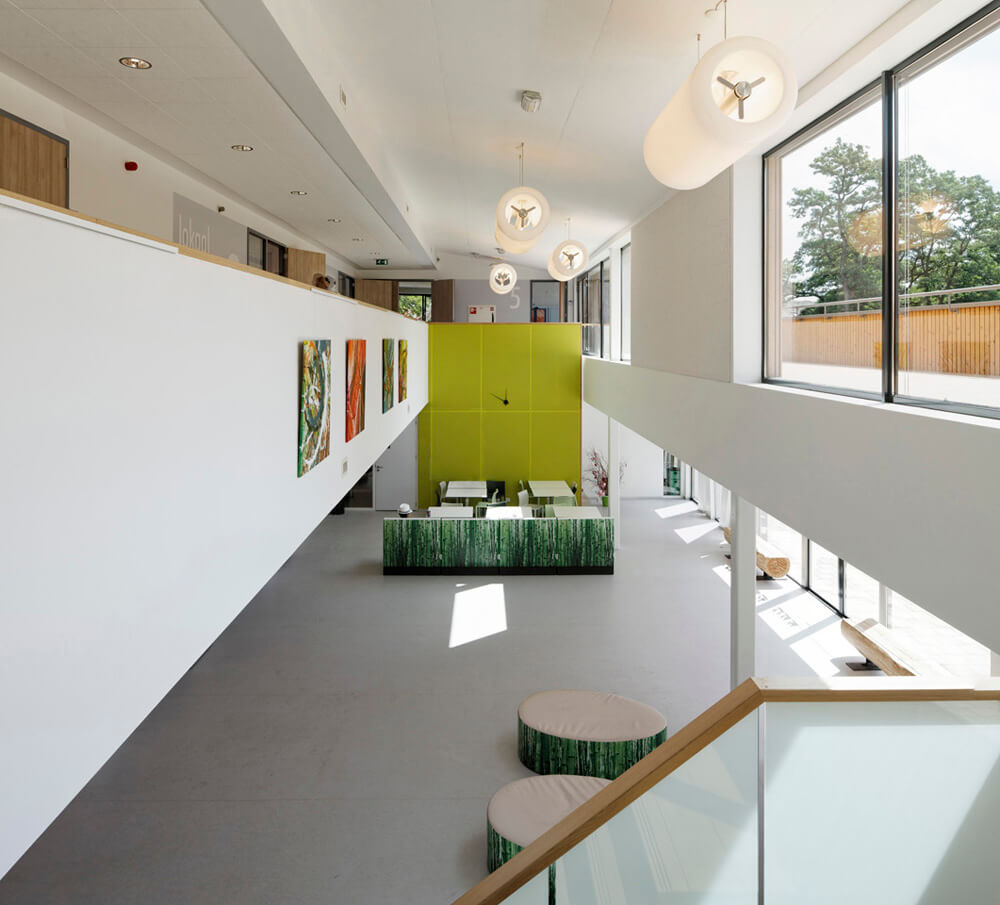 The interiors are light and transparent and offer an optimal functionality to their users, with a generous central hall and canteen area and a diversity of classrooms and workshops for the Vocational school, a large and high remise for the fire department with unexpected spatial views and vistas to the bar area and the instruction room and spacious sports facility.