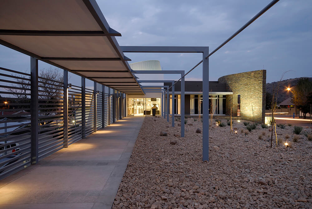 Hemmed in by streets on three sides and sloping down to a small watercourse, the site for the new head office is located in a decentralized commercial node in the suburb of Klein Windhoek and surrounded by hills and low-density residential development. Views onto the site from these surroundings dictated a sensitive approach to form giving, scale, site planning, and the use of materials. Transparency and legibility were key design considerations from the outset: a strong circulation axis leads the visitor along a shaded entrance walkway to a reception area where glimpses of the building interior are introduced. This walkway also serves as a visual barrier separating the lower lying staff parking area from the generous open space embracing the public face of the building.