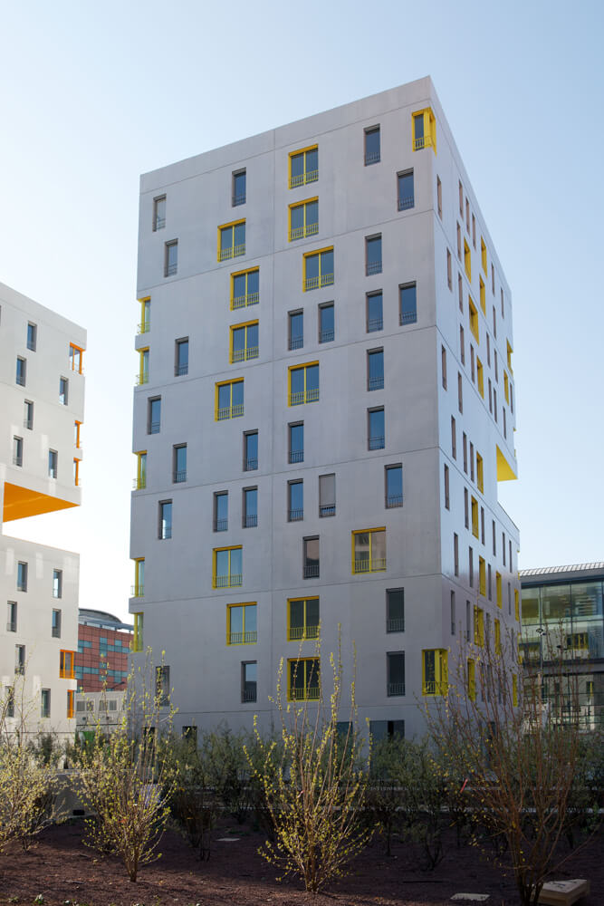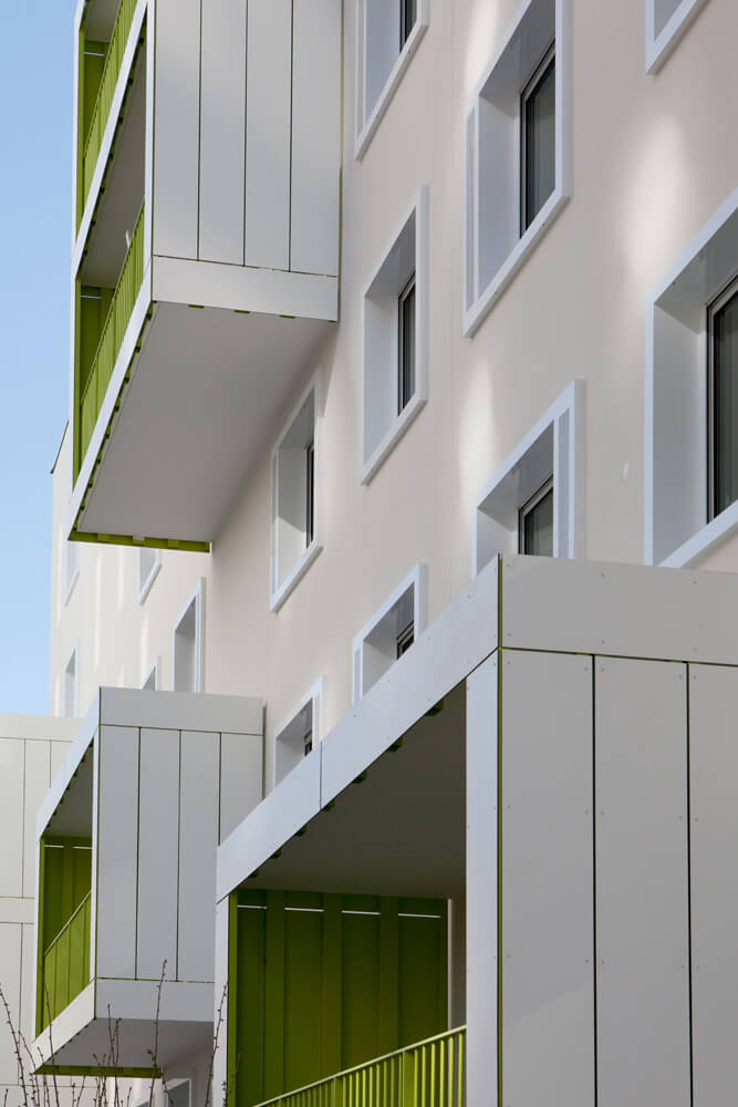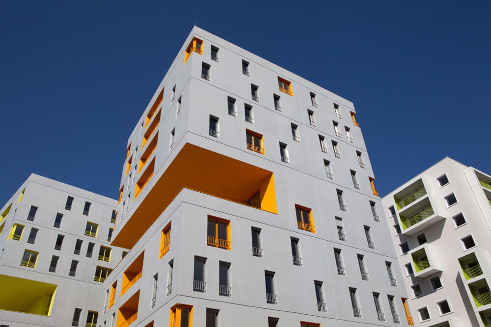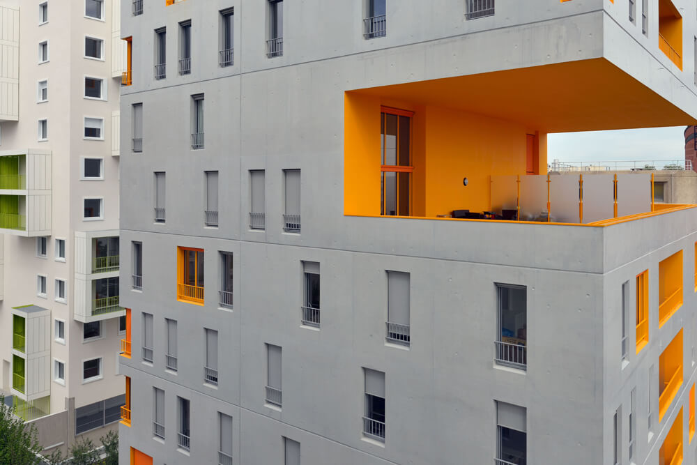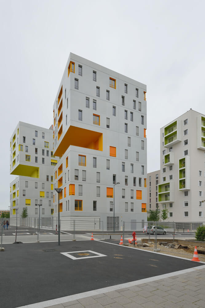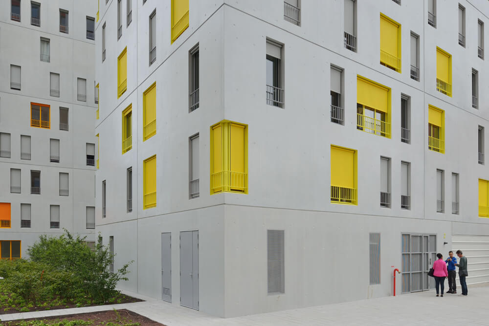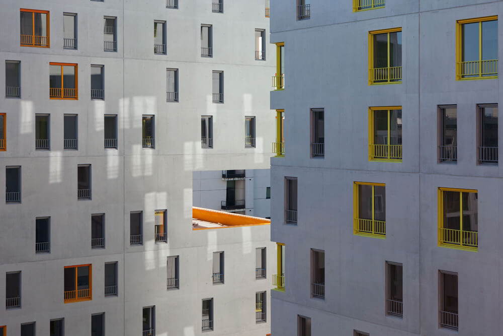 A style affirms itself: inertia. The rhythms of the austere openings create a graphic interplay outlined in color. The apartment interiors respond to specific compositions, both near and far, drawing the eye towards the landscaping and the emblems of the town, particularly Évry Cathedral. Refusing to be constrained by stylistic archetypes, the buildings embody a new urbanism, environmentally and socially friendly, a quest for quality in response to new ways of living.