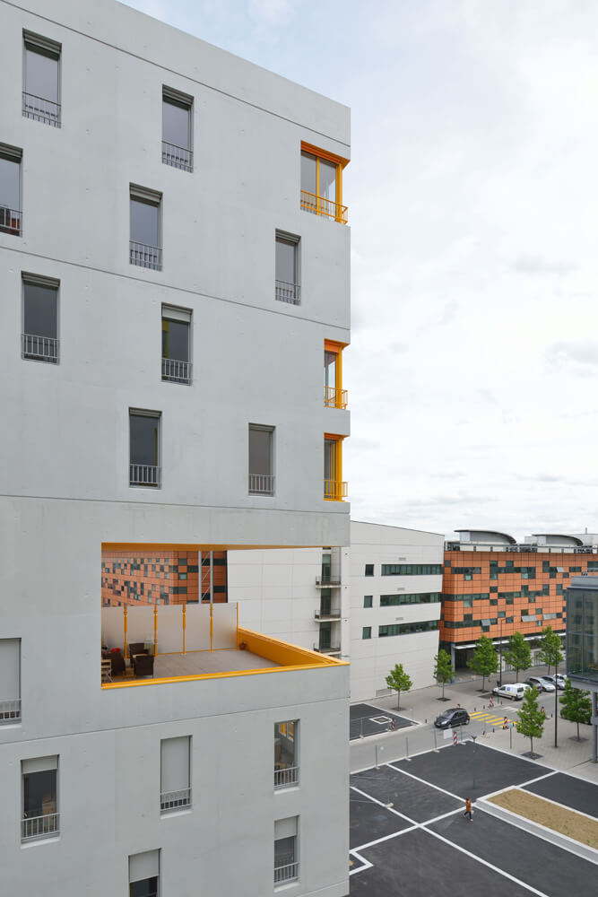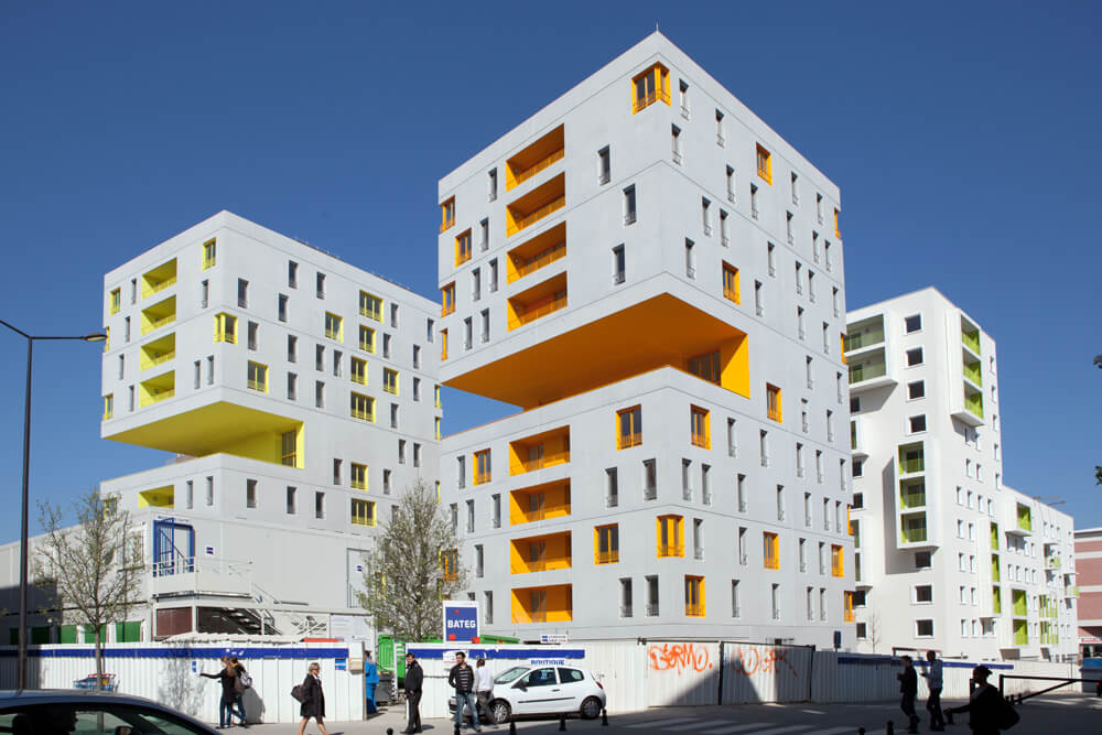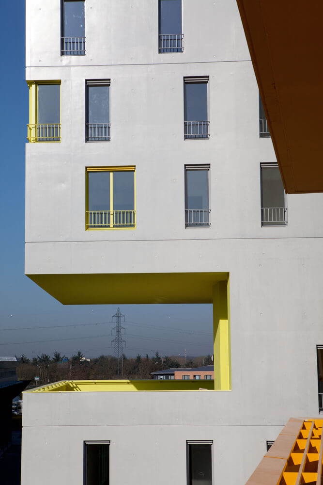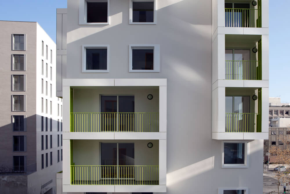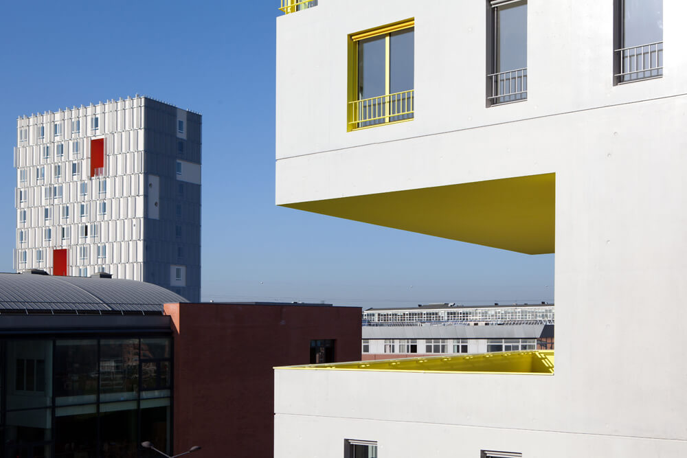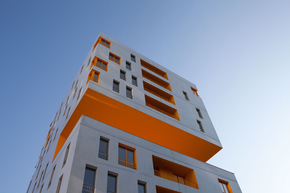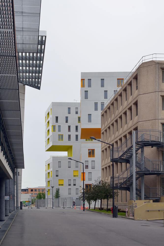 A style affirms itself: inertia. The rhythms of the austere openings create a graphic interplay outlined in color. The apartment interiors respond to specific compositions, both near and far, drawing the eye towards the landscaping and the emblems of the town, particularly Évry Cathedral. Refusing to be constrained by stylistic archetypes, the buildings embody a new urbanism, environmentally and socially friendly, a quest for quality in response to new ways of living.