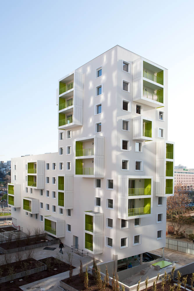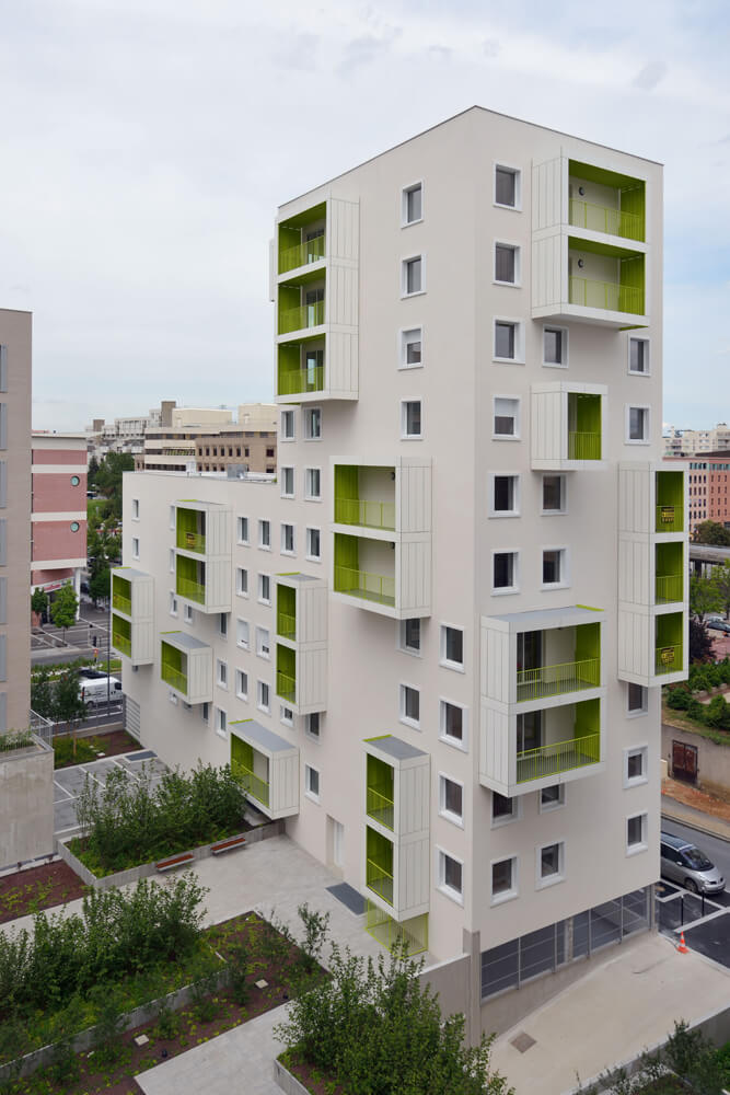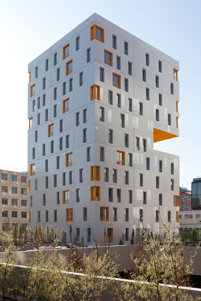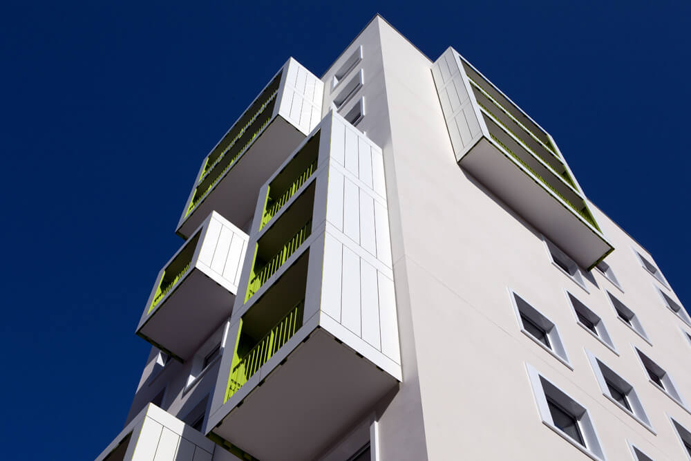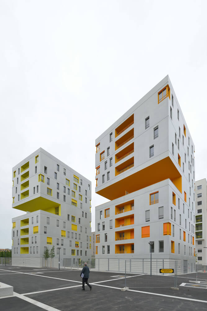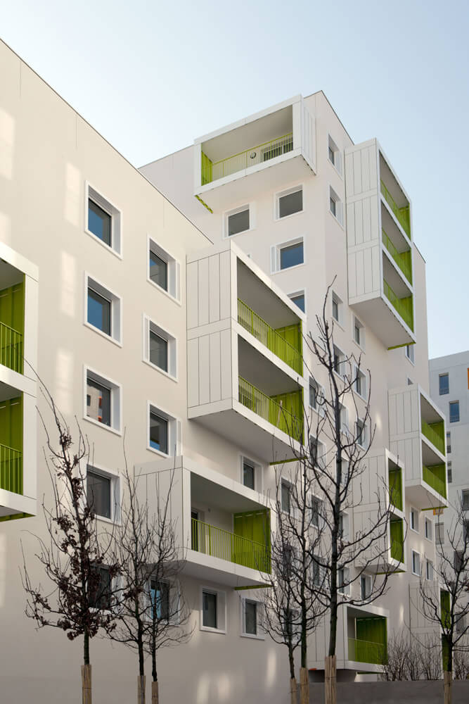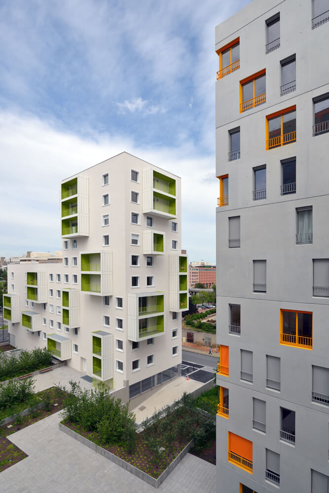 A style affirms itself: inertia. The rhythms of the austere openings create a graphic interplay outlined in color. The apartment interiors respond to specific compositions, both near and far, drawing the eye towards the landscaping and the emblems of the town, particularly Évry Cathedral. Refusing to be constrained by stylistic archetypes, the buildings embody a new urbanism, environmentally and socially friendly, a quest for quality in response to new ways of living.