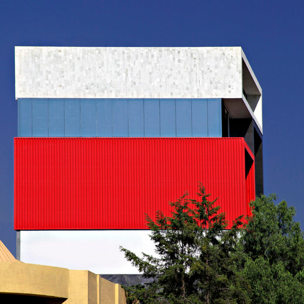 Materials in facade: TEKA Wood, Volcanic Stone, Quarry Stone, Glass, Hunter Douglas Corrugated Metal Sheet and White and Black Porcellanite