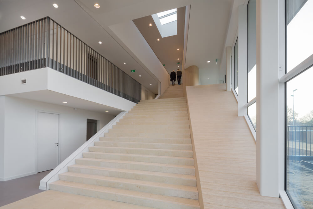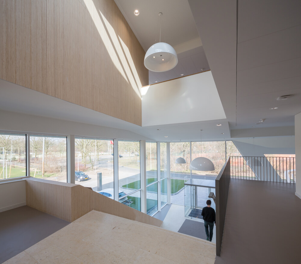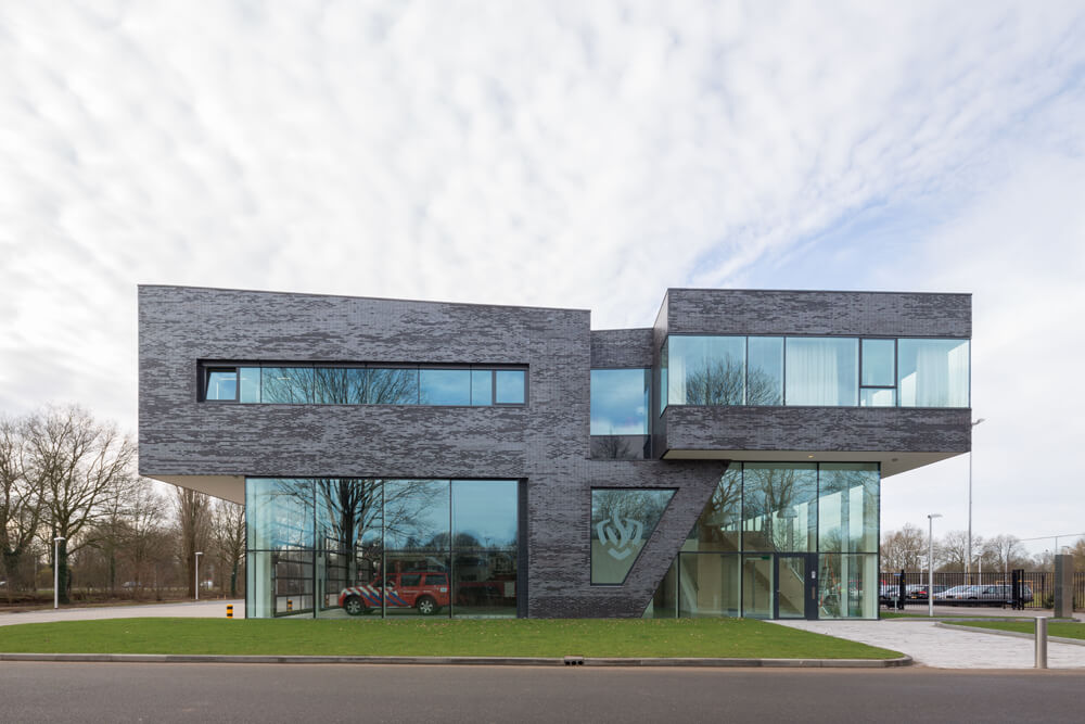 The Fire station houses several functions with a variety of appearance and atmosphere: the sheltered area for the fire trucks, the workshop and car wash on the ground floor, the bedrooms on the first floor and on the upper layer the offices, work-café, fitness room and living areas. Because of the high transparency , there is an abundance of daylight coming into the building. The big windows ensure panoramic views of the green surroundings. The various vistas create different views and unexpected perspectives; For instance the sheltered area for the fire trucks can be viewed from the locker room on the first floor and from the hall the Fire trucks can be seen. A striking feature of the interior is the majestic staircase that connects all floors and functions. Along side the staircase is a light wooden wall which folds around the service unit on the top floor. The office floor is fully developed in accordance with the new way of working, with open office spaces and flexible furnishing. Cohesion and identity are created by a variation in materials: glass, brick, wood, concrete, smooth and with patterns embossed in it. On the upper floor roof gardens, patio’s and terraces provide the building of it’s specific sculptural expression, creating outdoor spaces with their own specific identity: one linked to the work-cafe and bar, one linked to the living room of the volunteers, one linked to the office spaces. Huge cantilevers form a sheltered area for the fire trucks, anchoring the building in its surroundings.
