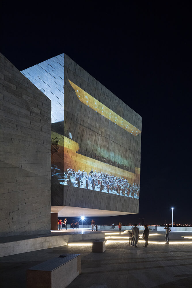 The public area of the building features a three-story height vestibule combining the floors and voids creating the access to the halls. The final floor fits a terrace overlooking the river and the sea. The building also has a cafeteria and a restaurant. Within the platforms of the vestibule, spaces are formed where solo concerts, camera concerts, dance performance and contemporary theater plays can be held.