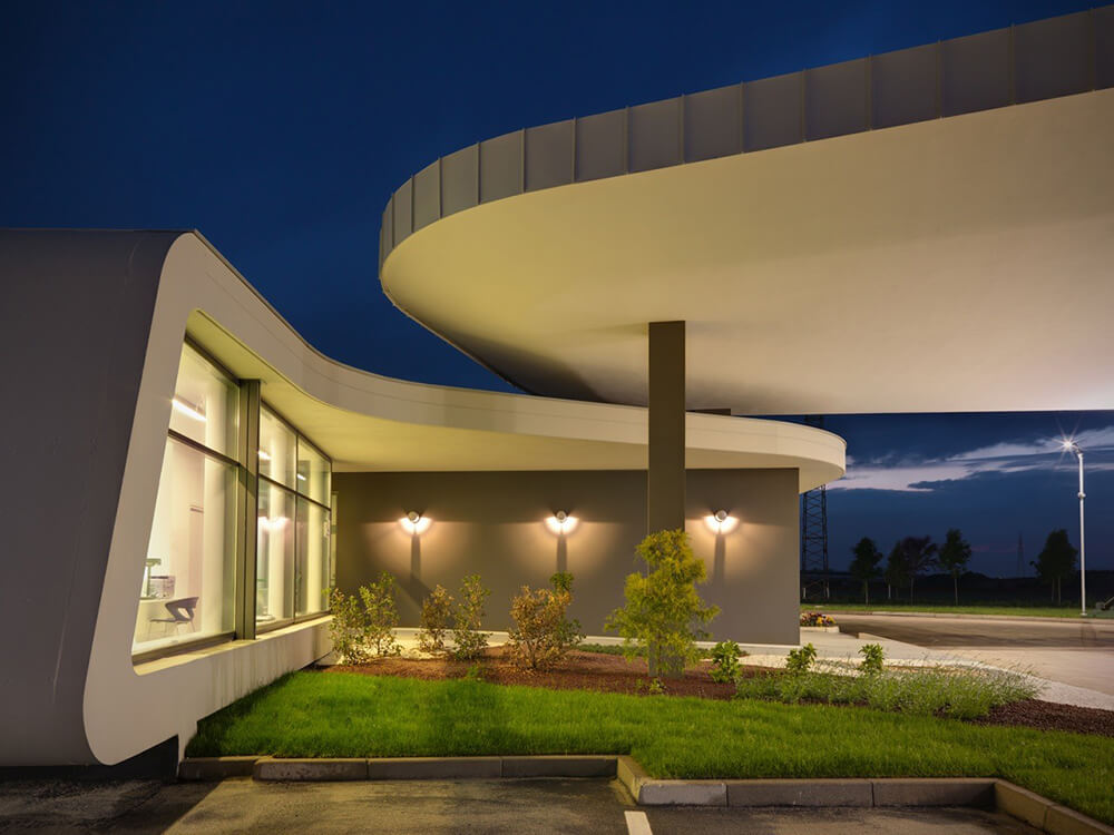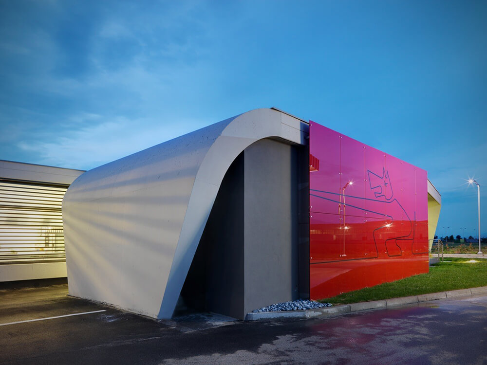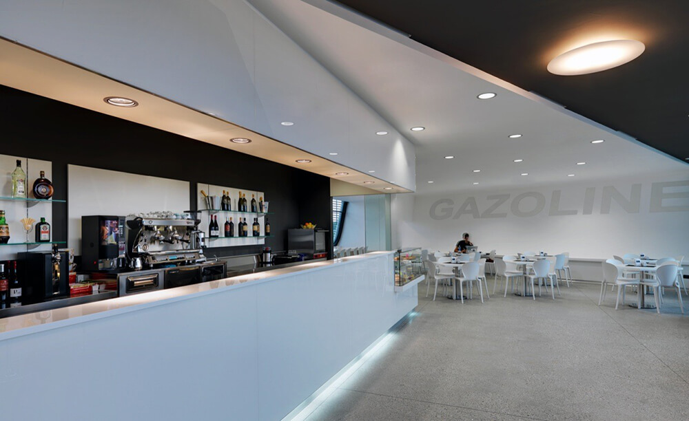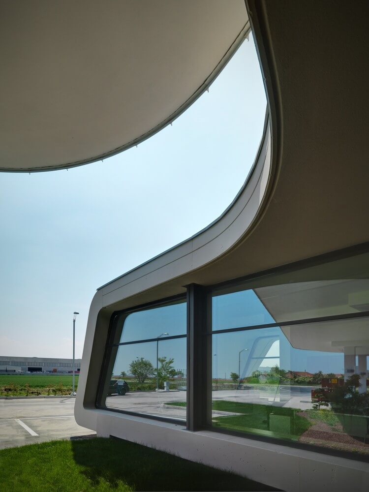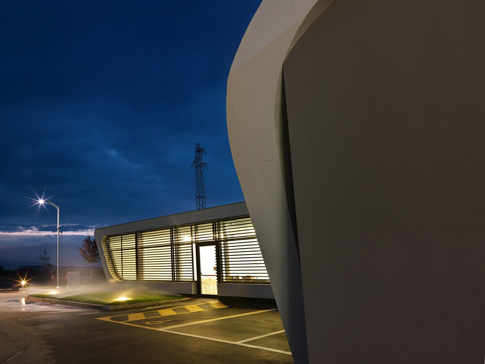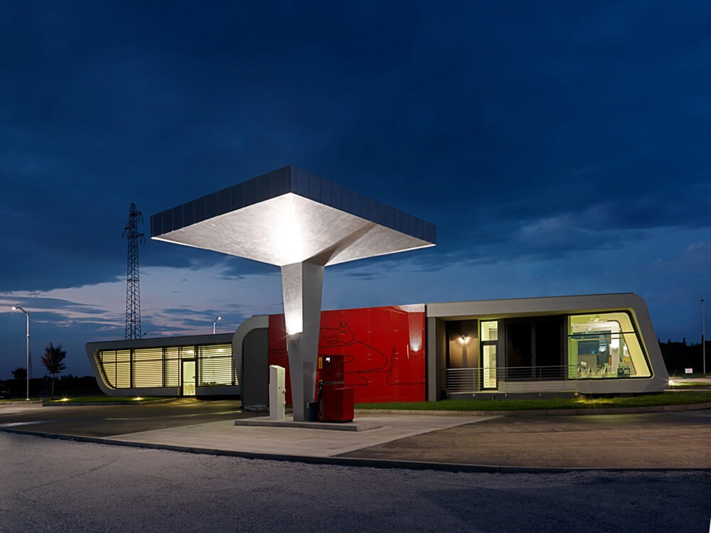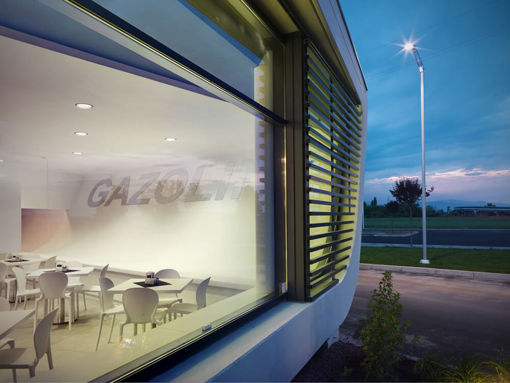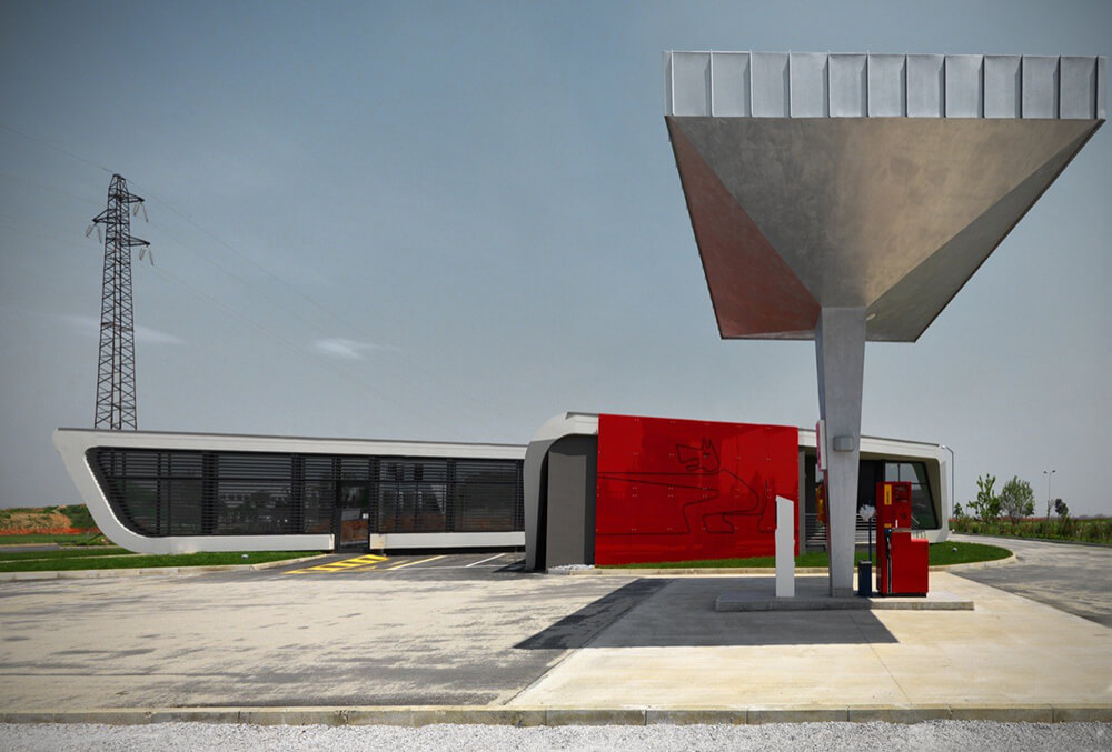 The design of a service station is a strong reference to the idea of travel, short or long-distance routes interrupted only by a few stops and then back on the road.
