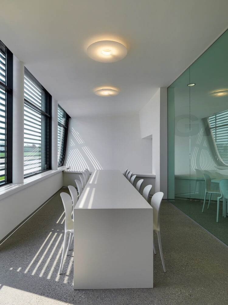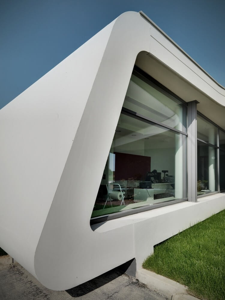 The shell reinforced concrete, cast in special molds fluidized is closed by glass walls.