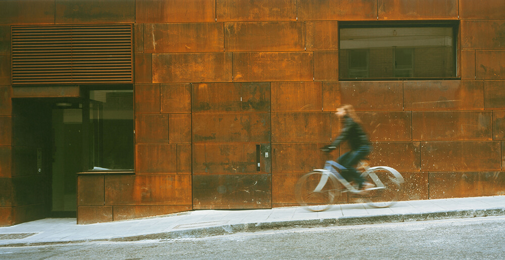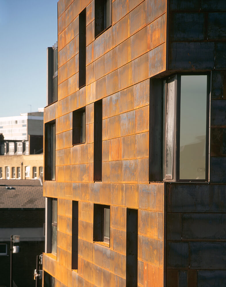 The exterior is characterised by clarity of detail, with the solidity of the envelope progressively broken down and peeled back to reveal the inhabited spaces. A Cor-Ten steel rainscreen is utilised for the street facades with setback aluminium framed glazing to the living areas. Over time, the Cor-Ten steel will take on a rich patina and the whole facade will develop in tone and texture, describing the exigencies of the site. This weathering will further suggest an empathetic relationship between the building and its neighbours. Internally, the language is of stripped down semi-industrial materials, with exposed concrete and plaster finishes to the walls and ceilings and hardwearing epoxy to floor surfaces.