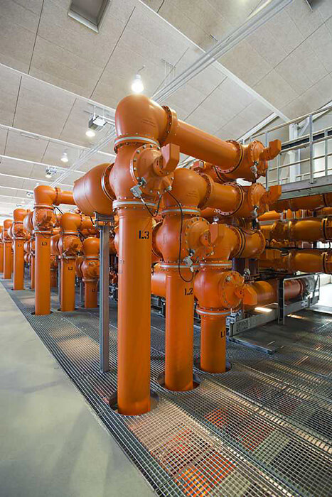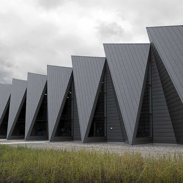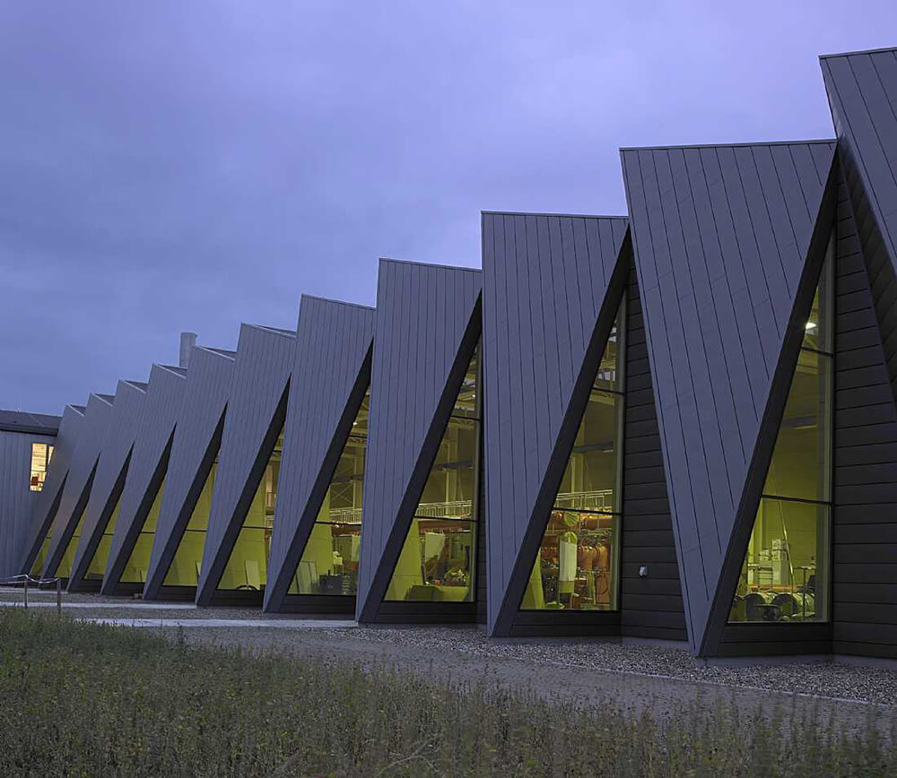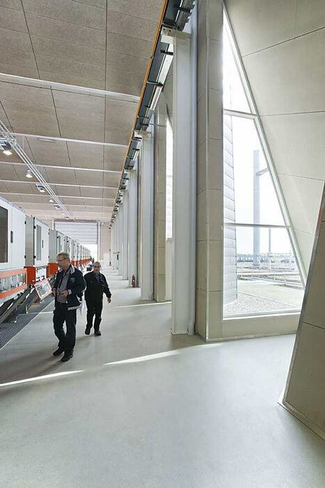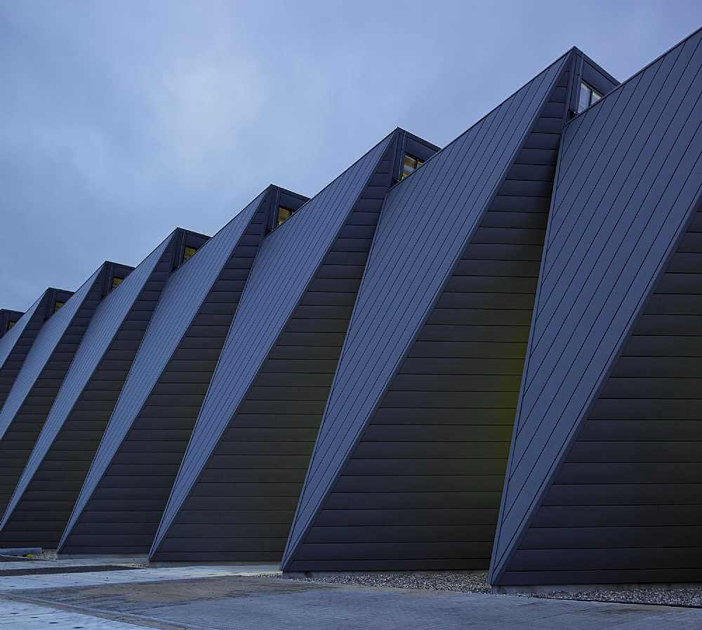 The enclosure has therefore been designed as a series of modules, each module consisting of a lightweight shell with a slanted roof and a folded exterior surface which adds lateral stability. Arranged in series, the modules create a transparent gill-like envelope with triangular openings, letting ample daylight into the interior and allowing glimpses of the GIS units at the heart of the building.