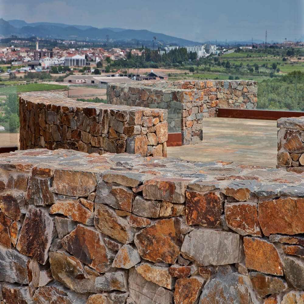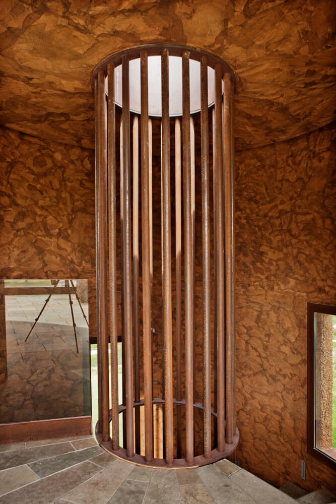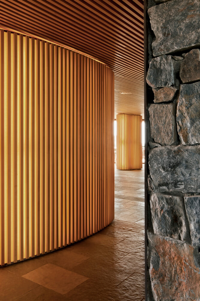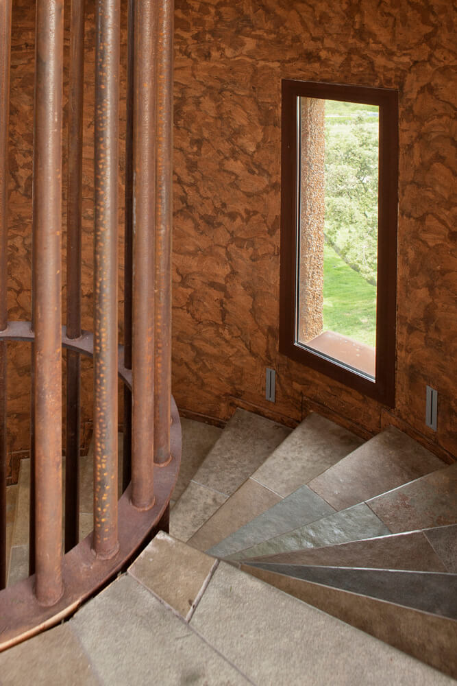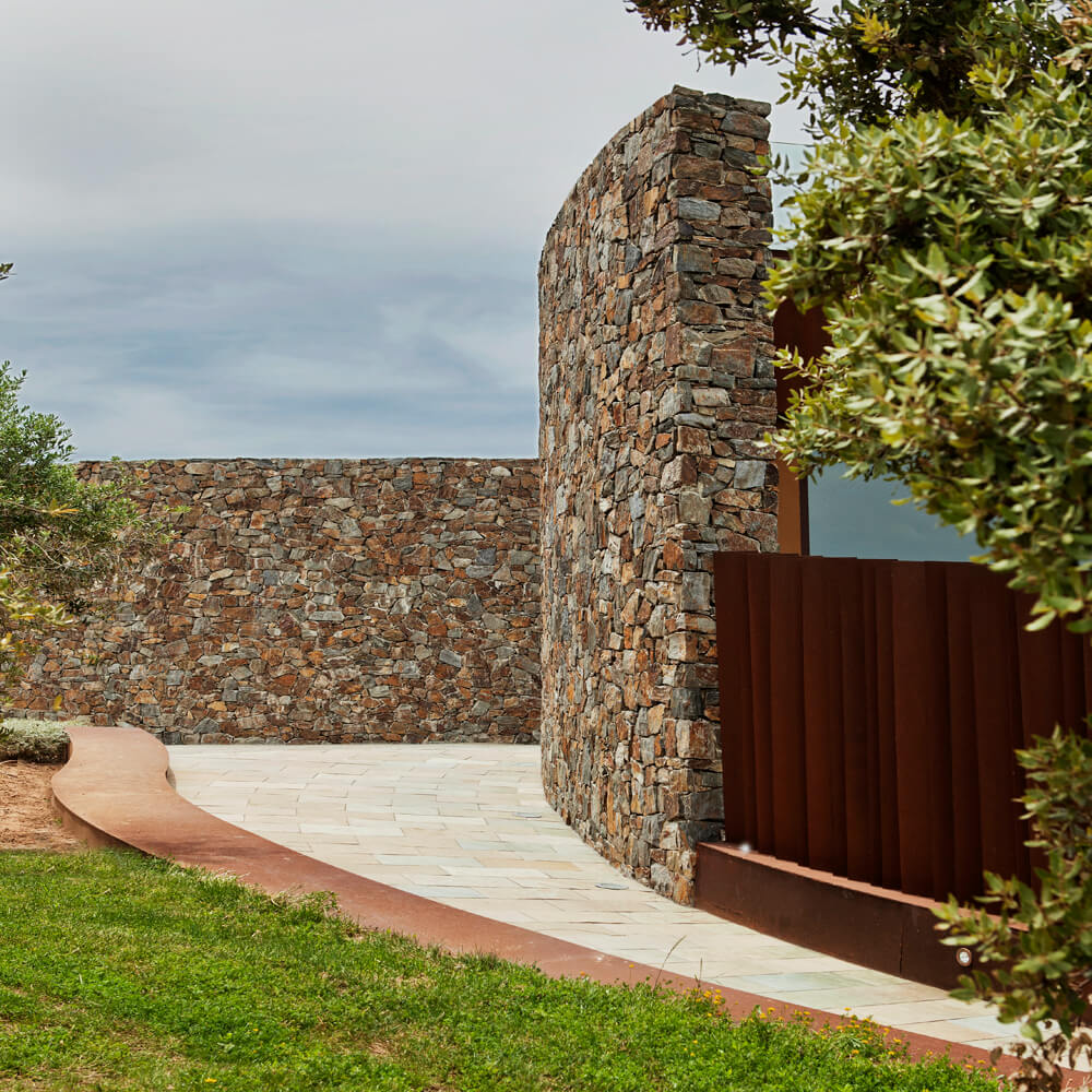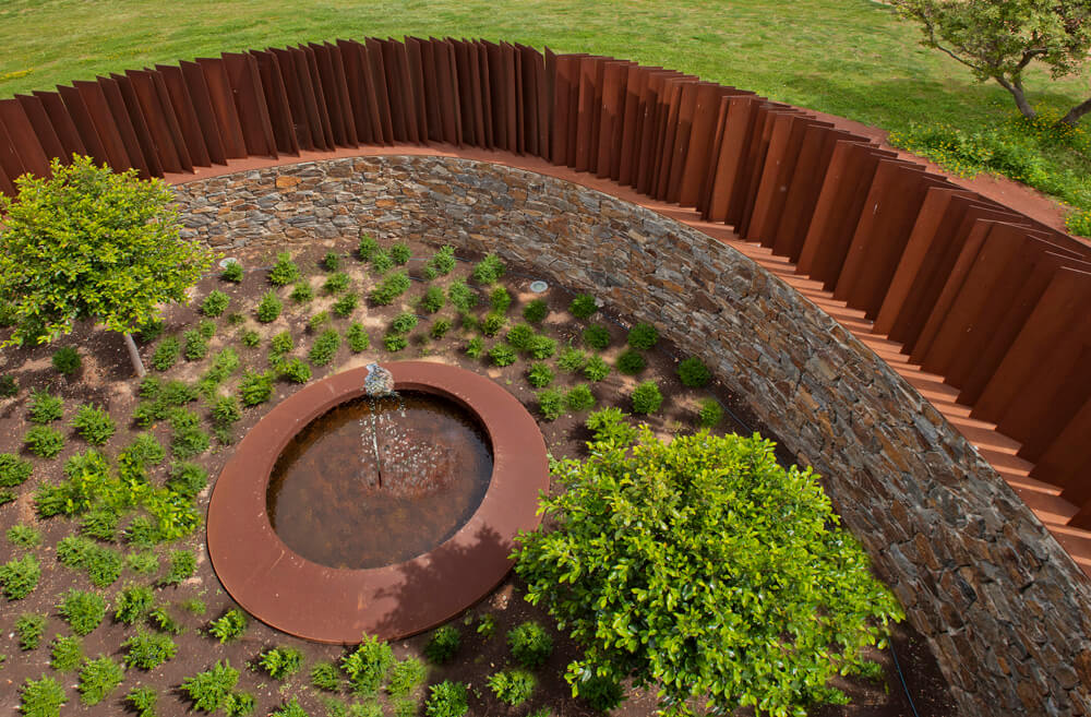 The use of stone, concrete, corten Steel and Wood establishes a relationship between the material,color and the setting.