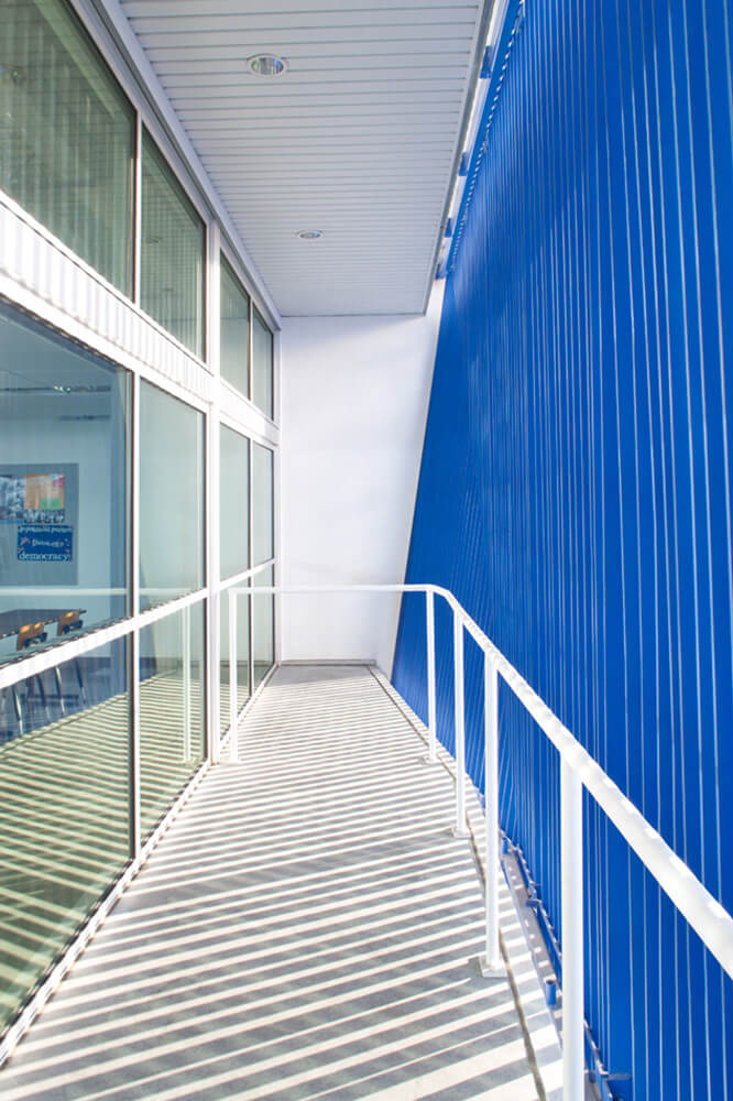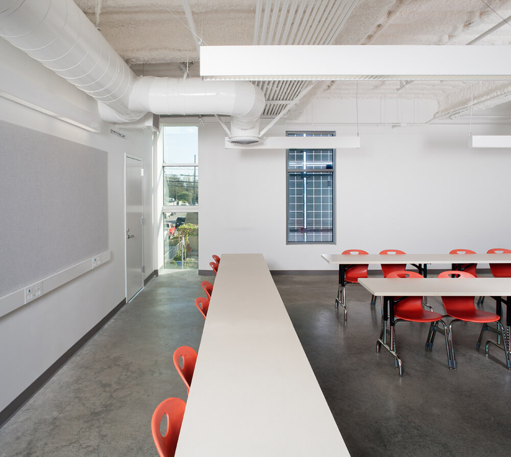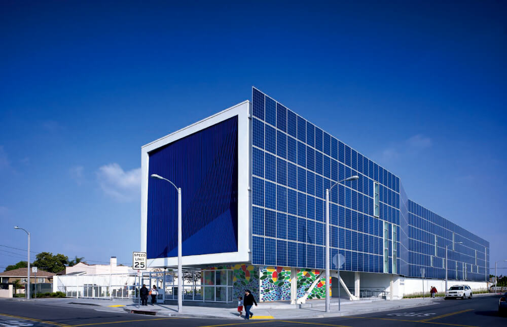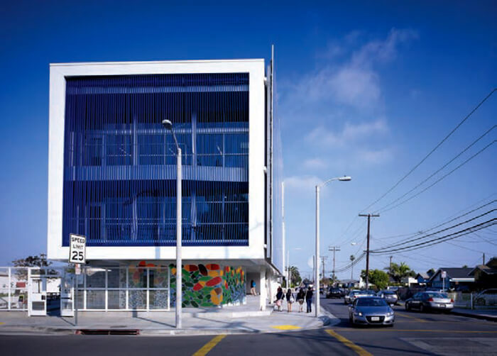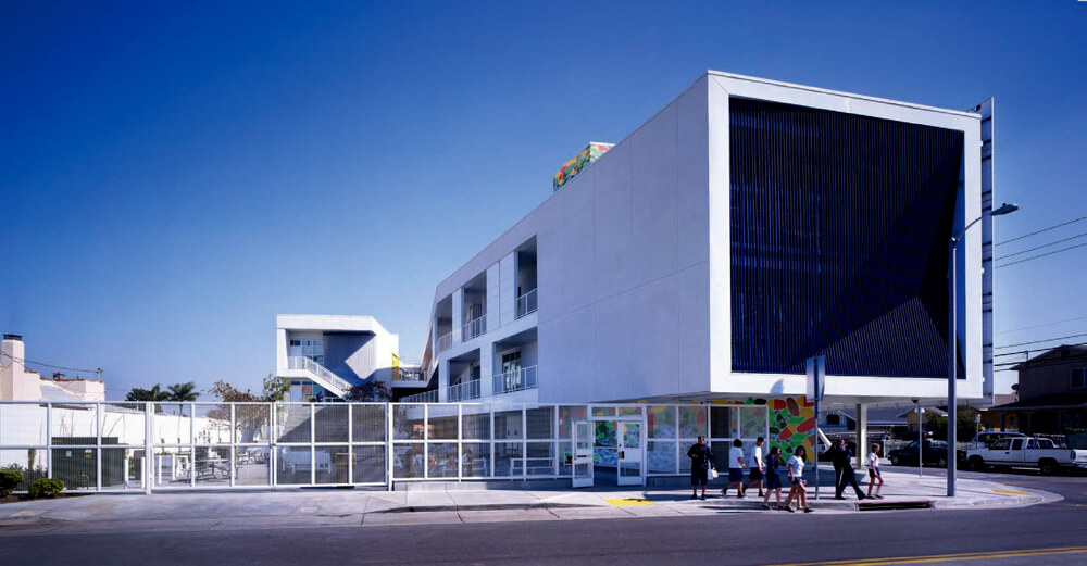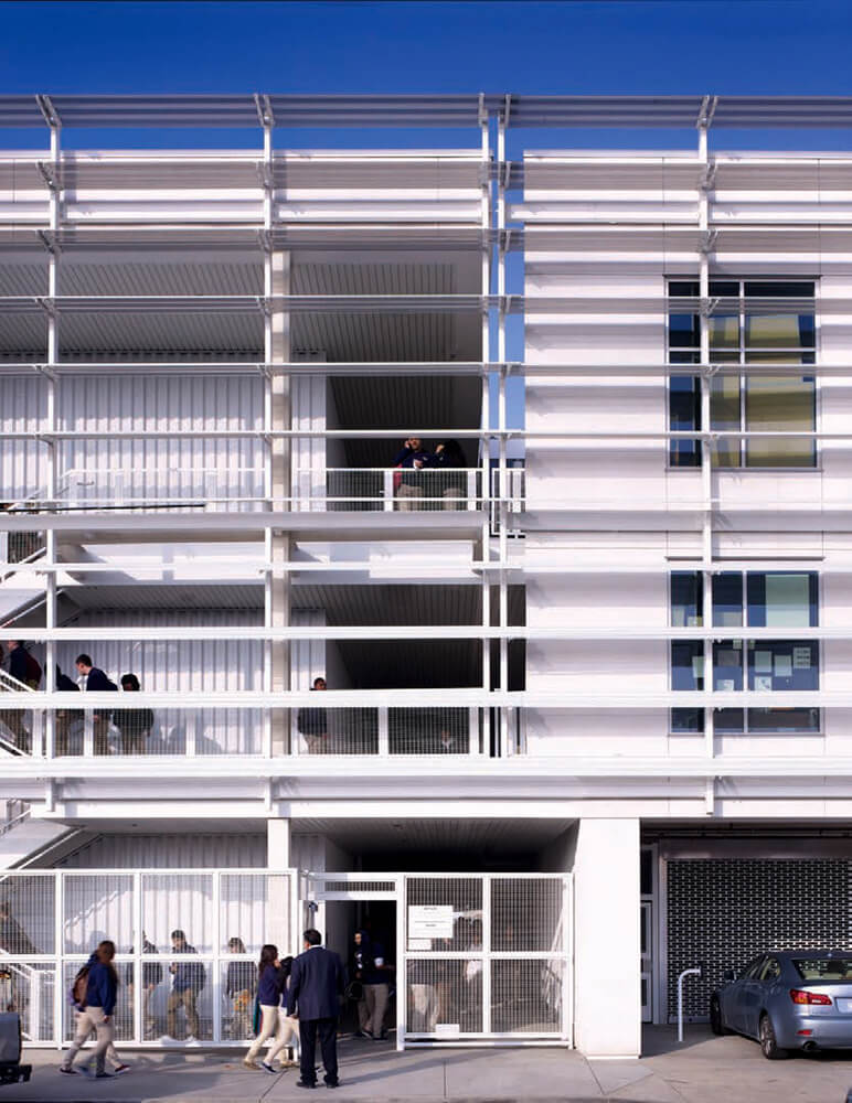 This new public school for 500 students is located in a tough South Los Angeles neighborhood almost directly under the flight path into LAX and adjacent to the very busy 105 Century freeway. The design was influenced by the New Orleans architects Curtis and Davis who designed and built many schools in the early 1950s in Louisiana. Their designs adapted to the harsh southern climate without using air conditioning, creating sustainable light filled and poetic spaces for kids to learn.