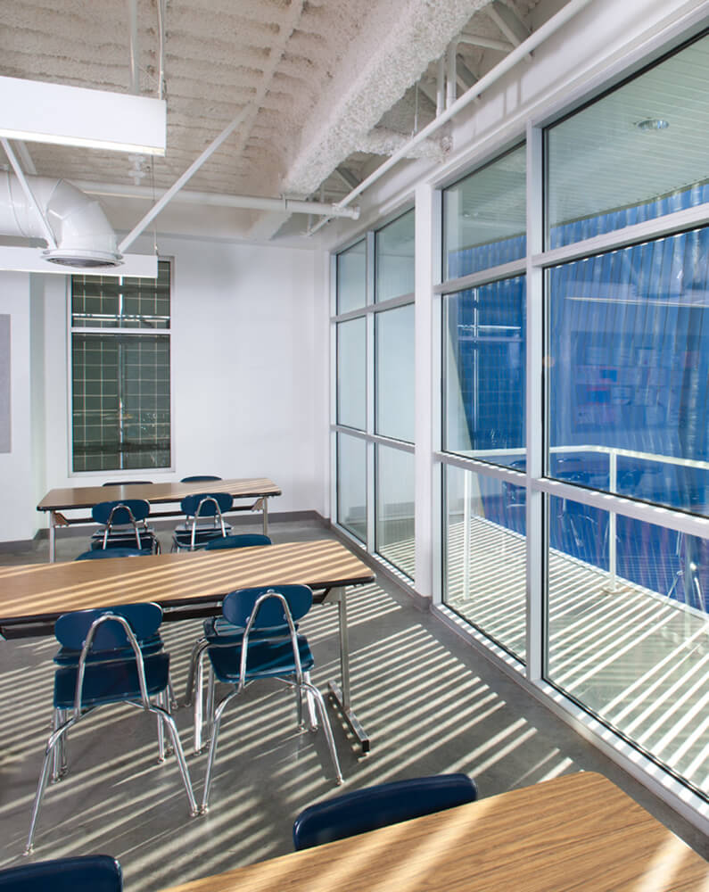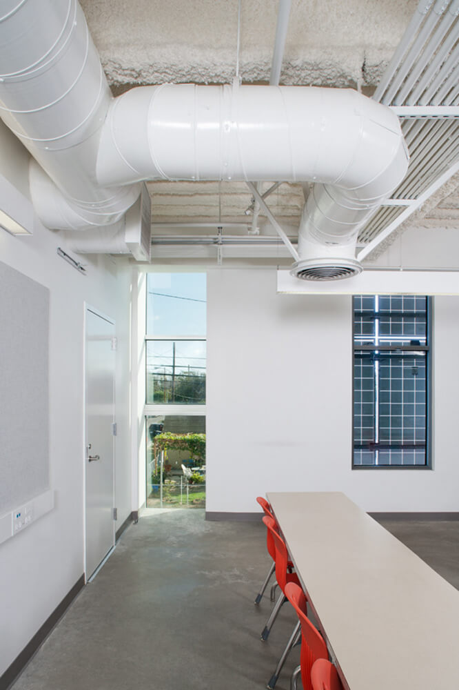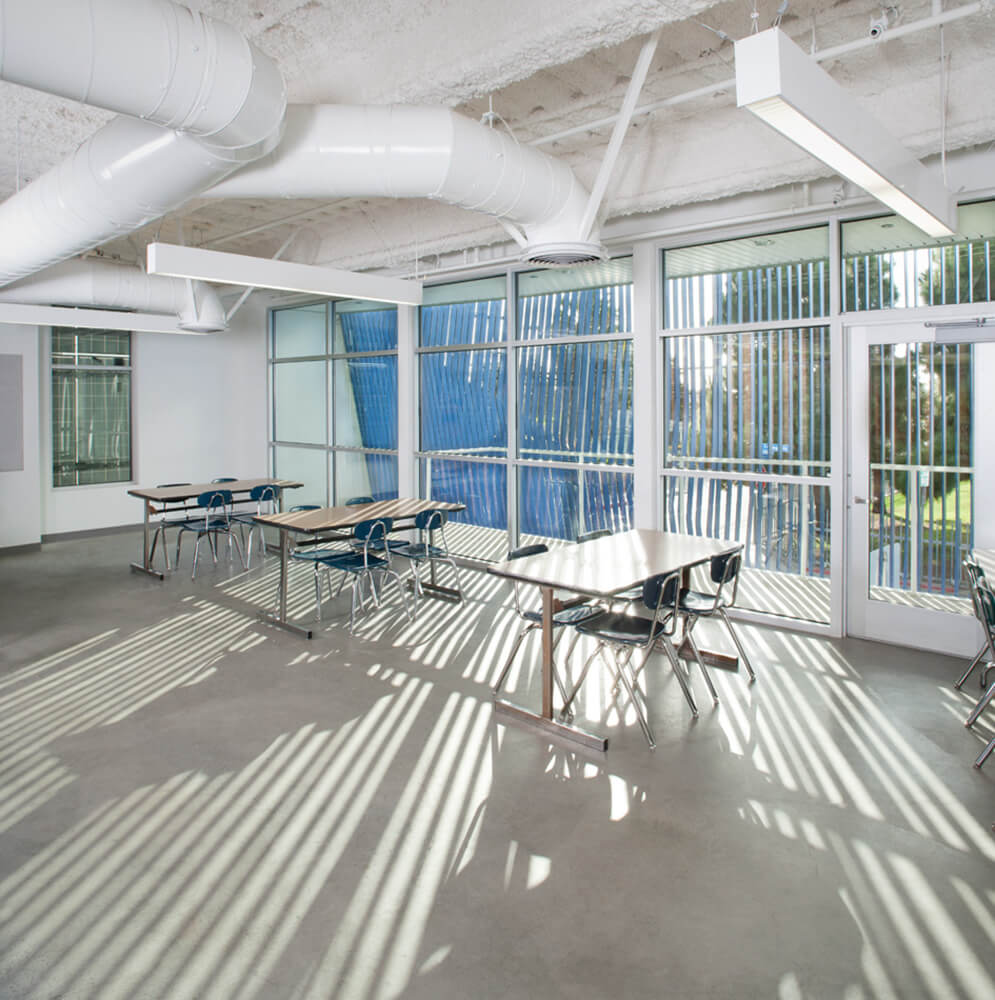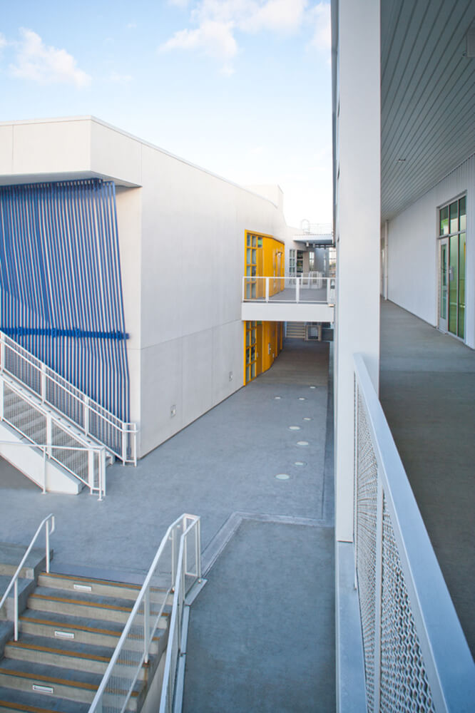 With a project certification under California High Performance Schools (CHPS) and possible LEED Certification; aesthetics, sustainability, and cost-effectiveness were considered in every design decision. Taking full advantage of the region’s temperate climate, the designers eschewed the fully contained “big box” idiom of conventional schools on the primary use site. Instead, a landscaped courtyard with multifunctional “bleacher” terracing flows into the open-air covered lobby and the multilayered paseo, lending the school the appeal of a collegiate campus and offering significant environmental benefits-improving day lighting and access to fresh air both inside and out-while providing substantial cost savings by limiting artificial lighting and thermal conditioning to the smaller enclosed spaces.