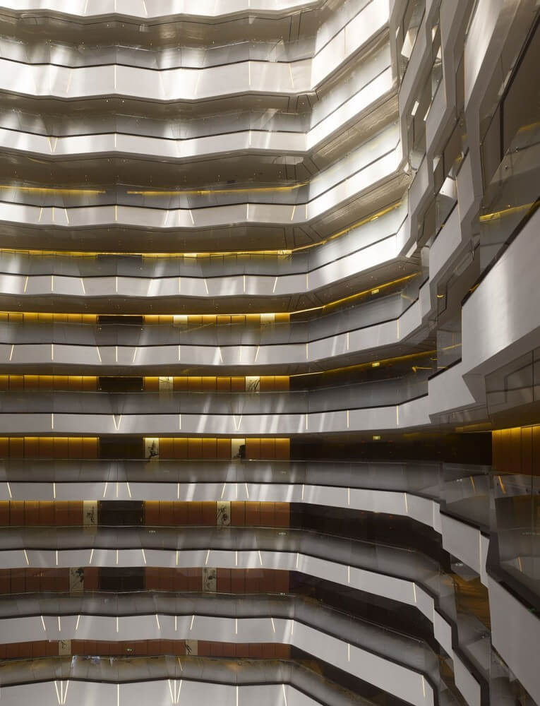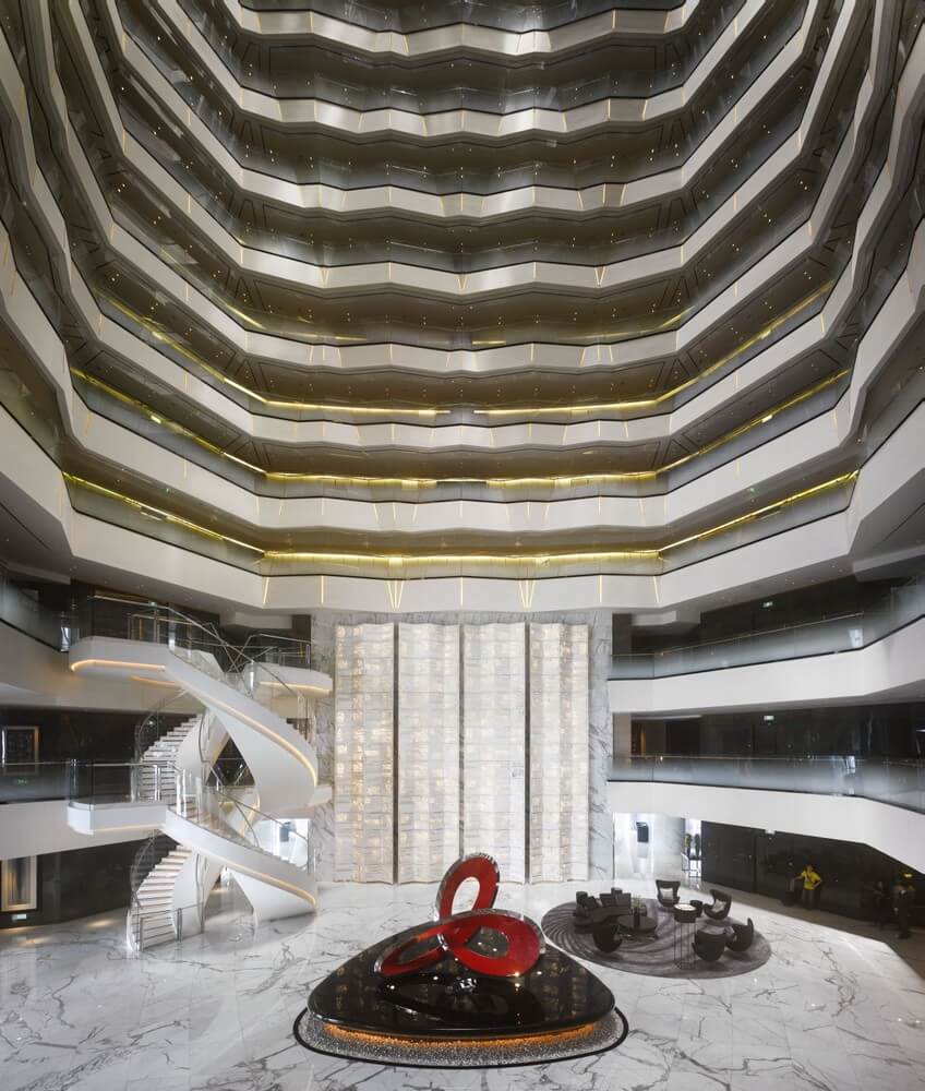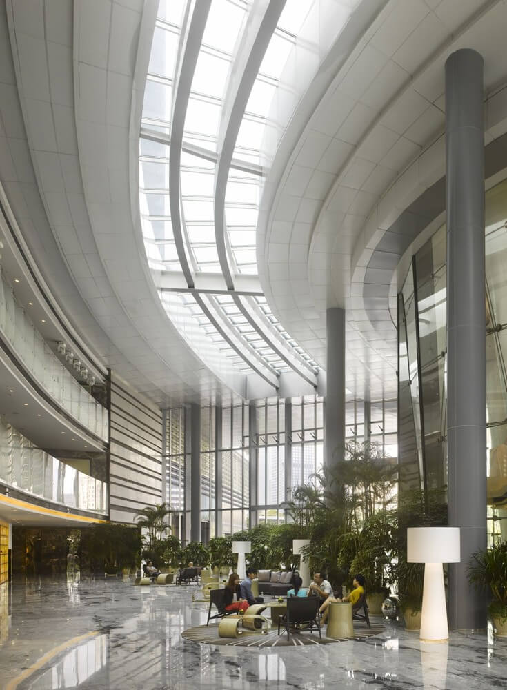 WilkinsonEyre won the first prize in an international design competition for this 440m tower in Guangzhou which is one of China’s tallest buildings. A mixture of uses including office space, a luxury Four Seasons hotel with a top floor high floor high end restaurant and bar consist this tower with 103 storeys. A luxury brand retail mall, conference centre and high quality serviced apartments are contained in a substantial podium complex connected to the tower at ground level. Retail spaces and a transport hub, with a retail loop encouraging connections underneath to a landscaped central axis are added with the connection of the tower and podium below ground.