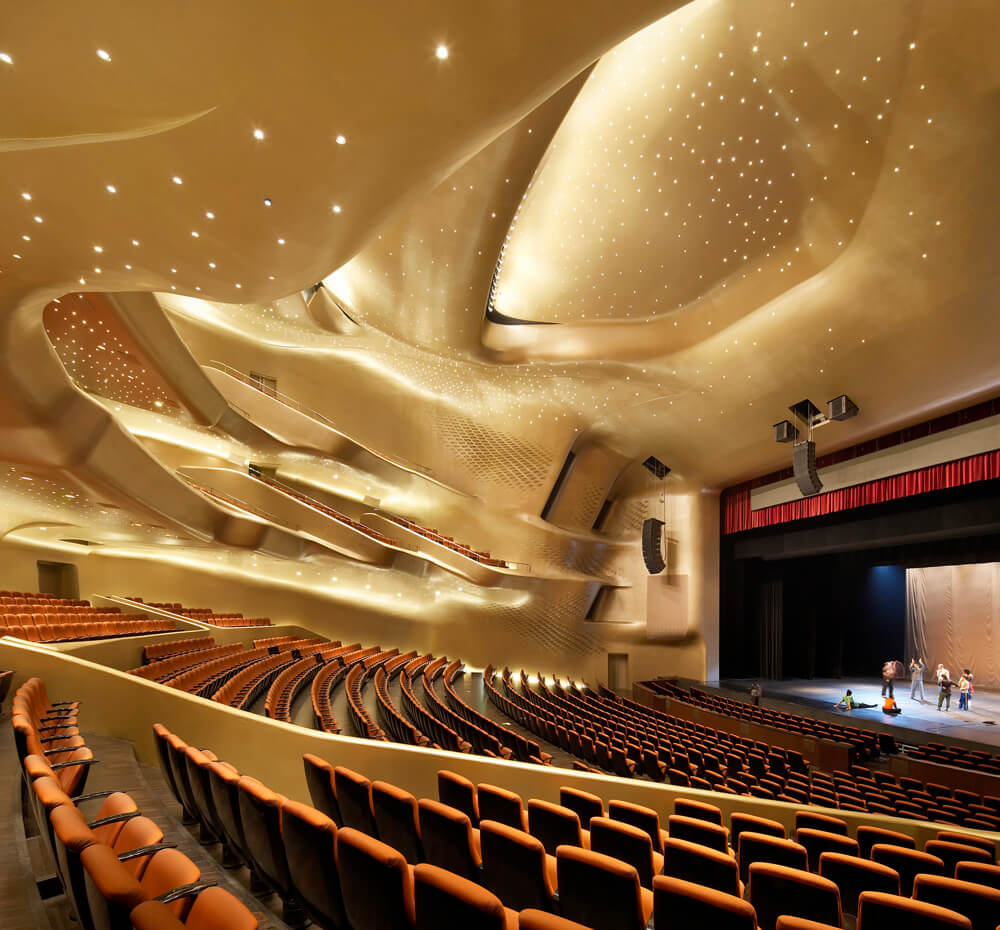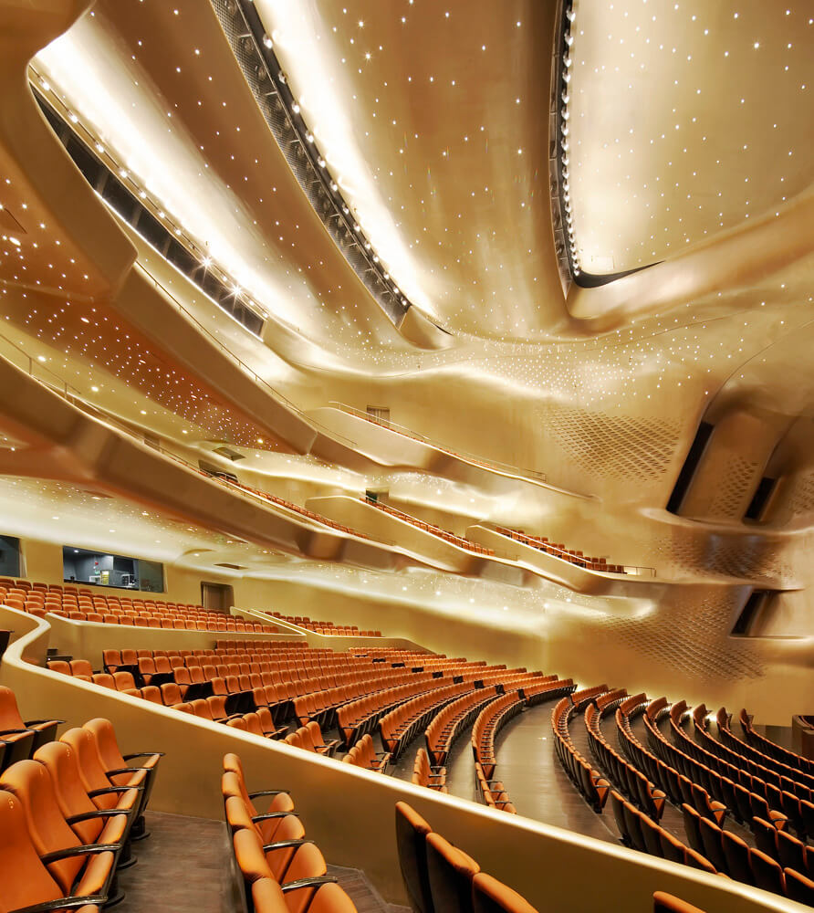 Territories and zones within the Opera House are defined by fold lines in this landscape, cutting dramatic interior and exterior canyons for circulation, lobbies and cafes. They also allow natural light to penetrate deep into the building. This landscape analogy is continued by smooth transitions between disparate elements and different levels. Custom molded glass-fiber reinforced gypsum (GFRC) units have been used for the interior of the auditorium to continue the architectural language of fluidity and seamlessness.