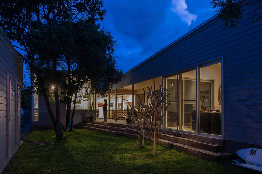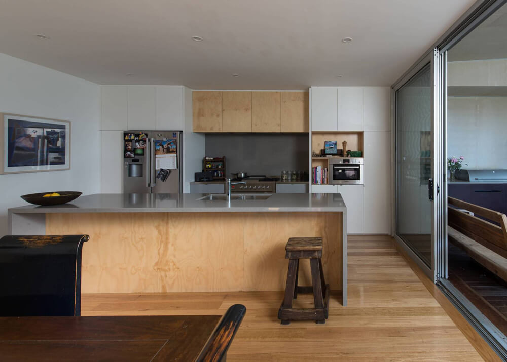The new addition pitches up to the North and new large glazed openings admit winter sun as well as provide good flow through ventilation. The roofed deck is an additional living space, with wide steps down to the garden. On the western side of the deck, services such as bbq, laundry and storage are located behind form ply doors. A surf shower (supplied direct from the water tanks) is located off the Northern end of the building.